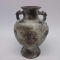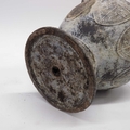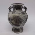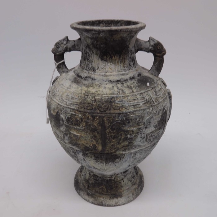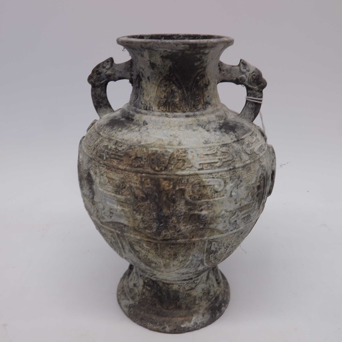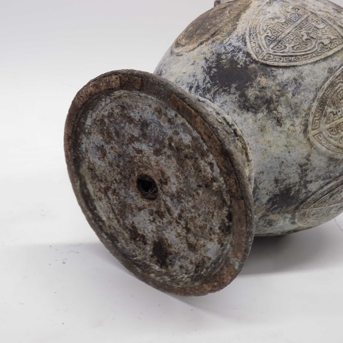 An Archaistic style cast metal footed vase, twin handled baluster form, decorated with moulded shields and script, 29cm high