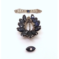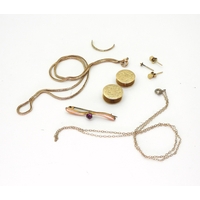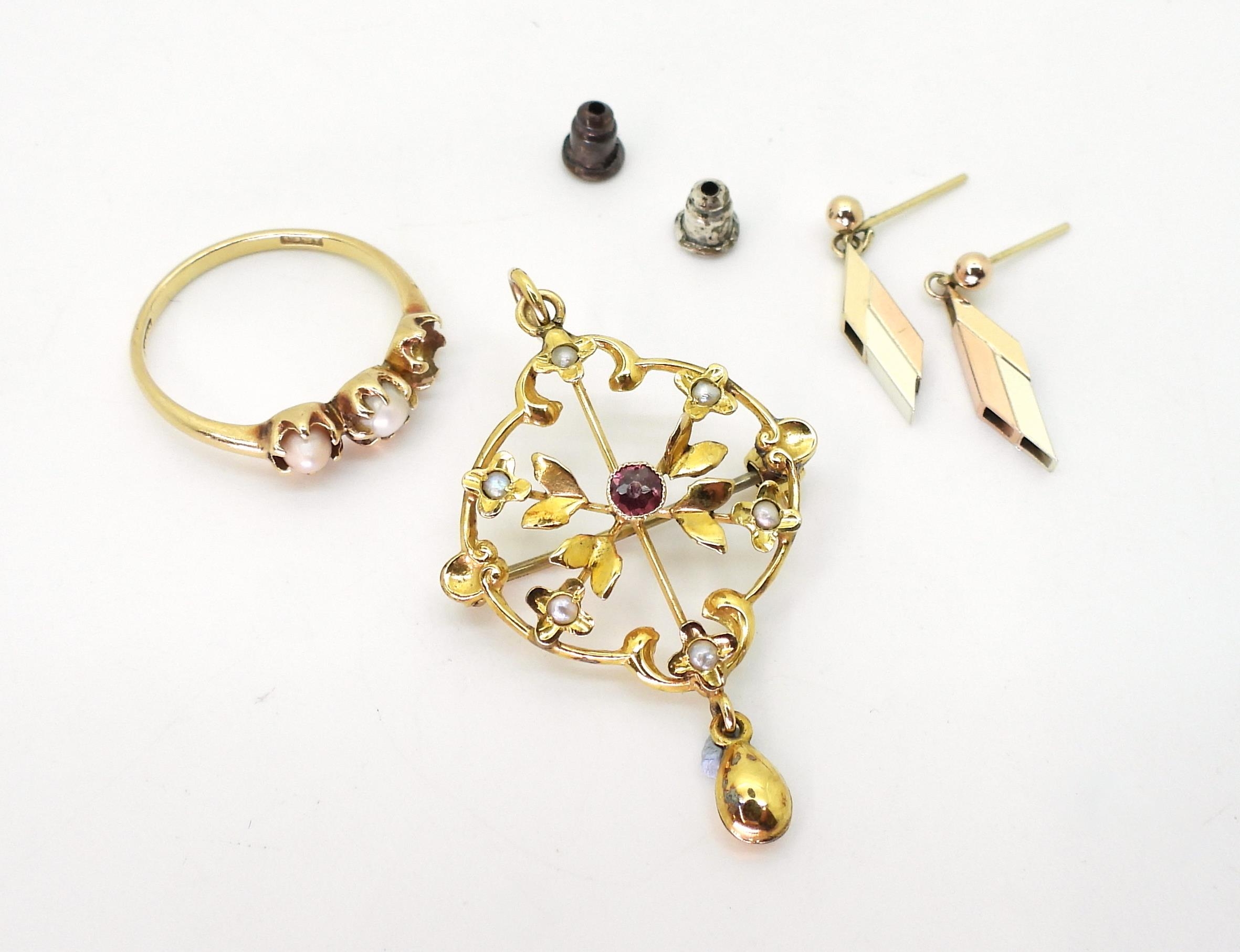 A 9ct gold Edwardian pendant brooch set with seed pearls and a pink gem, length 4.2cm, and a pair of earrings weight together 3.9gms, together with an 18ct gold pearl ring, (one pearl missing) weight 2.4cm