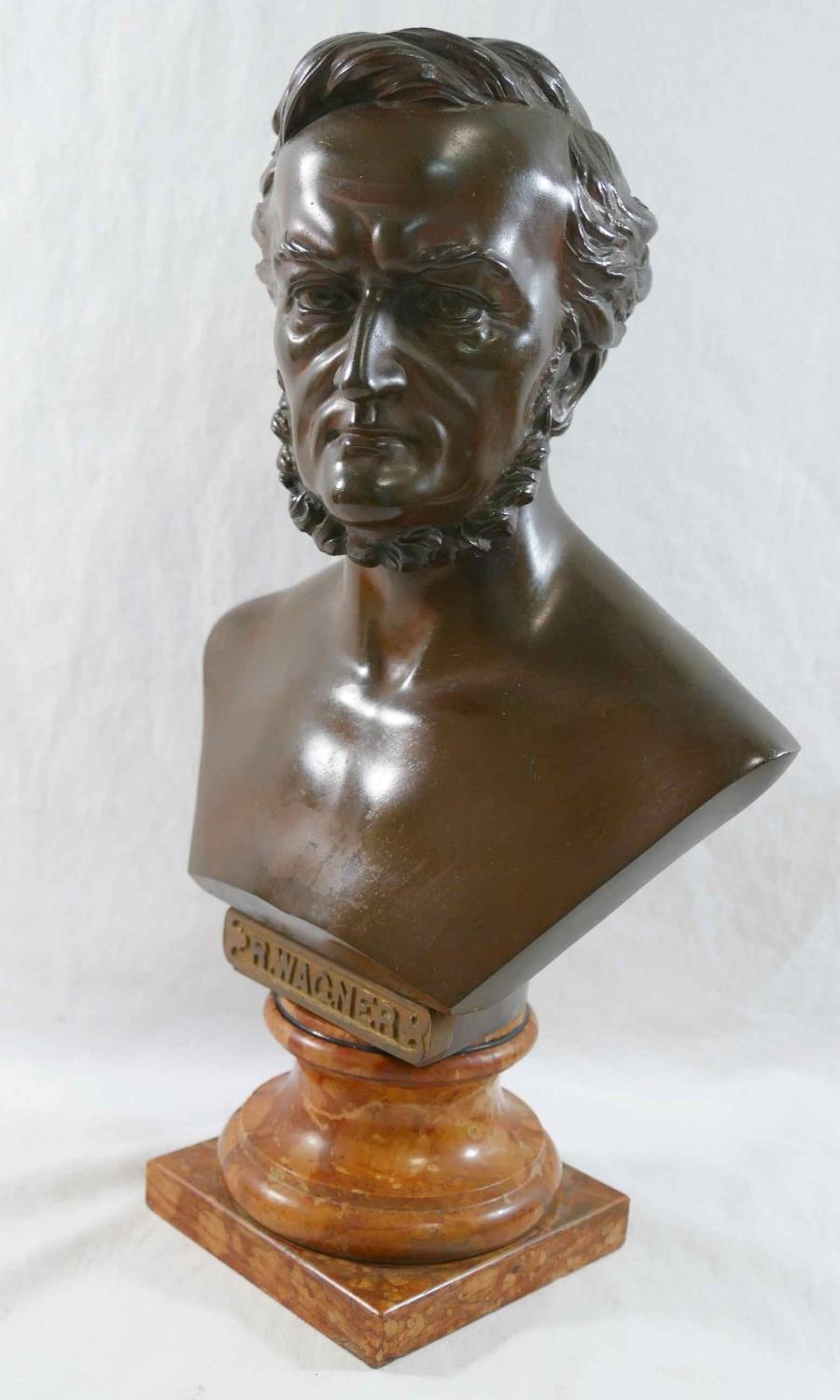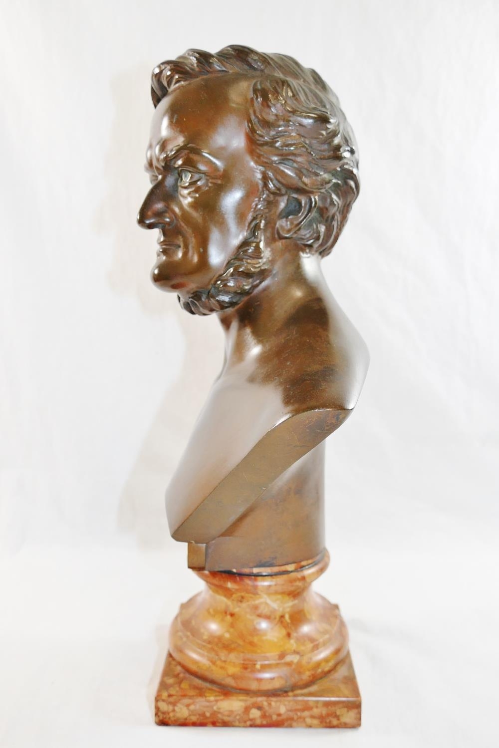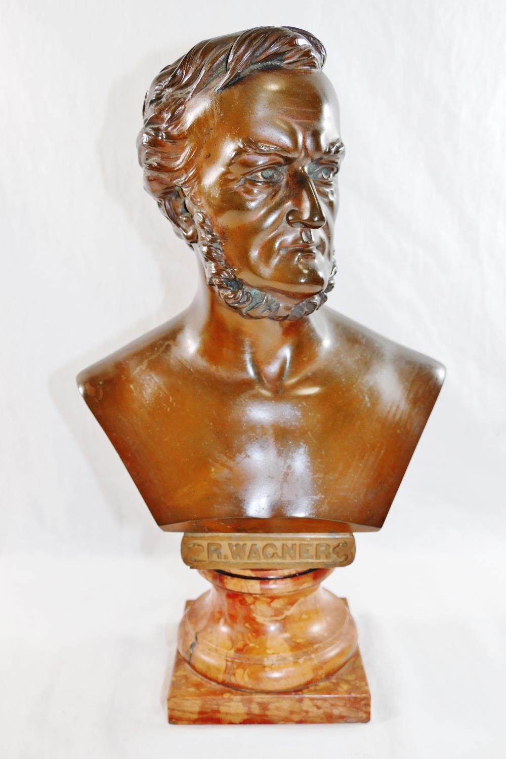 A bust of Richard Wagner, bronze, with bare chest on turned marble socle, unsigned, 36cm high