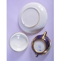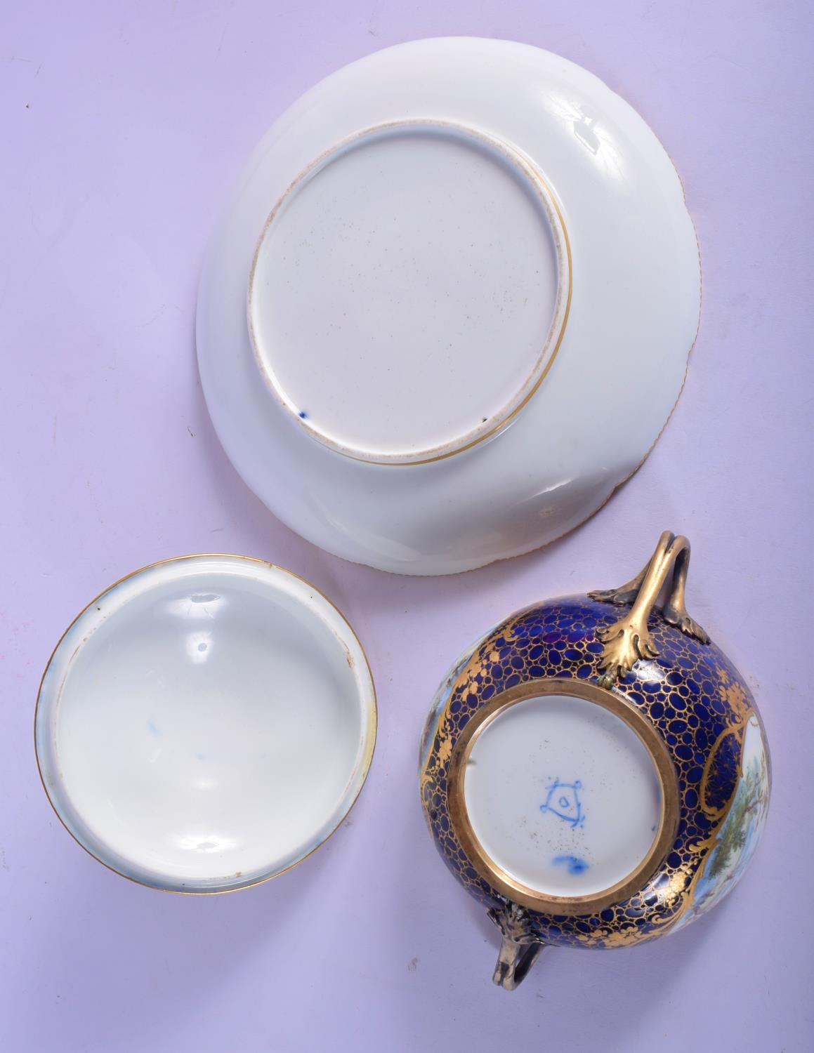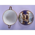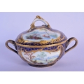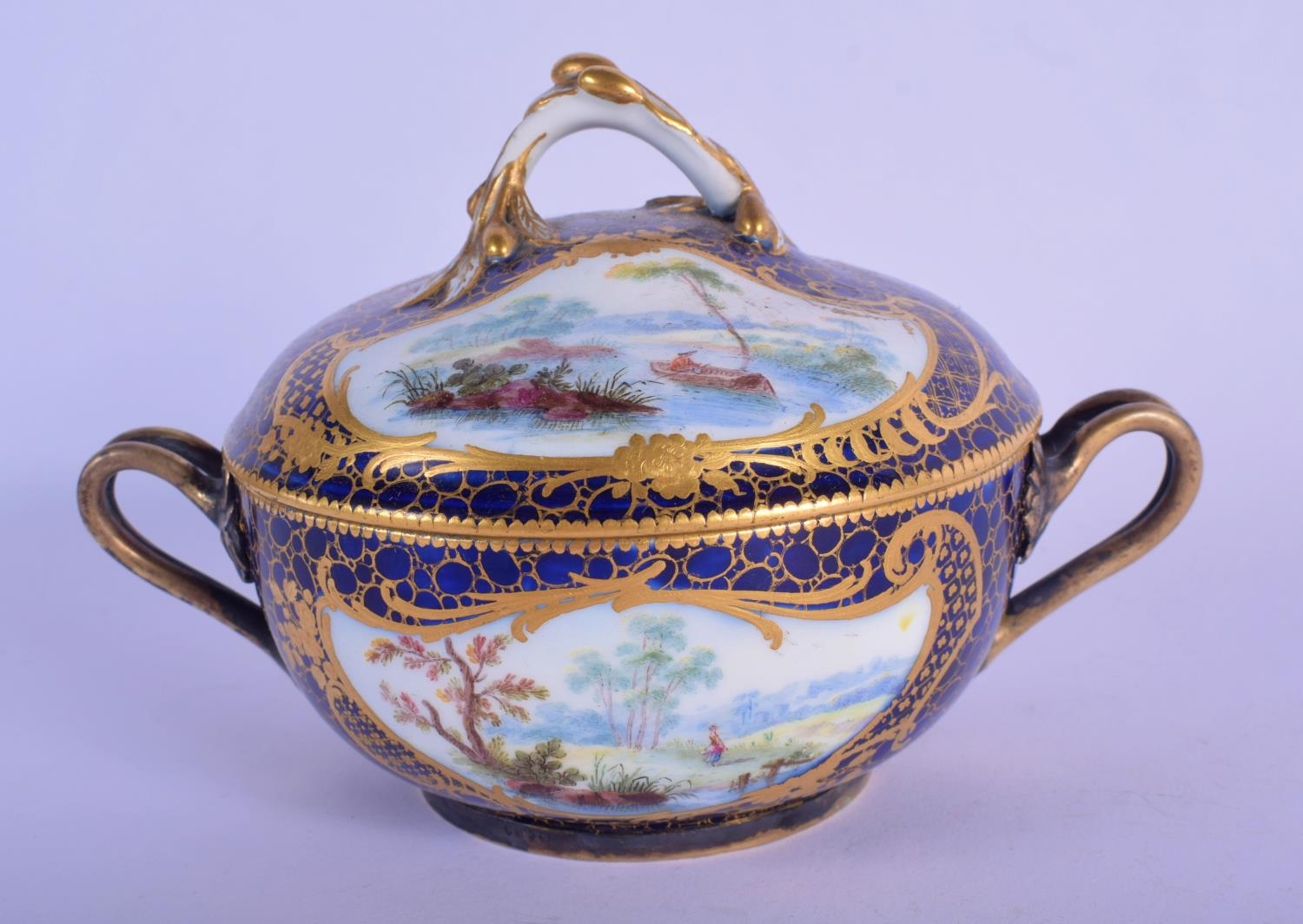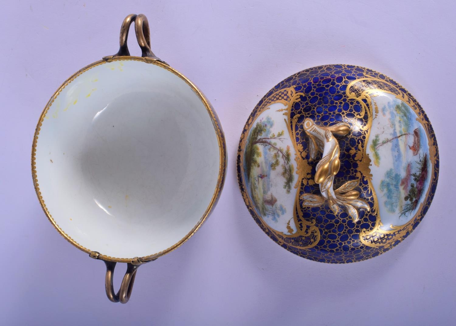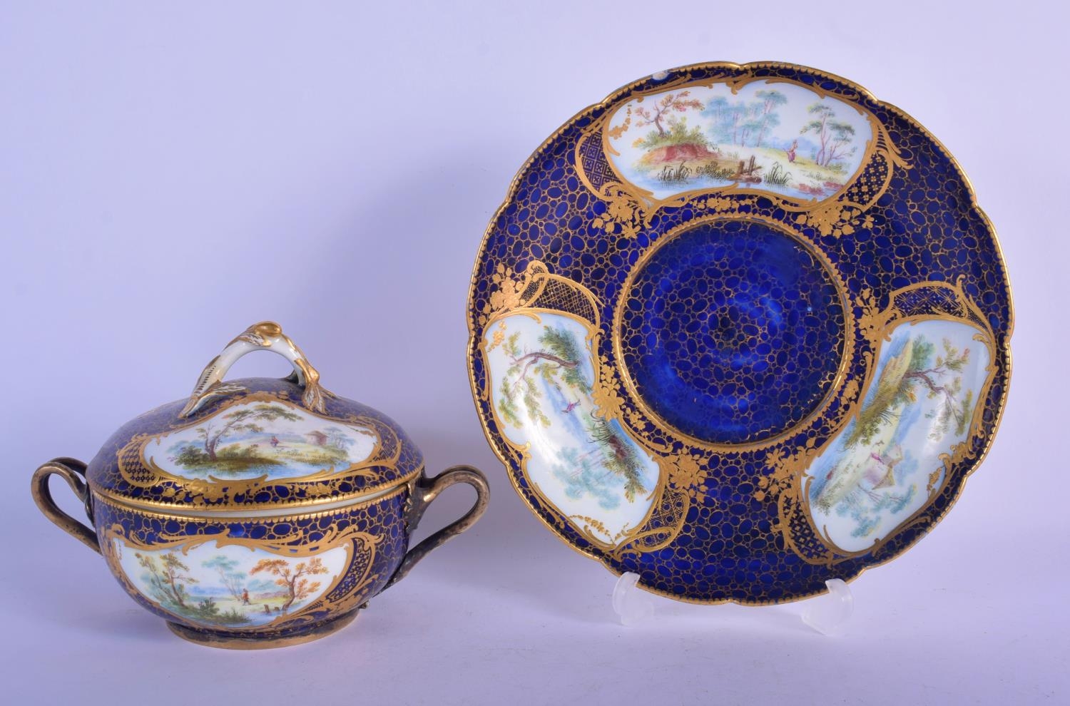 18th c. Sevres ecuelle, cover and stand finely painted with landscape in shaped cartouches surround by a giled cracked ice and blue ground. 22cm Diameter (2)