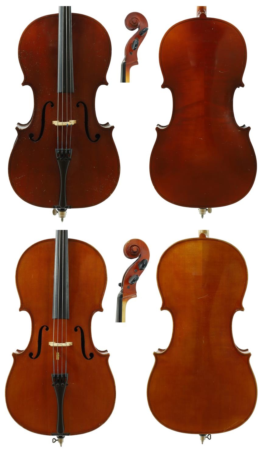 Modern German half size violoncello labelled Hans Wagner, mod. nr. 420, 1974, 25 3/4", 65.40cm, soft case; also another modern German half size violoncello, 25 3/4", 65.40cm, soft case (2)