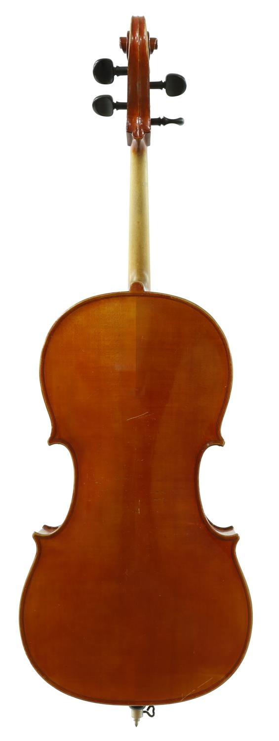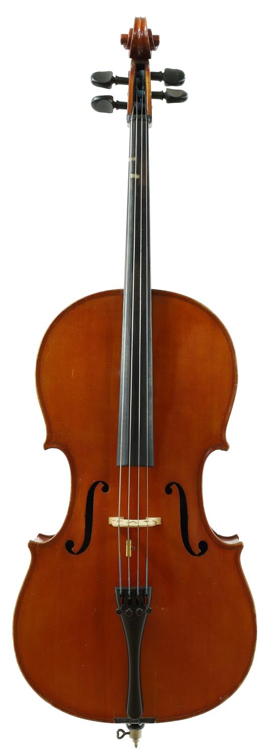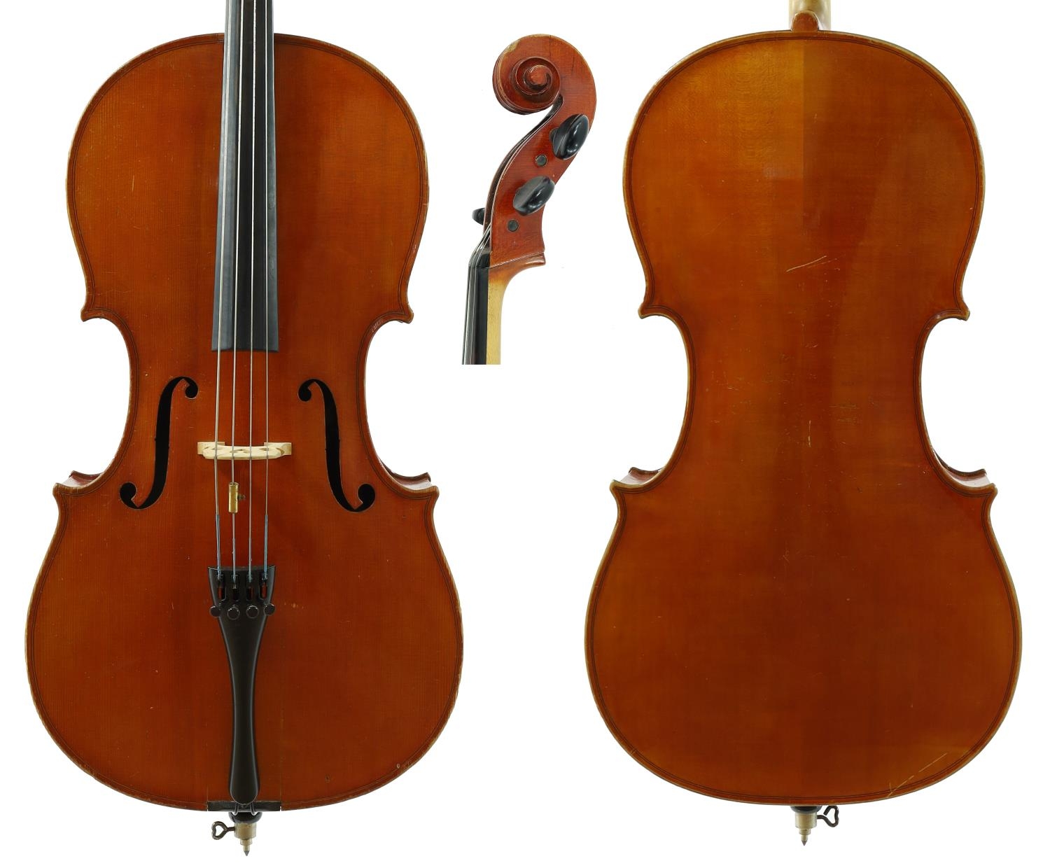 Orange varnished cello; long crack running up from the saddle on the table treble side and other minor cosmetic issues.