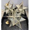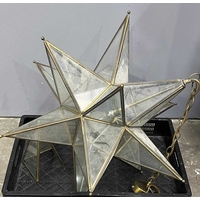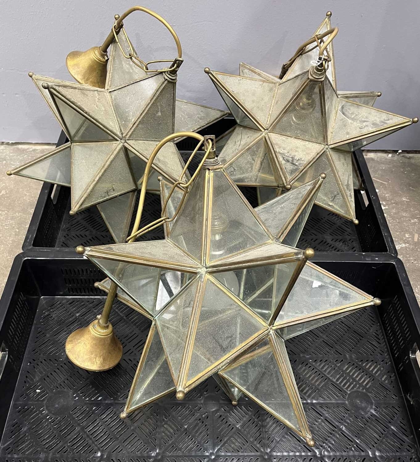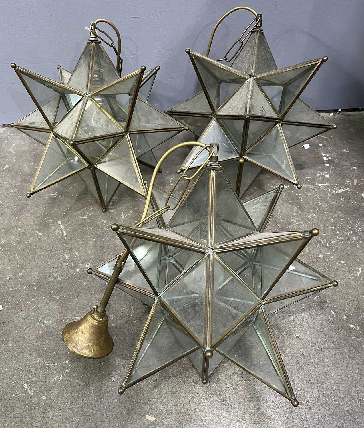 Three star-form glass and brass pendant lights, h: 70cm, w: 37cm (3) Provenance: from the collections of two prominent Anglo-Irish and British aristocratic families, directly descended from Lord Patrick James Stuart (1794- 1859), brother of John 2nd Marquess of Bute and great grandson of John Stuart, 3rd Earl of Bute (1713 -1792), Prime Minister to George III, resident at Cardiff Castle, Wales; Dumfries House, Scotland and Wilton Crescent, Belgravia, London