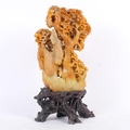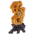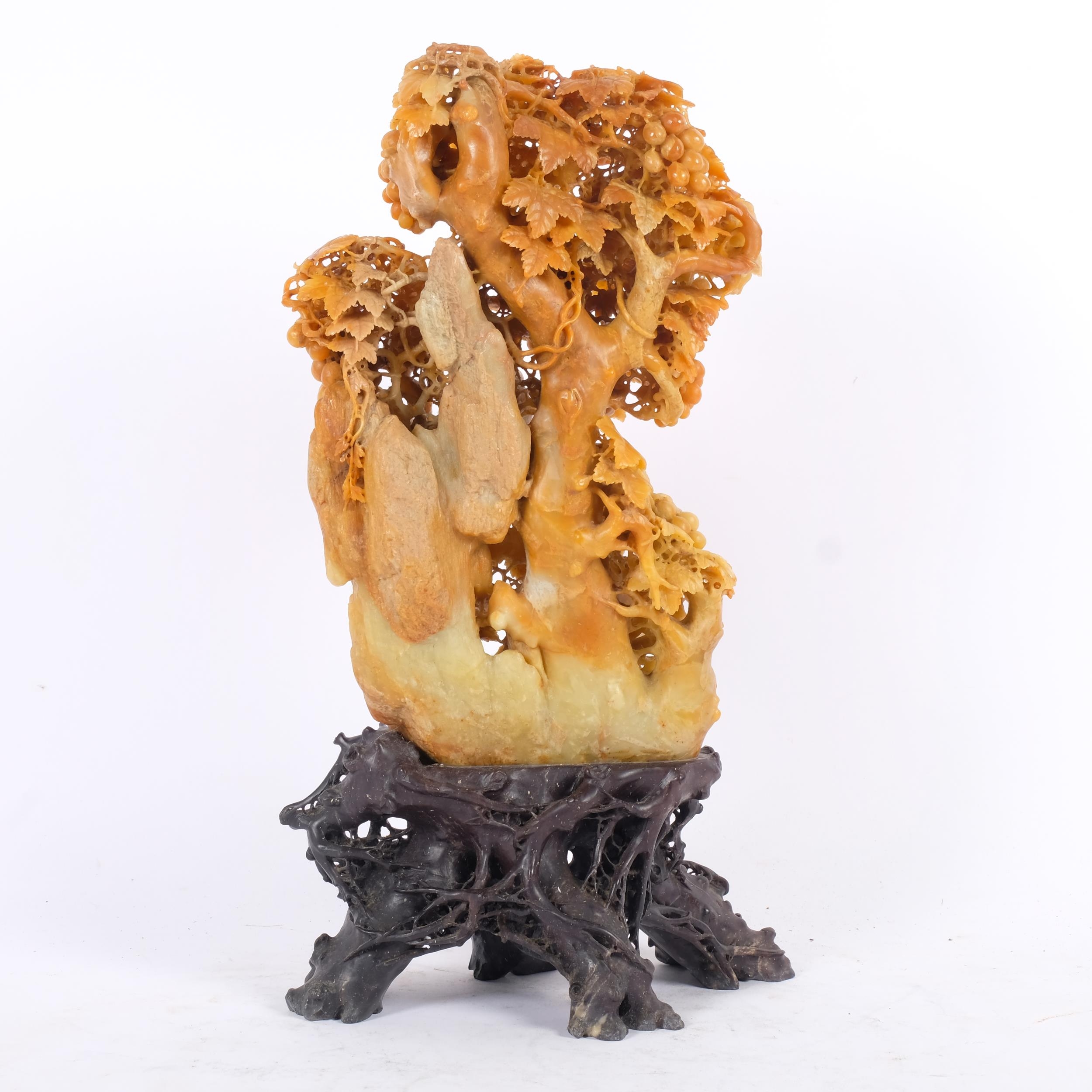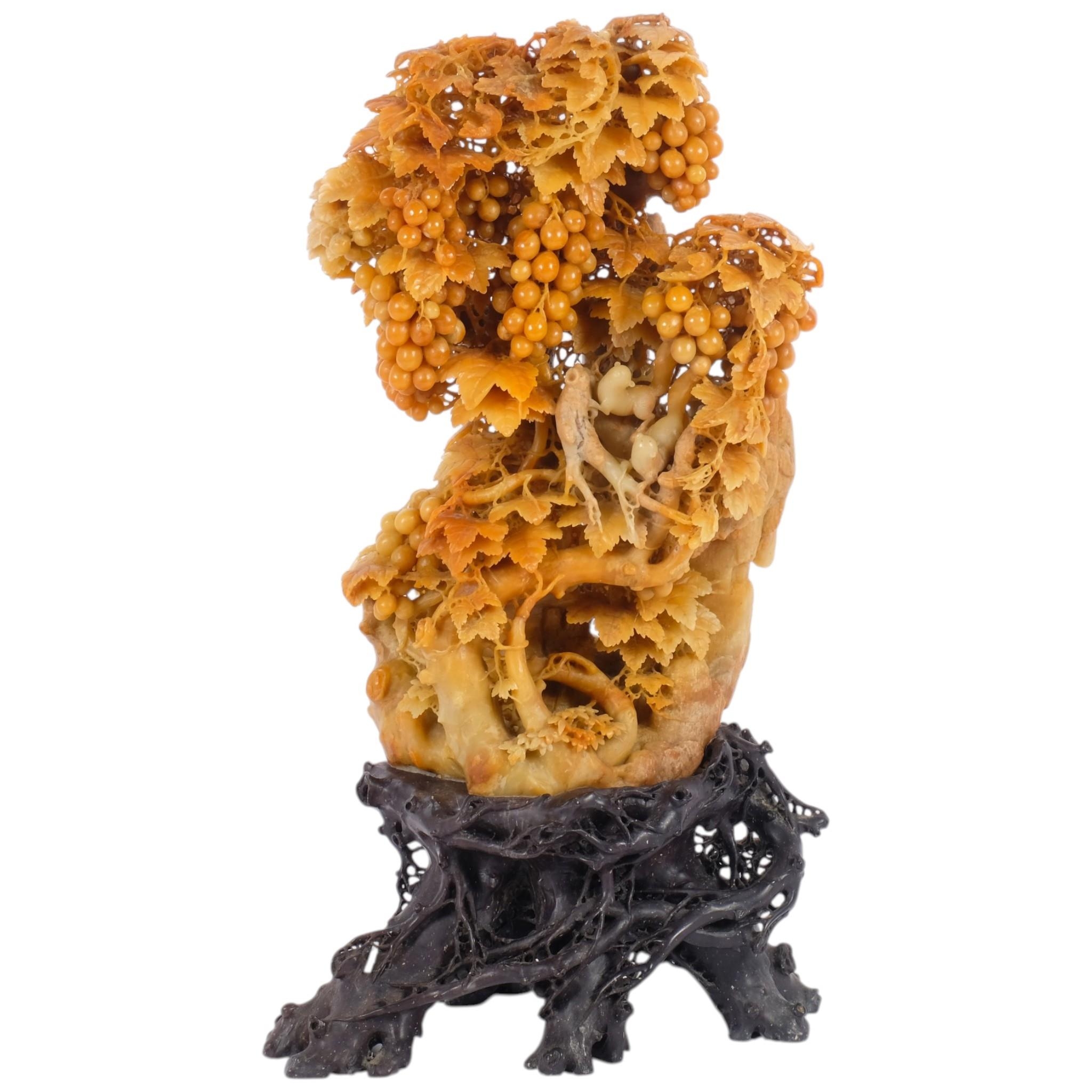 An intricately carved Chinse soapstone sculpture, depicting squirrels among grapevines, mounted on naturalistic carved soapstone base, H35cm