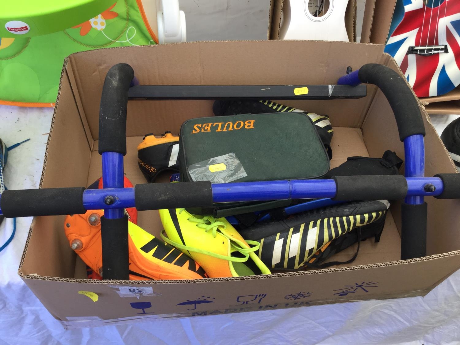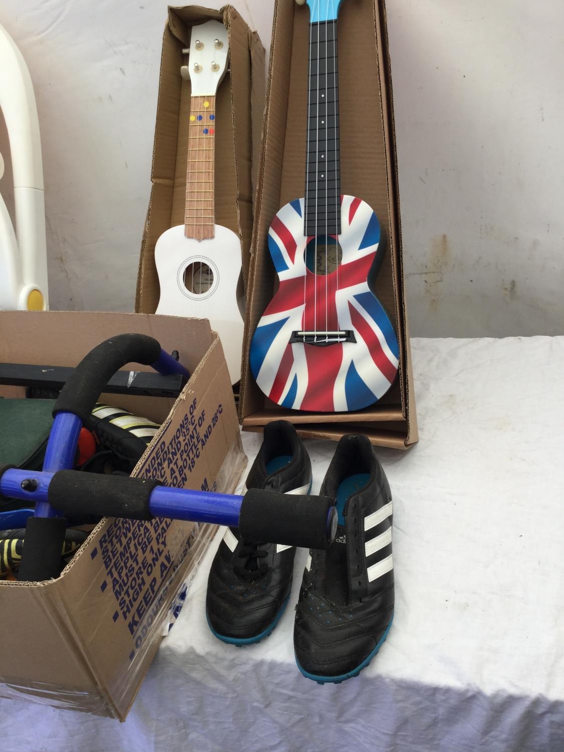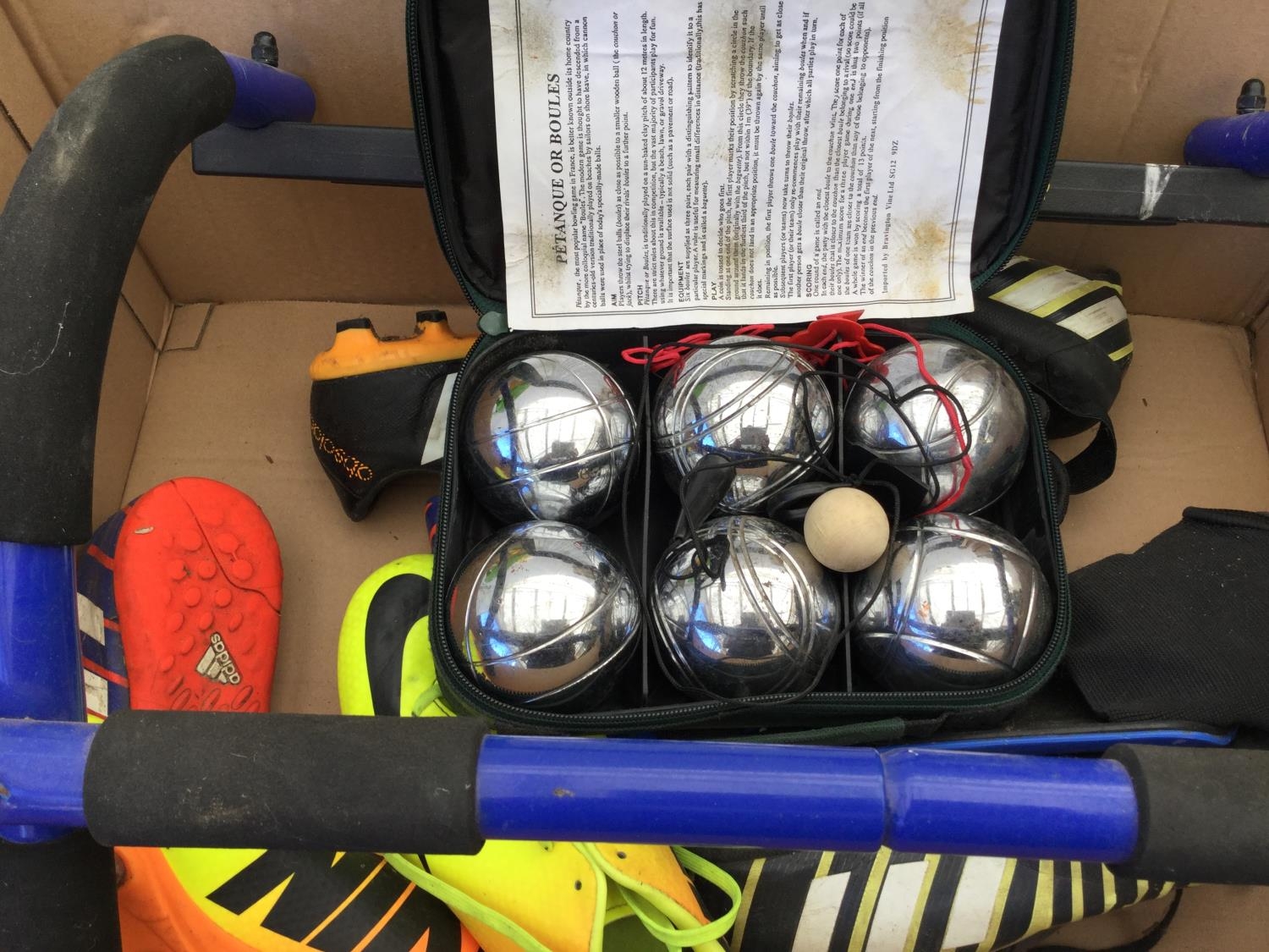 BOX OF FOOTBALL BOOTS, TOY GUITARS, CHILDS SEAT AND BOULES
