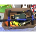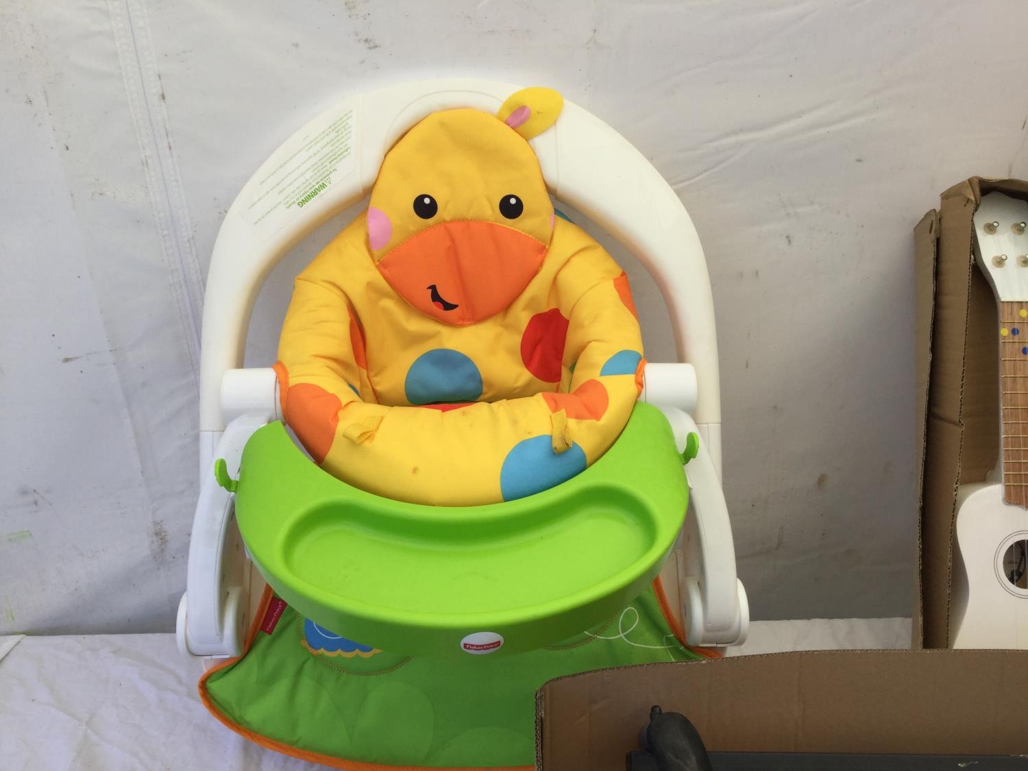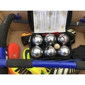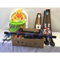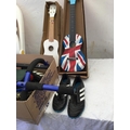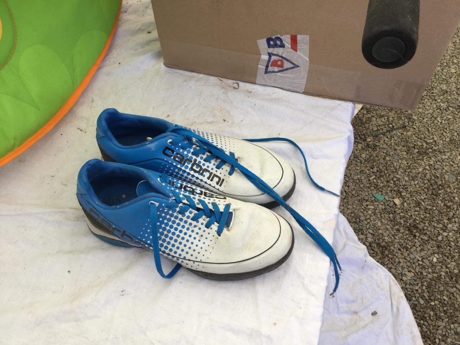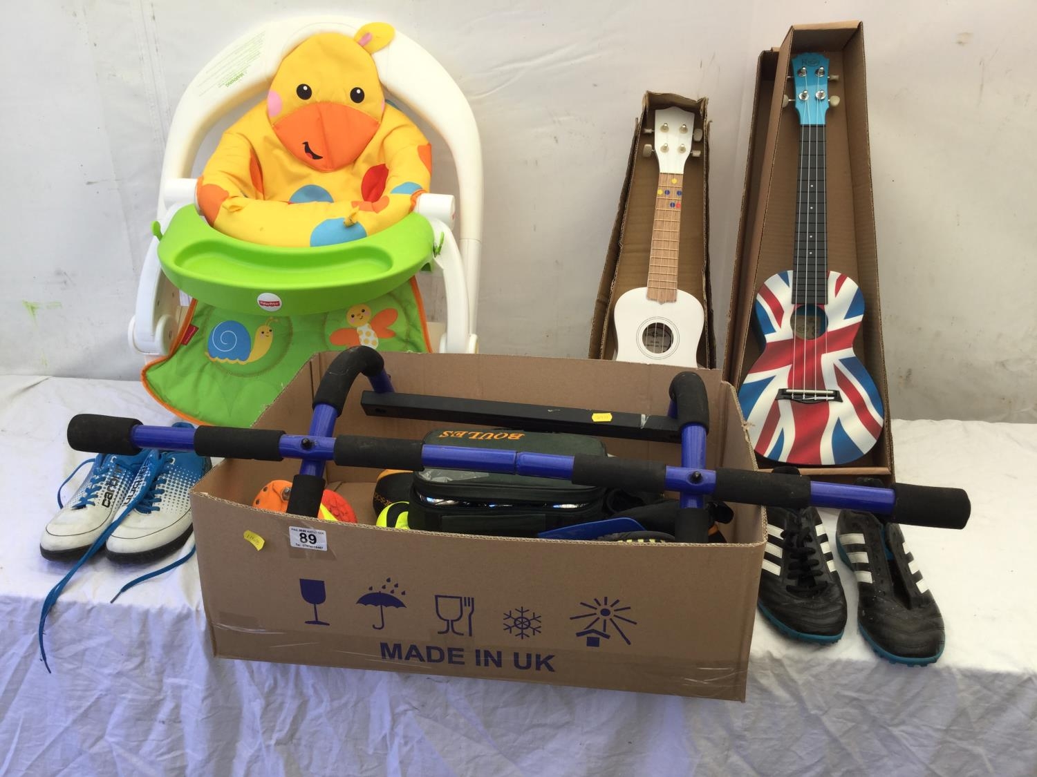 BOX OF FOOTBALL BOOTS, TOY GUITARS, CHILDS SEAT AND BOULES
