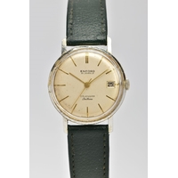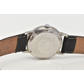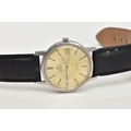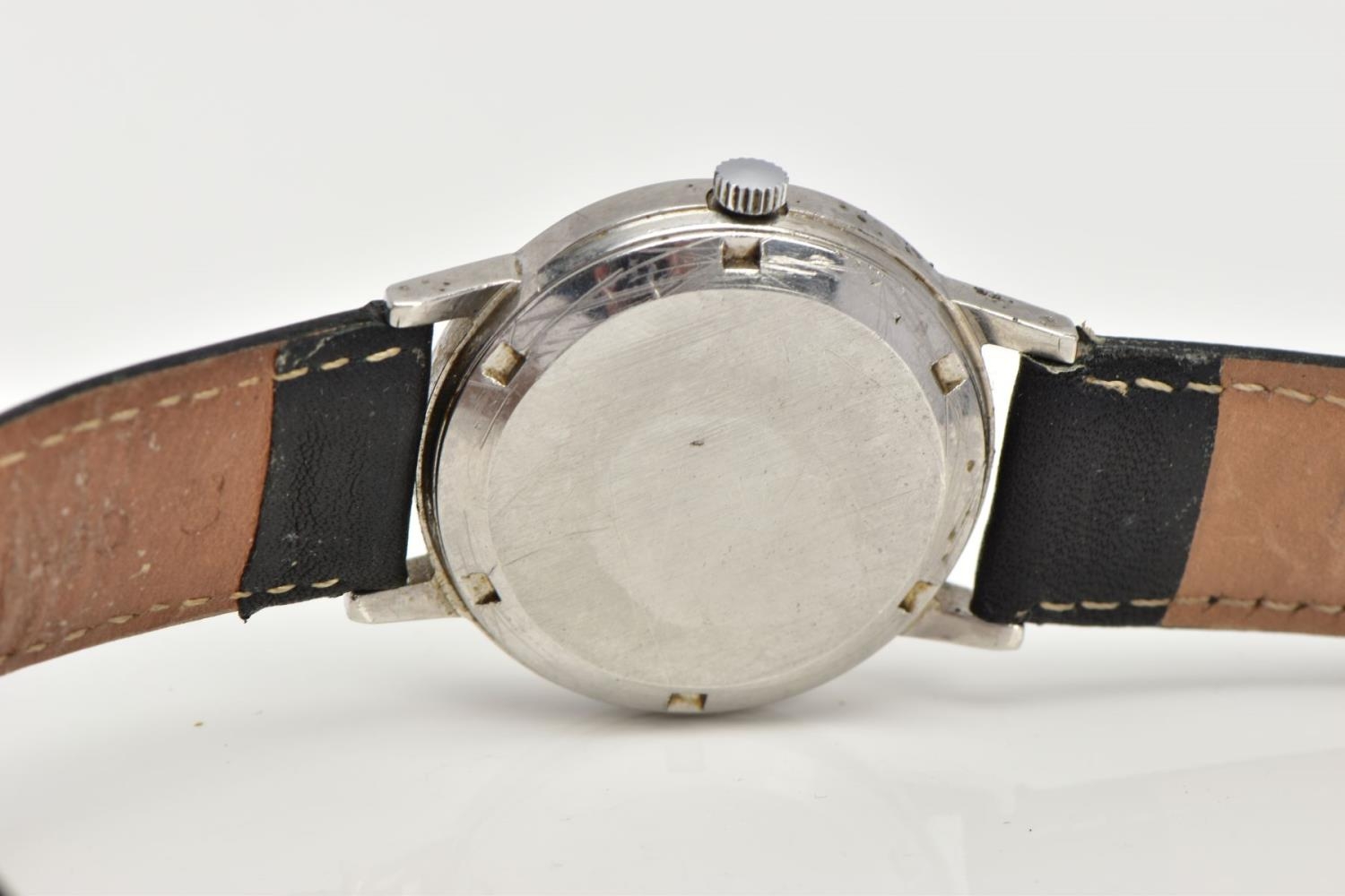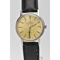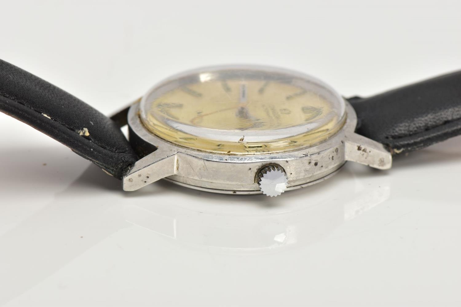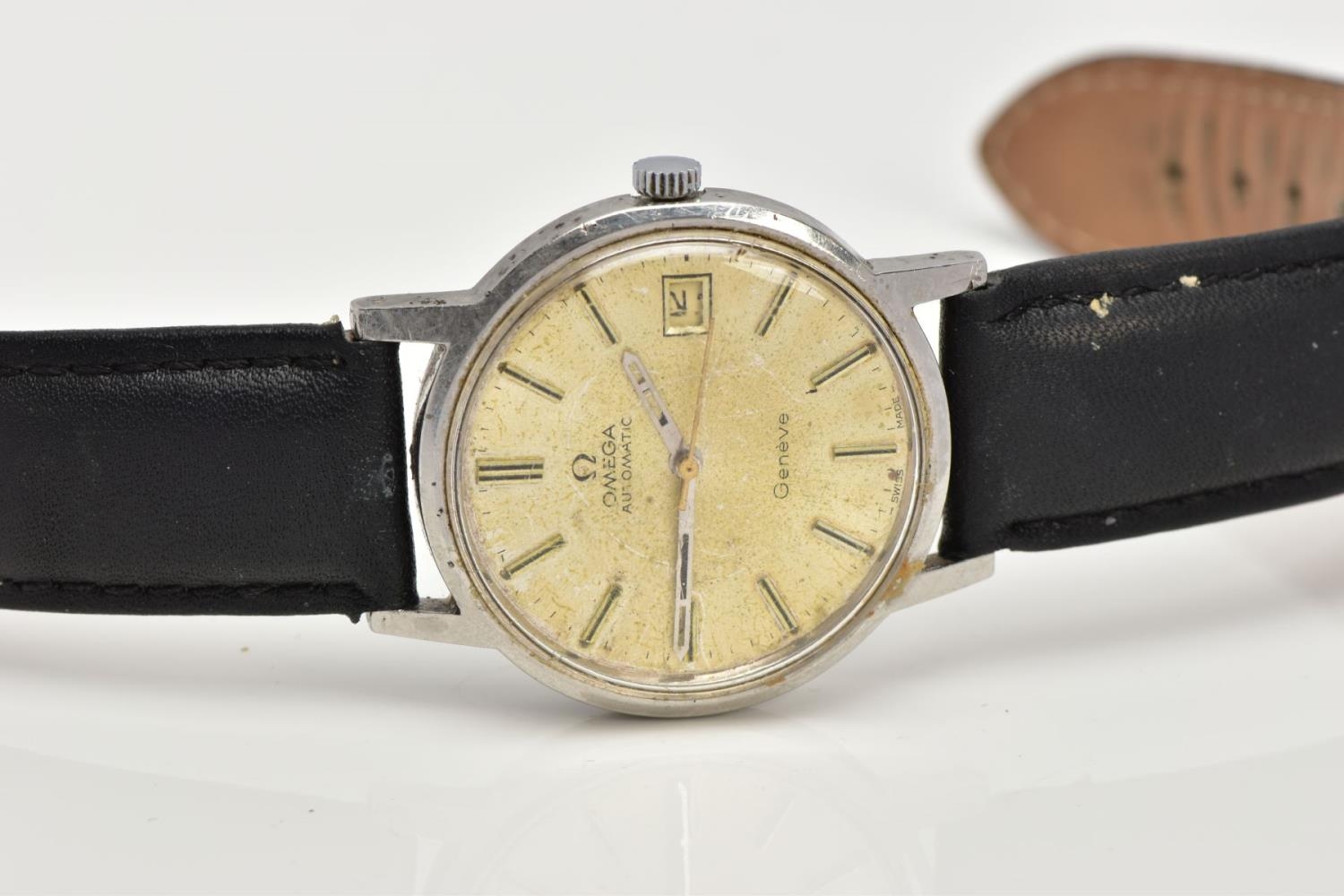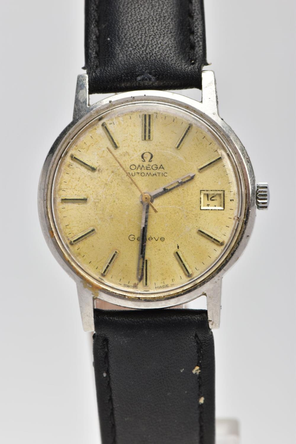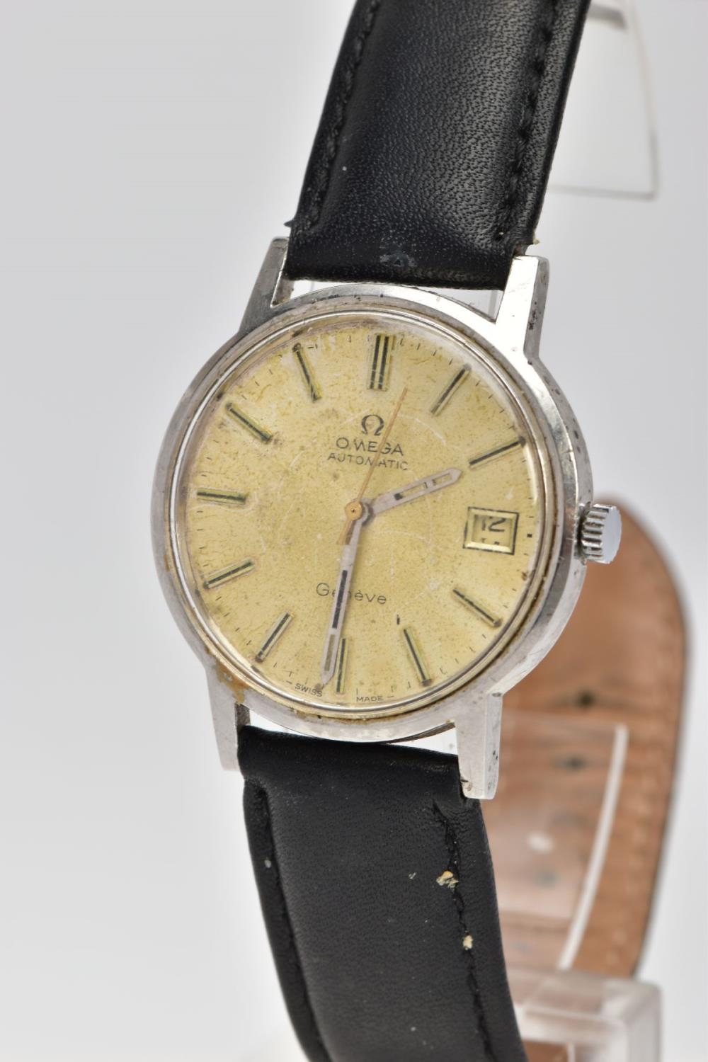 A GENTLEMENS 'OMEGA AUTOMATIC GENEVE' WRISTWATCH, round discoloured silver dial signed 'Omega Automatic Geneve', baton markers, date window at the three o'clock position, silver tone hands, within a plain polished case, approximate case width 34.9mm, fitted with a black strap and a white metal ardillon buckle (condition report: movement in need of some attention, does not wind, date cannot be adjusted, ticking but time keeping untested, discolouration to the dial, surface wear to the glass and case, strap also with some general wear)