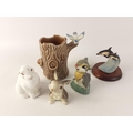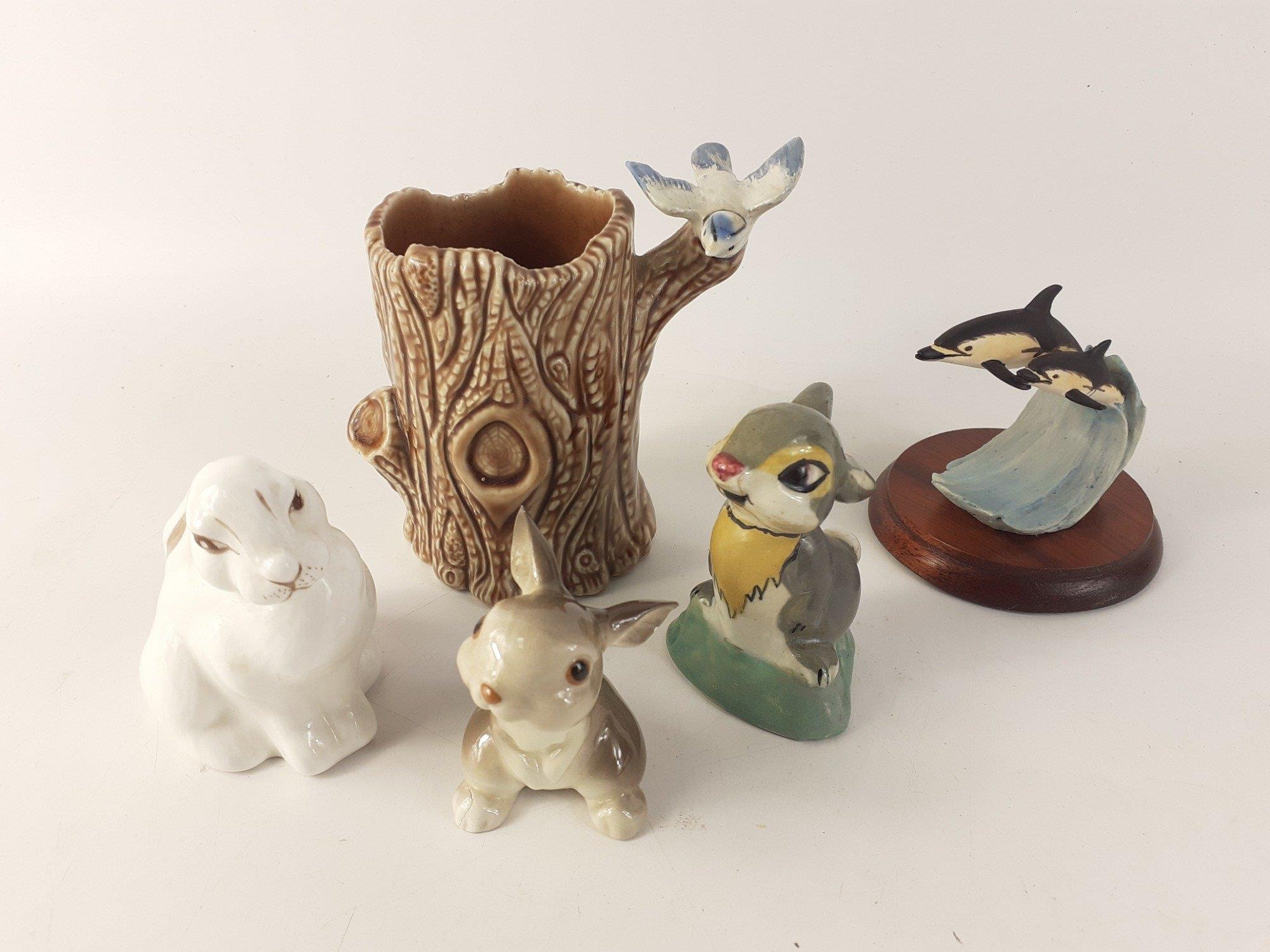 For the LOVERS of cute CERAMIC ANIMALS! A delightful collection of 5 pieces to include a COALPORT Bone China white rabbit measuring approx. 7cm in height, a "Made in U.S.A." brown rabbit (slight damage to right back foot) measuring a dinky 6cm in height, a Disney-style rabbit (with slight hairline crack) measuring approx. 7cm in height, a WADE porcelain tree trunk with bluebird perched on branch approx. 10cm in height and a BORDER FINE ARTS WW22 "Dolphin & young" sculpture on round wooden plinth measuring approx. 7cm in height.