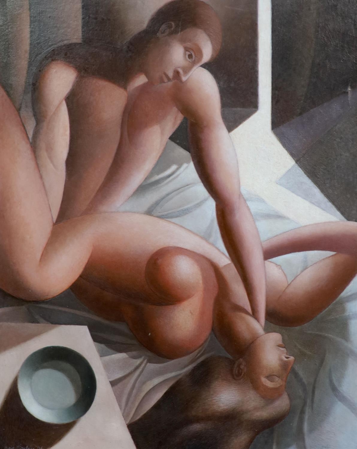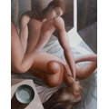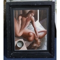 Oil on board in honest untouched condition, perhaps a little dirty with one tiny dented raised line of craquelure at 2 o?clock. housed in a black painted frame which is now little rubbed, labels verso for RA Summer exhibition 1996 along with further labels from the artist