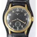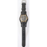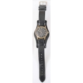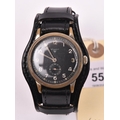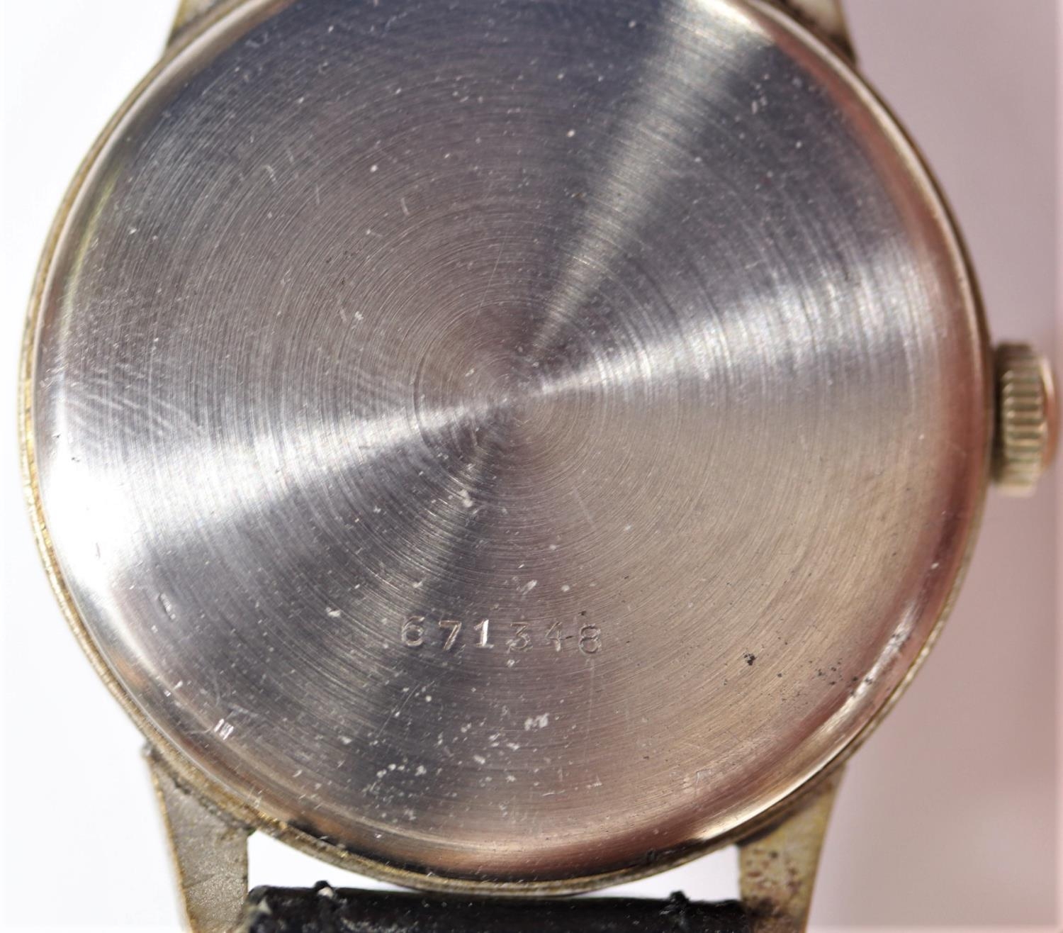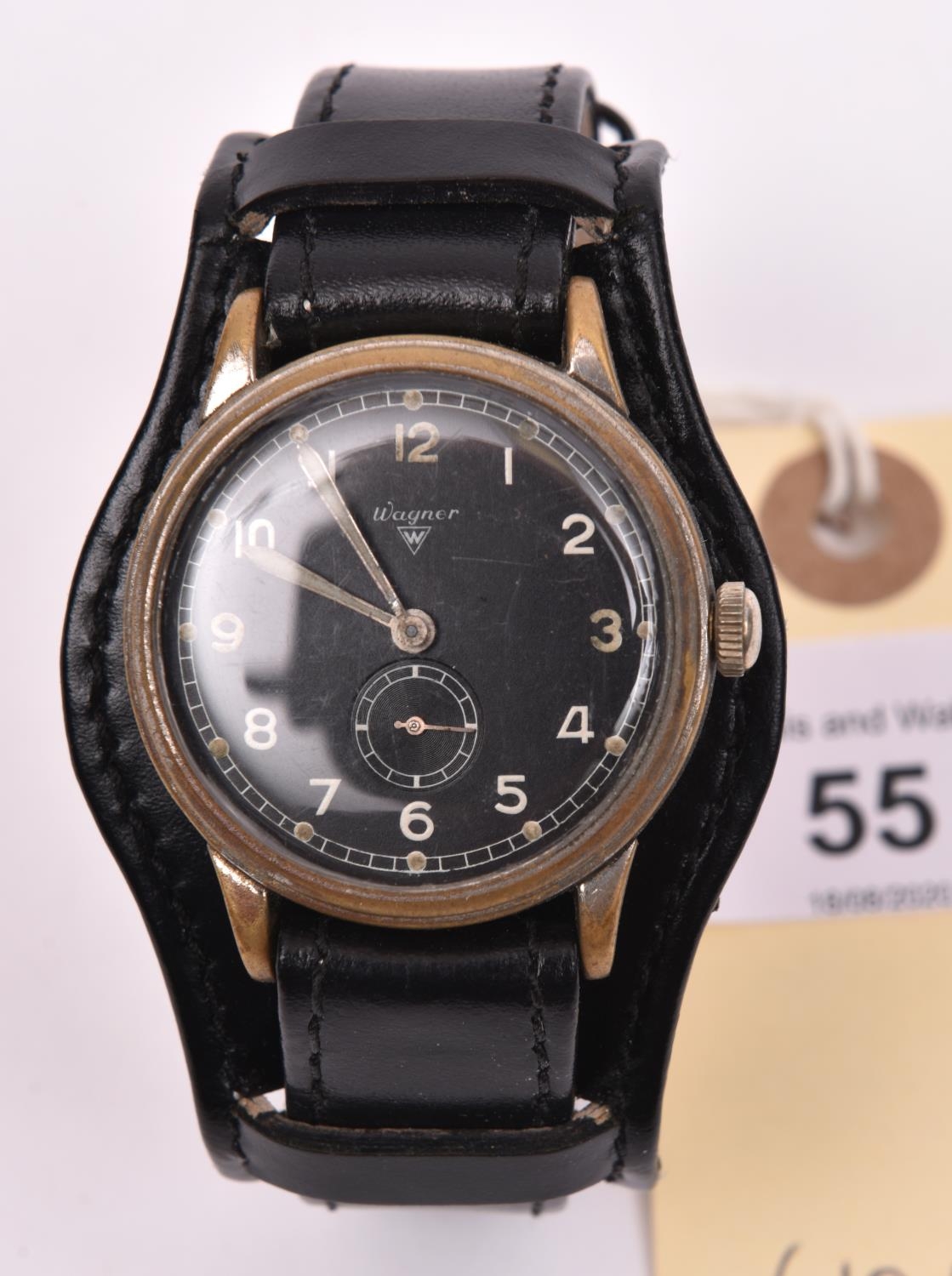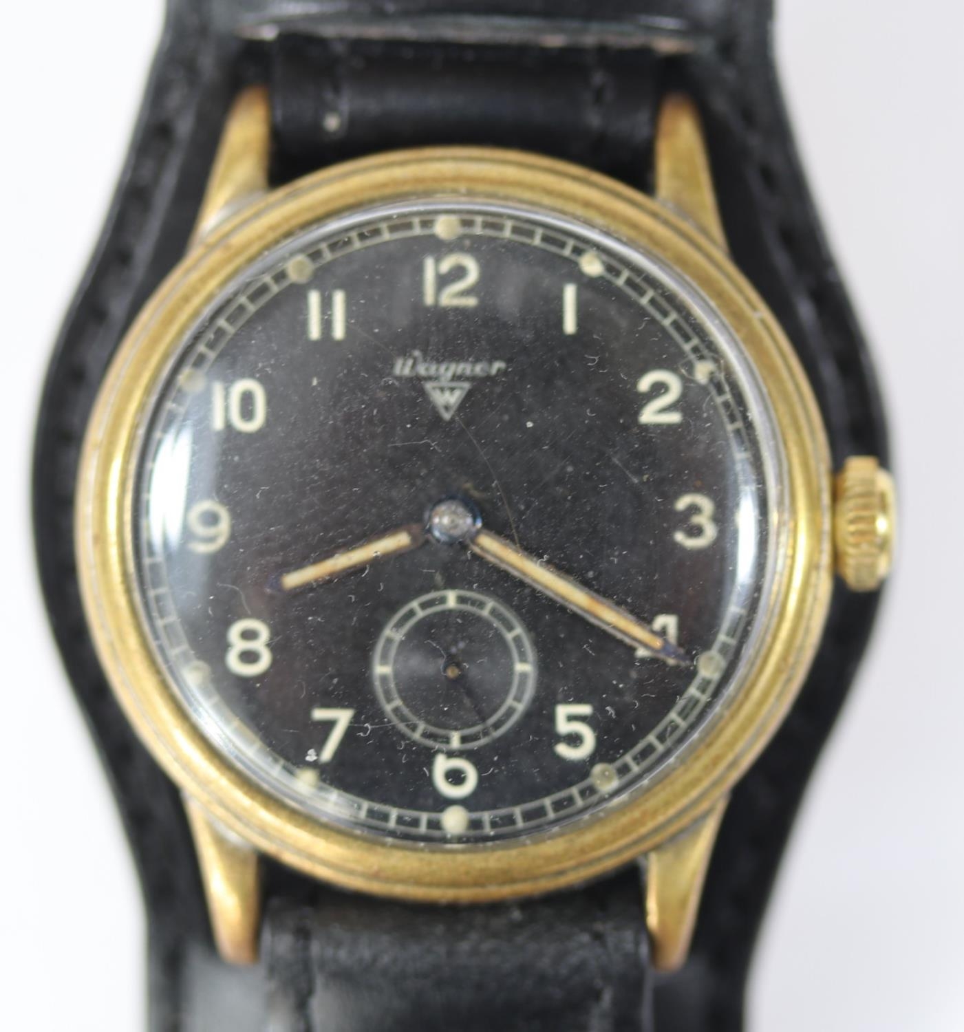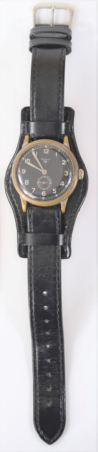 Wagner wristwatch. Serial 671348. Plated case, brushed finish, considerable wear to plating, 35mm without crown. Fixed bars. Snap caseback, no markings except for arrow motif. Very similar in form to RLM marked watches of other brands. Black dial in excellent condition, almost flawless, most luminous material on dial appears original, 3, 9 and 12 numerals, plus some hour markers appear retouched, hands likely refinished. Unsigned Urofa 581 movement, shock protected balance, very clean, running condition. Dust cover present. GC