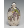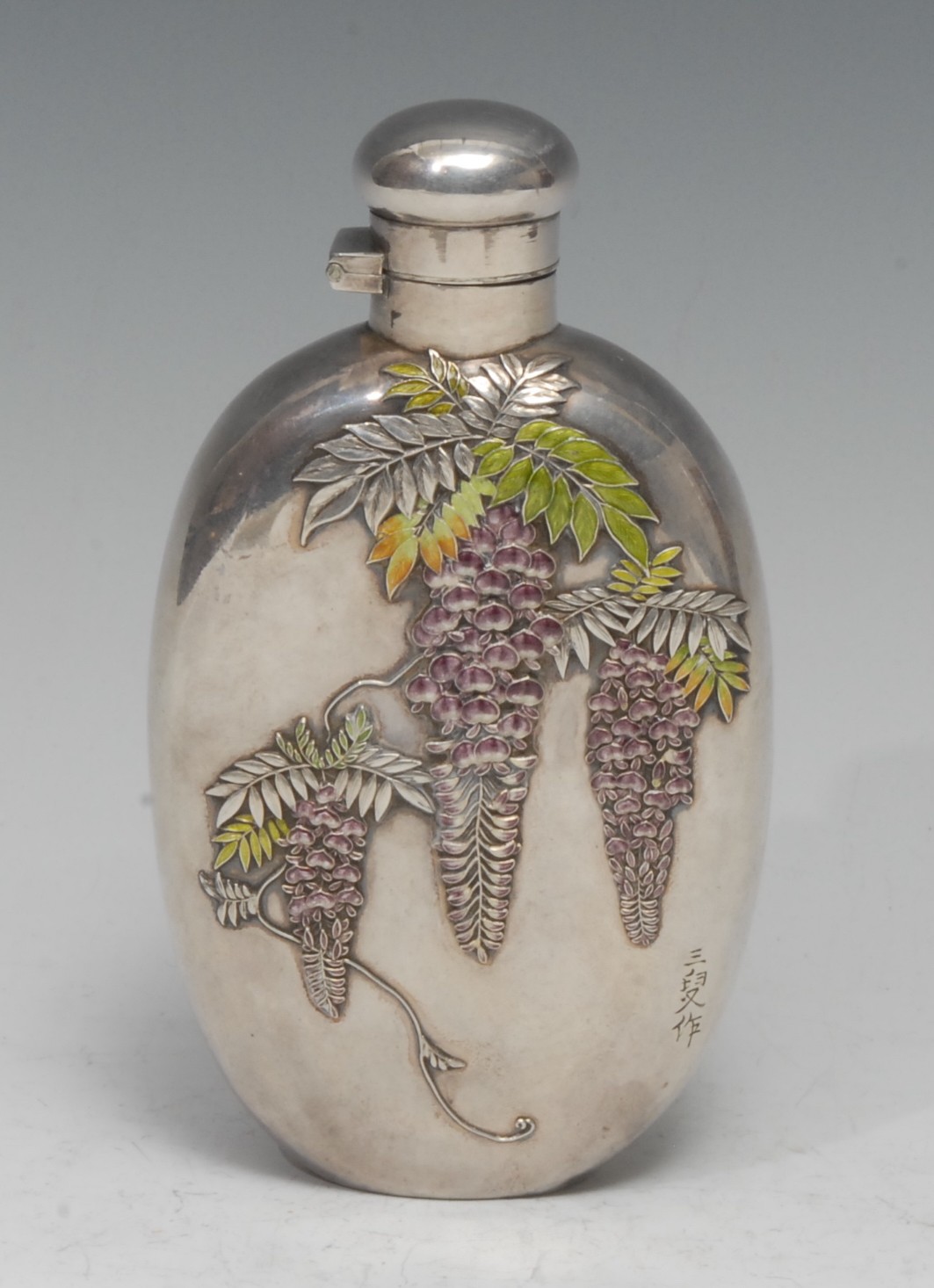 A Japanese silver and enamel oval hip flask, applied and decorated in polychrome with wisteria, hinged bayonet cap, 14cm long, signed, Meiji period, 5.5oz