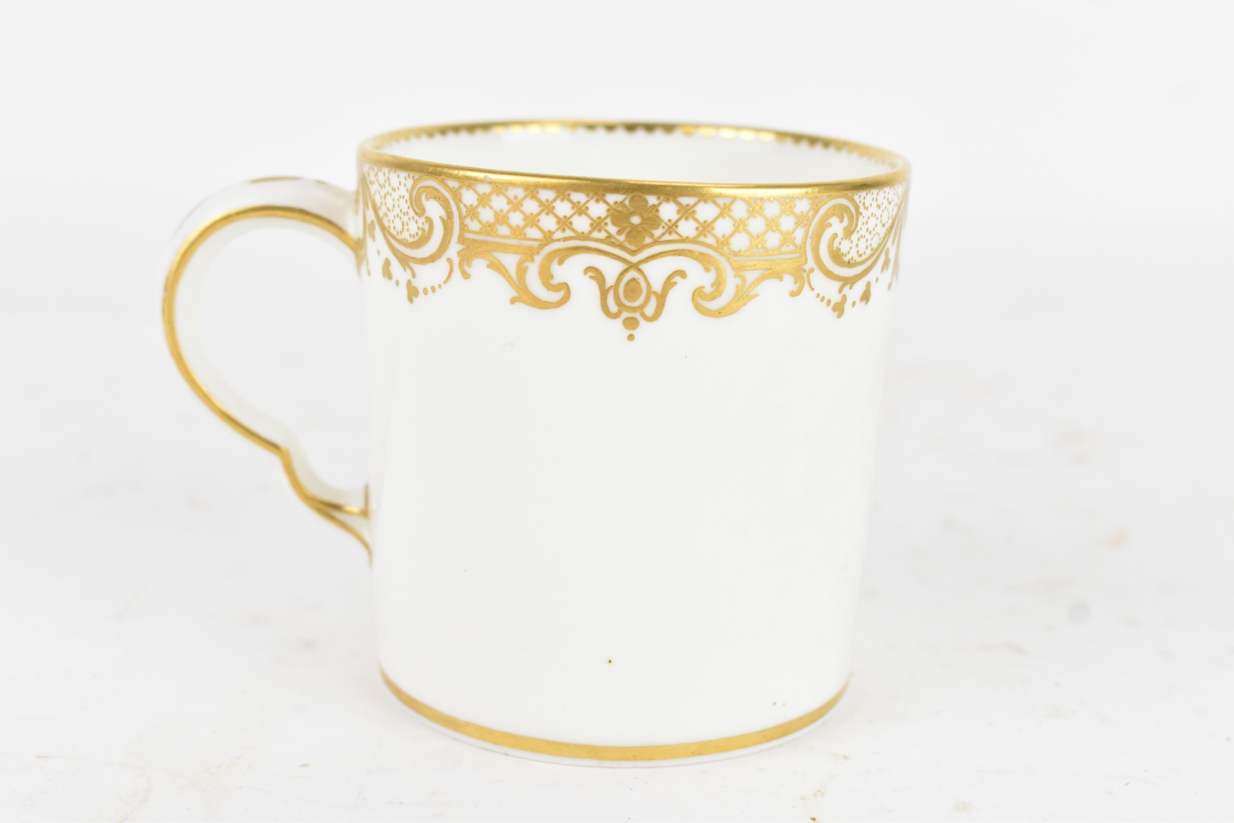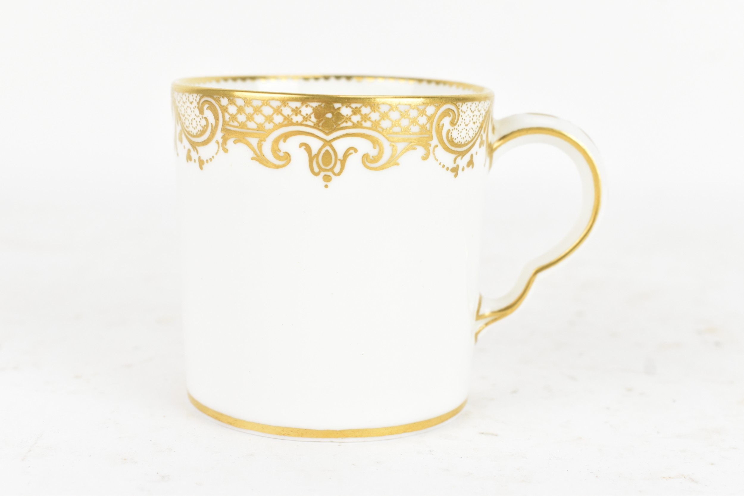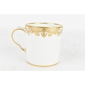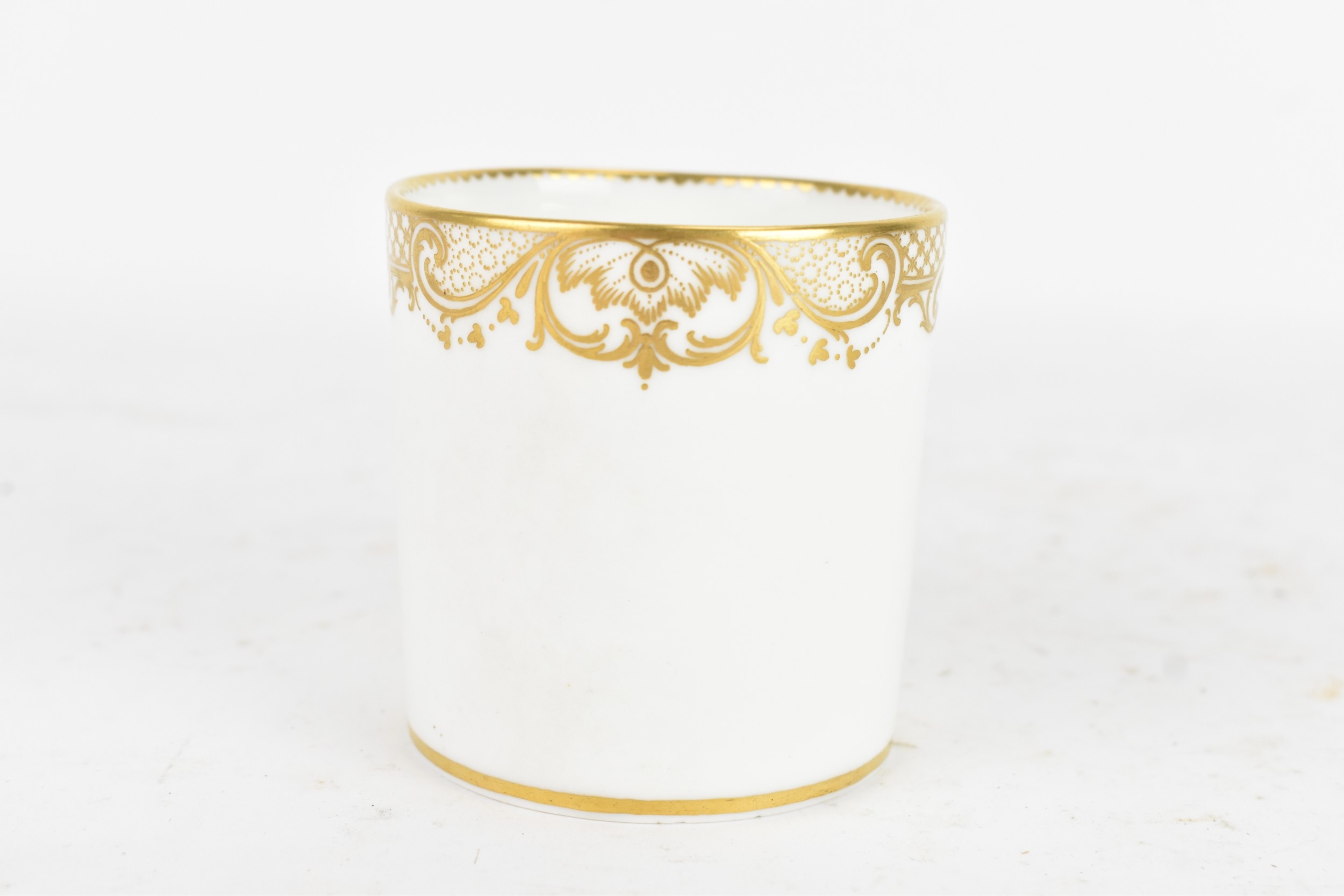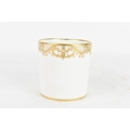 A late 18th century Sèvres porcelain coffee can, decorated in gilt with a neoclassical frieze of scrollwork and lattice ornament, the underside with interlaced Ls mark and gilder’s number 2000, possibly for Henry-François Vincent, 7.5cm high x 10.5cm wide