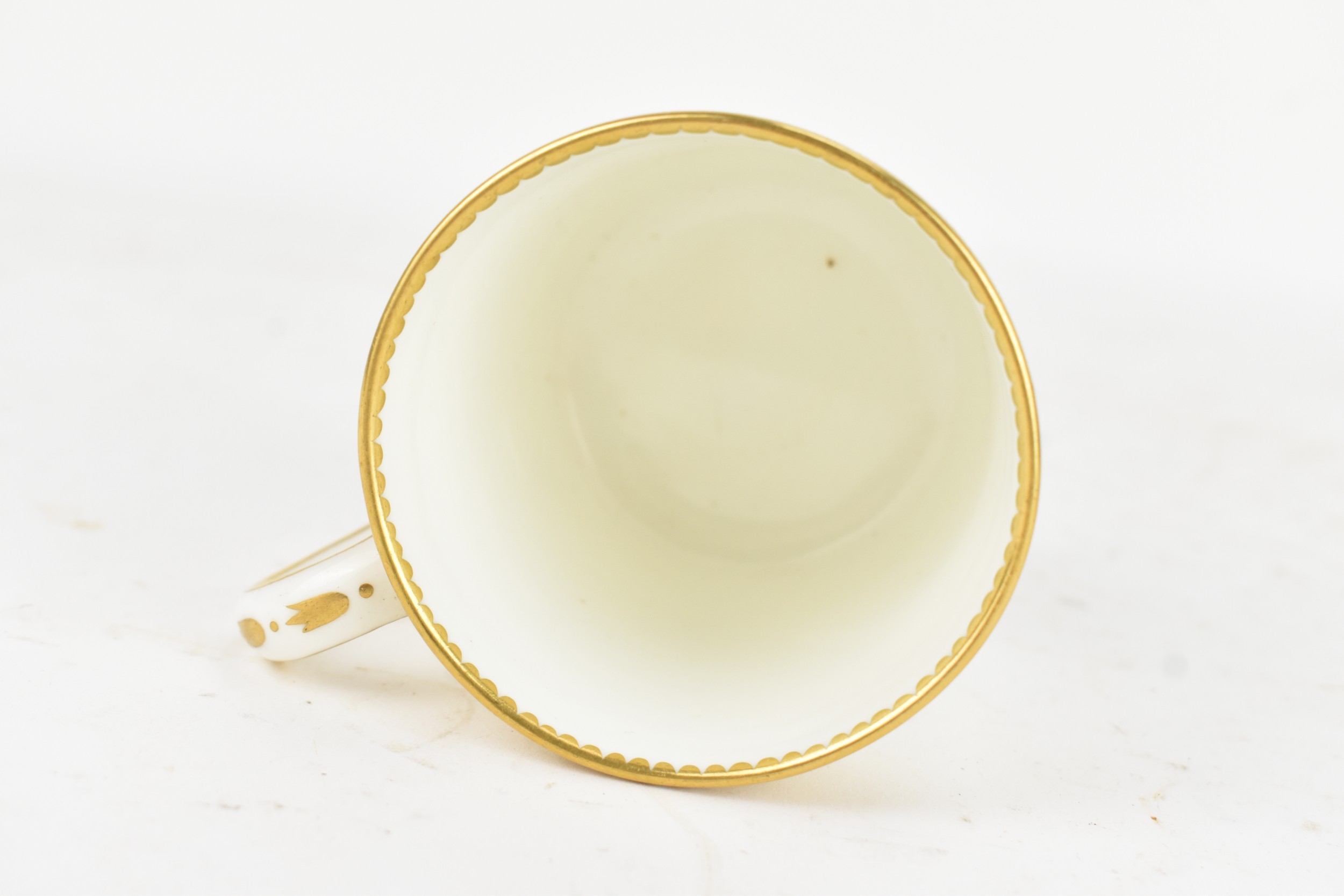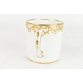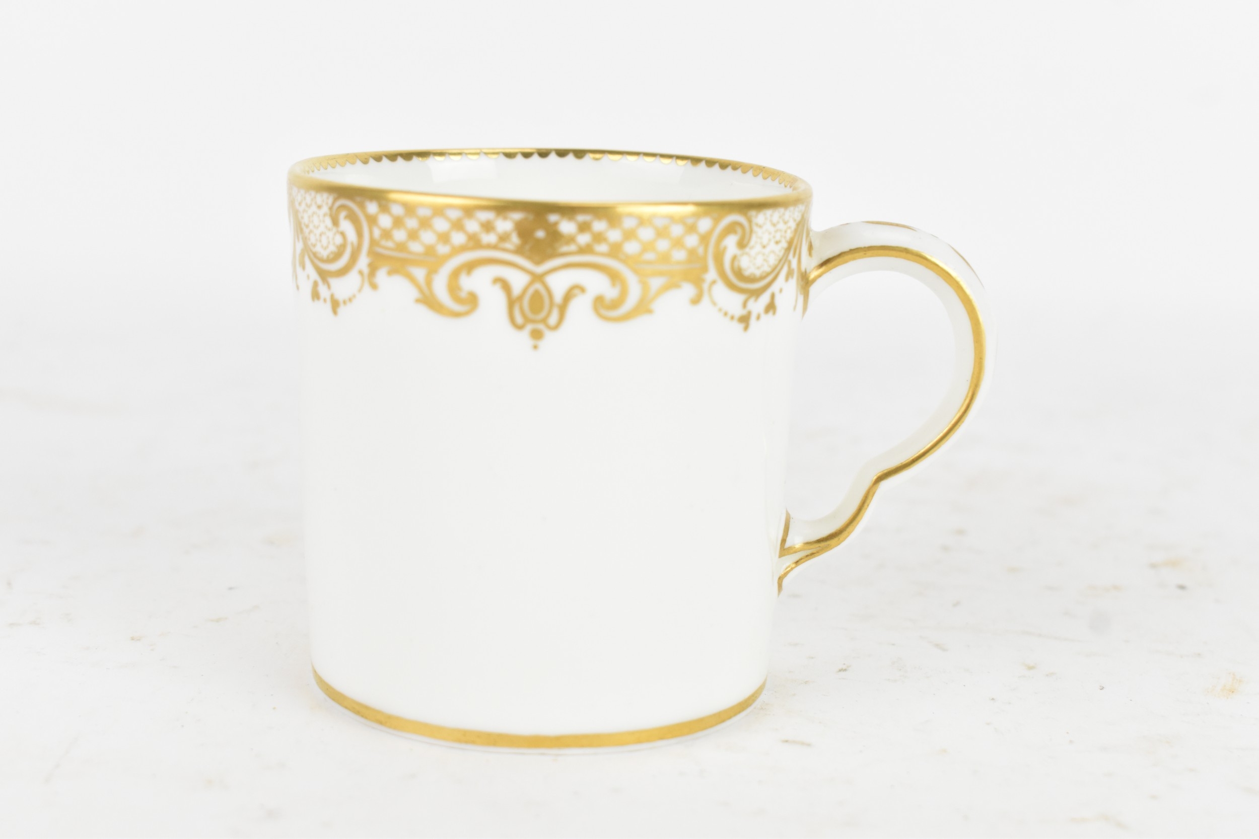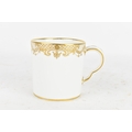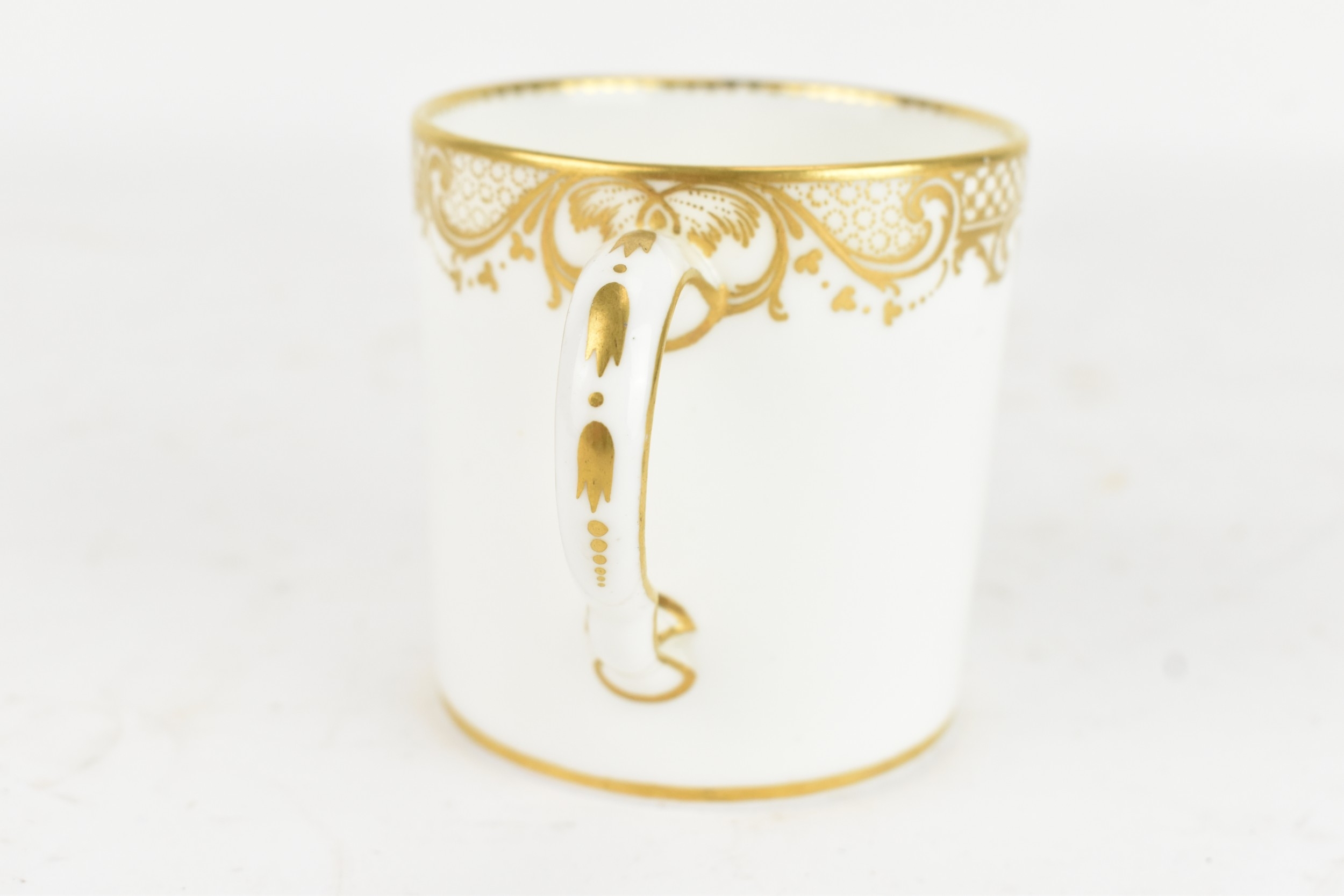 A late 18th century Sèvres porcelain coffee can, decorated in gilt with a neoclassical frieze of scrollwork and lattice ornament, the underside with interlaced Ls mark and gilder’s number 2000, possibly for Henry-François Vincent, 7.5cm high x 10.5cm wide