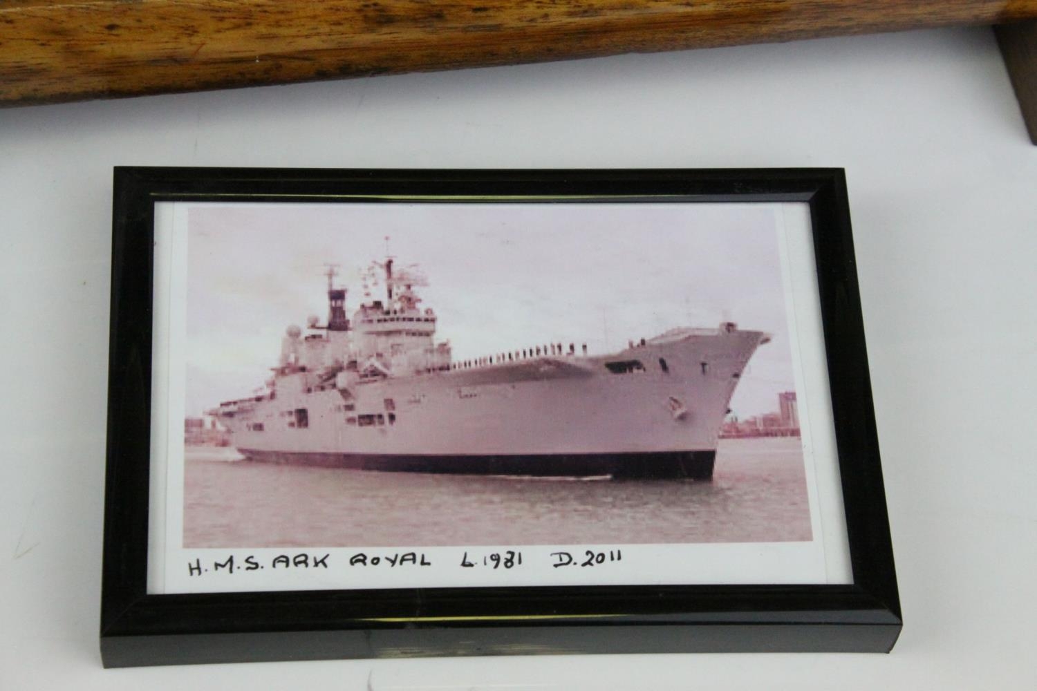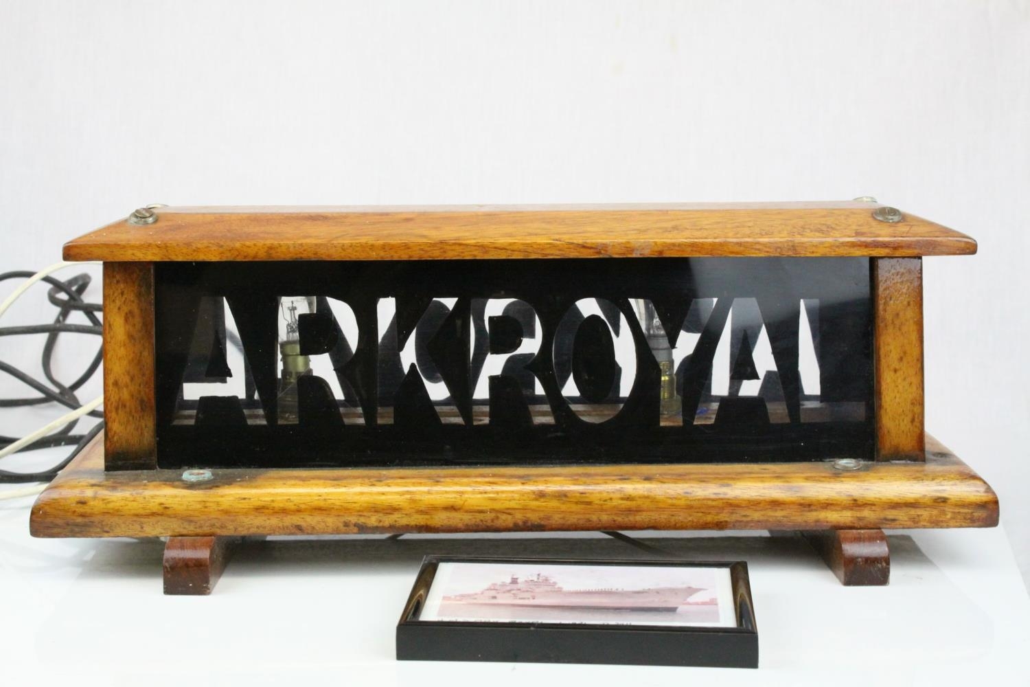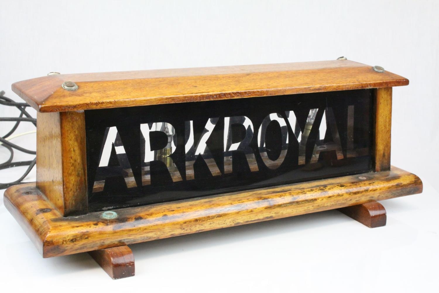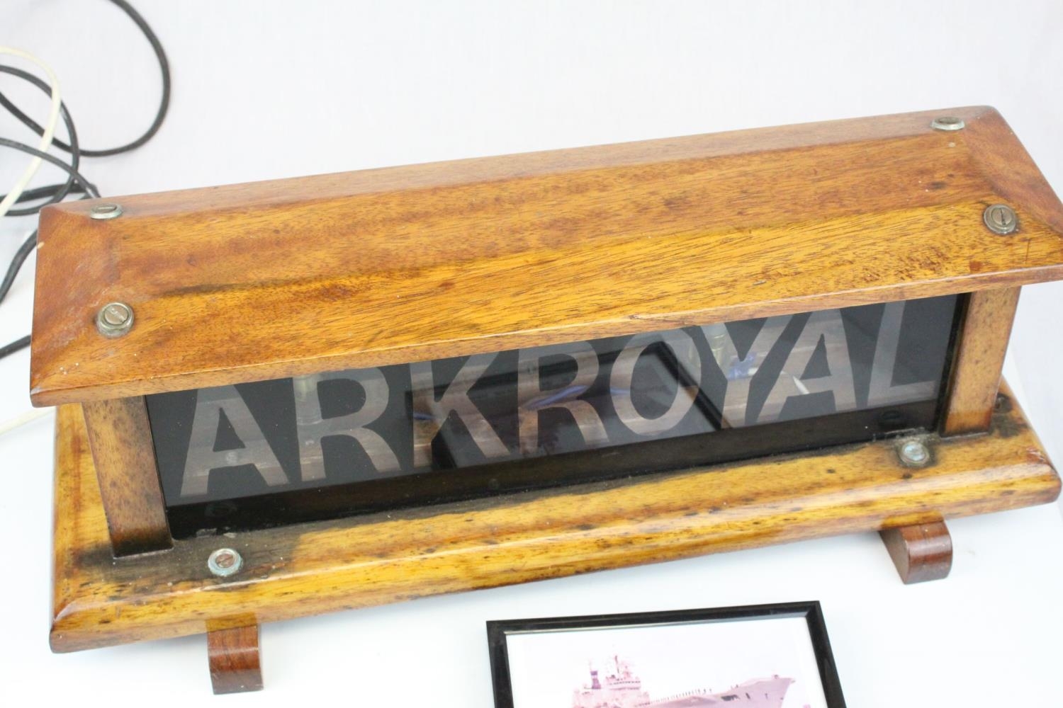 Naval / General Interest- Mid 20th century Wooden Framed Double Sided ' ARK ROYAL ' Illuminated (when re-wired) Sign, this sign would have been placed on one of the launch boat / tender on HMS Ark Royal bringing sailors to and from the shore, together with framed photograph of the ship, 50cms long