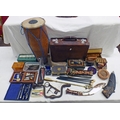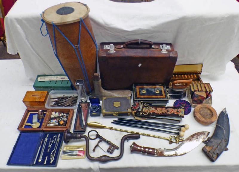 DRUM WITH DRUM STICKS, METAL BOXES, TUNING FORKS, DICE, BELL PULL, BLOCK IRON, LARGE 18TH OR 19TH CENTURY KEY, EARLY METAL BORING BRACE, KUKRI, LEATHER SUIT CASE ETC