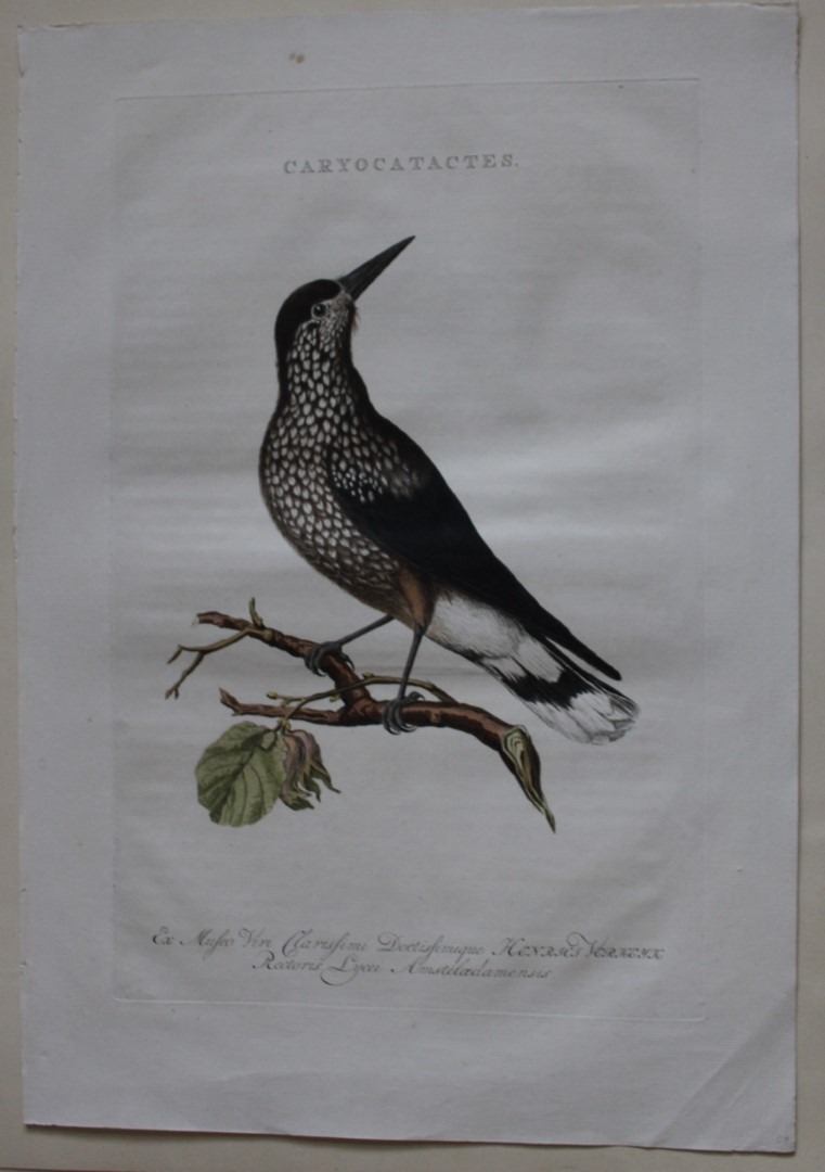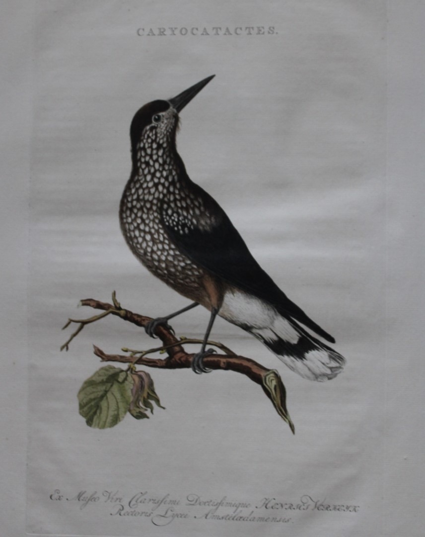 This beautiful engraving is of the Nutcracker (Caryocatactes)from Nederlandsche Vogelen by Cornelius Nozeman. Published in Amsterdam in 1770.