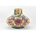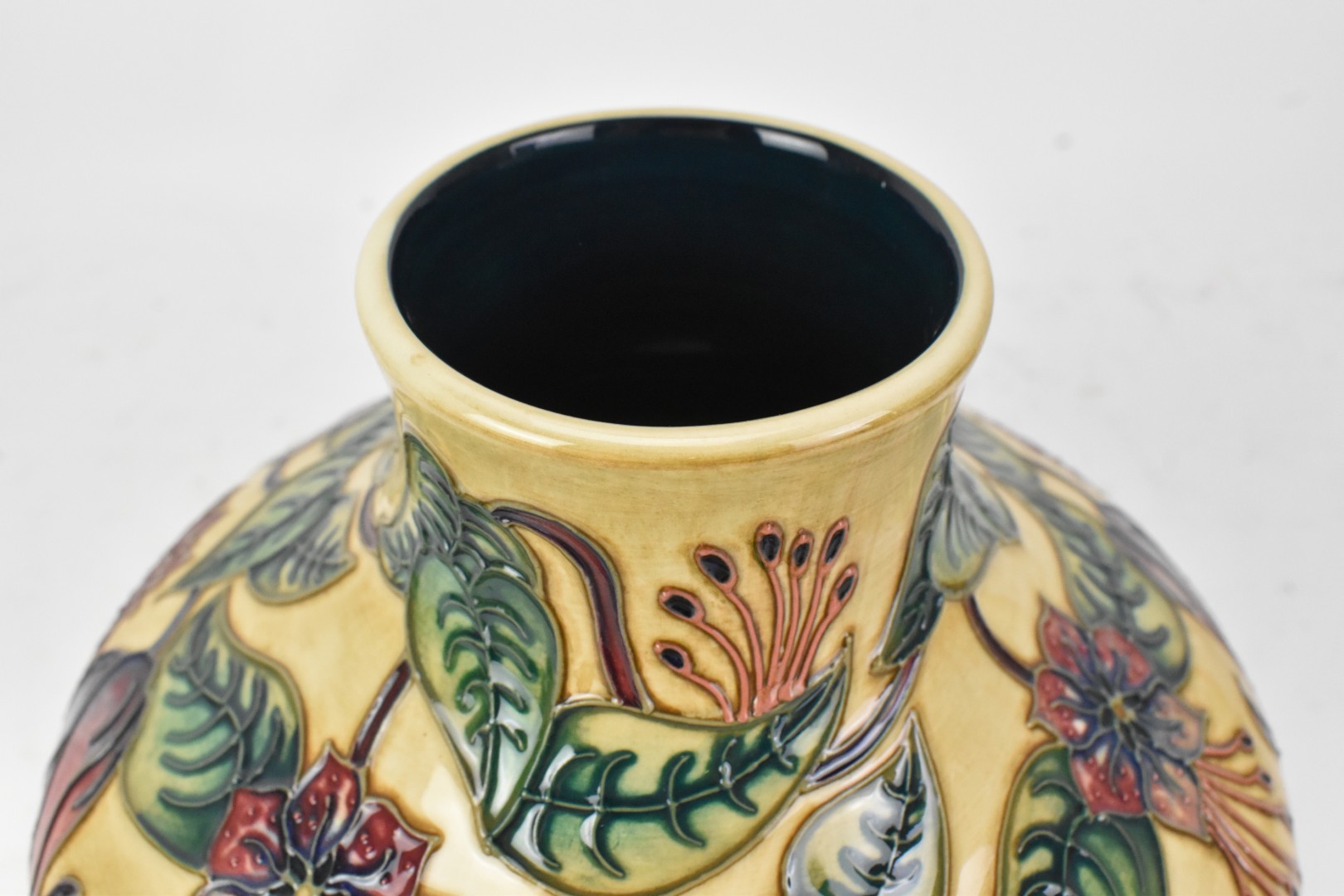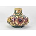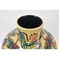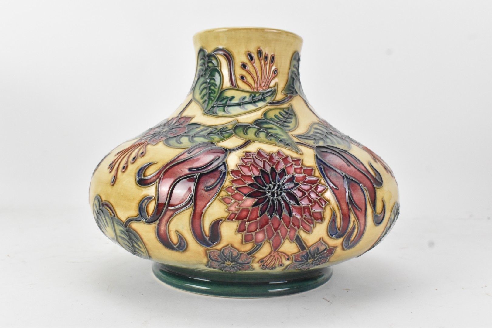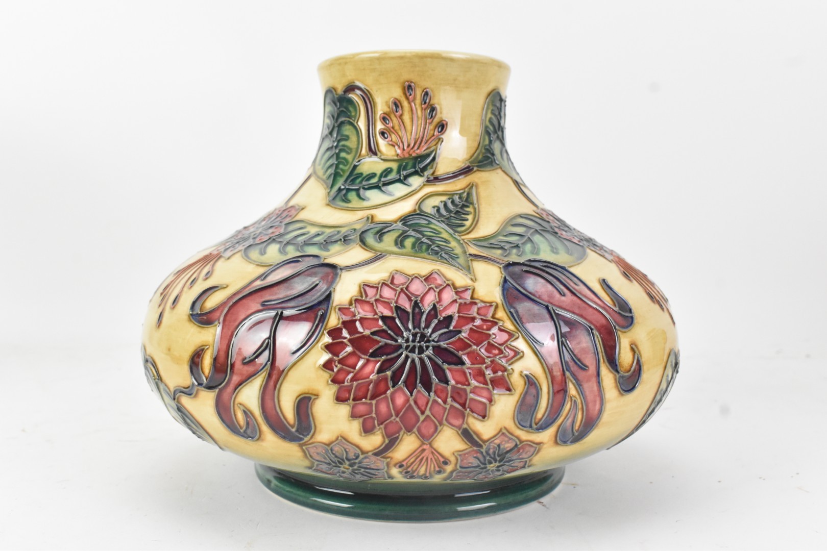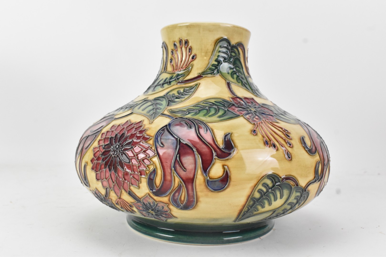 A Moorcroft pottery vase, in the 'Tahiti' pattern designed by Nicholas Slaney, of squat form, marks to the base, date mark for 1999, 16cm high x 21cm wide