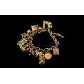 9ct Gold Vintage Charm Bracelet - Loaded with 16 9ct Gold Charms. Both Bracelet and Charms Marked for 9ct - 375. Some Interesting Charms, Includes 10 Shilling Note Charm. 59.3 grams. Excellent Condition.