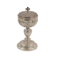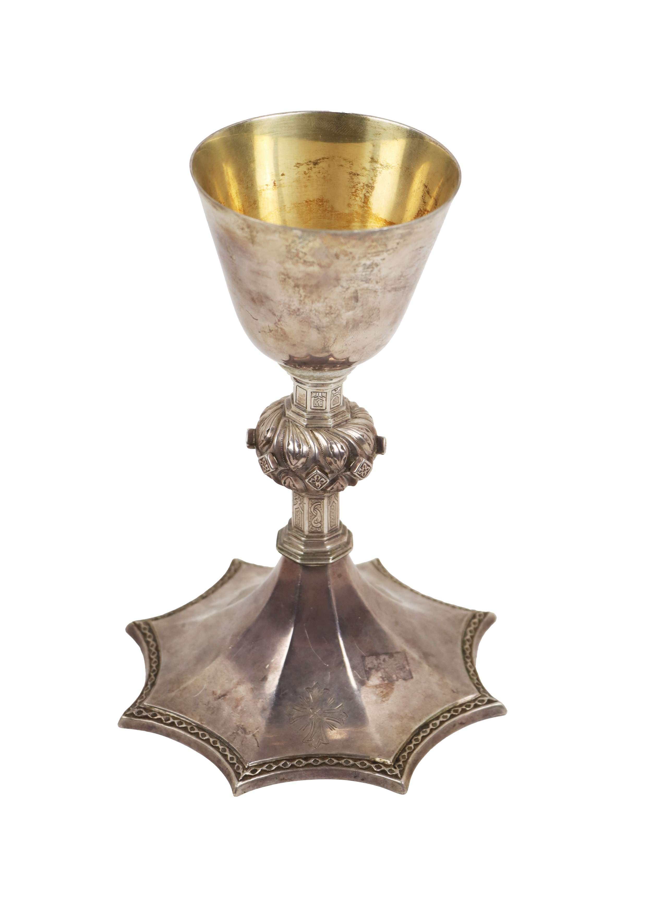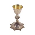 A 20th Century Irish silver Gothic style Chalice, the plain bowl with gilded interior, shaped pillar on a sunburst design base, hallmarked Dublin, Alwright and Marshall, 1946, approx. 21cms high, approx. 15.7 ounces, inscribed. (1)
