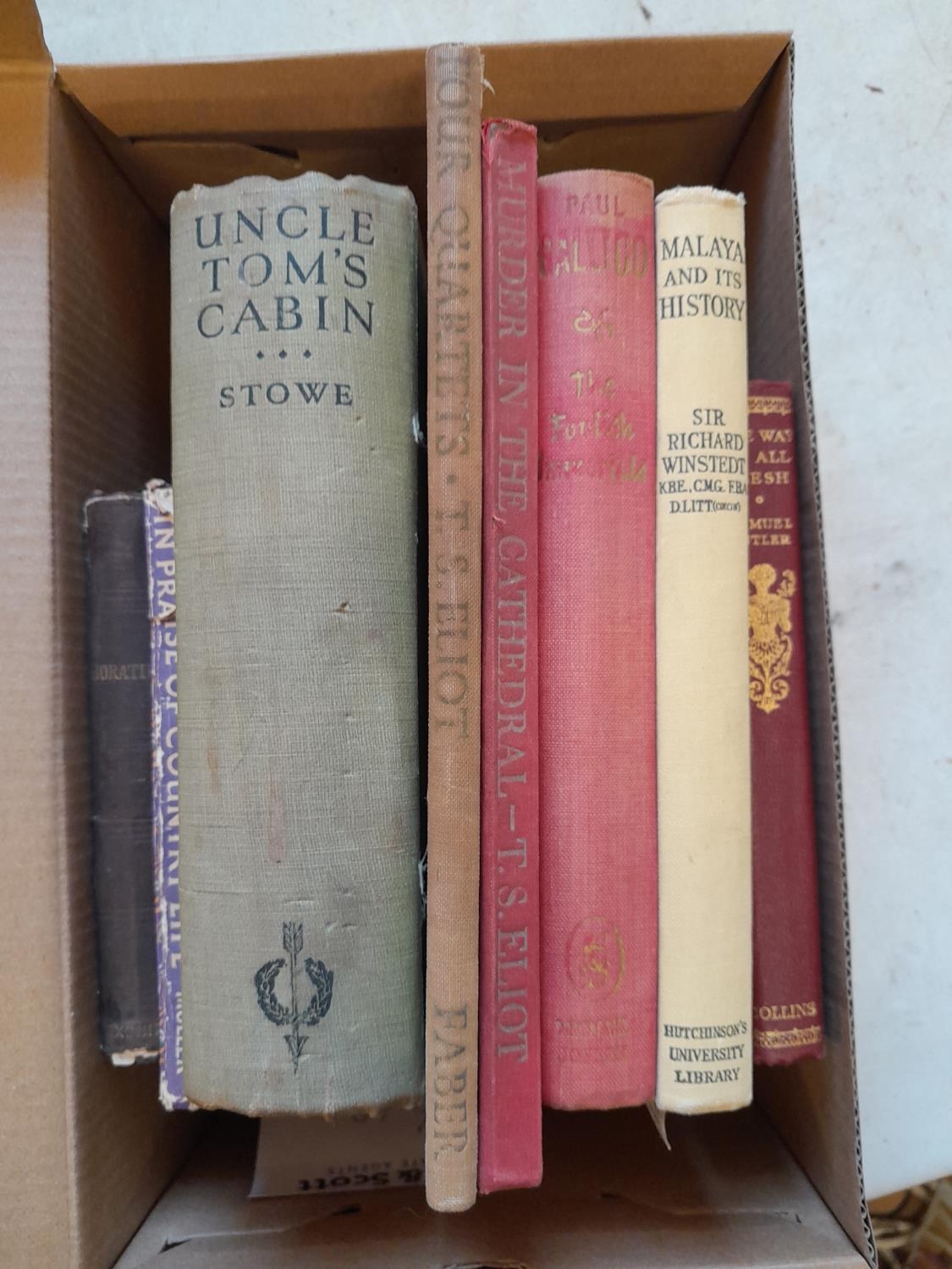 Various volumes : In Praise of Country Life 1949 Edition, Horatio circa 1873, Uncle Tom's Cabin, T S Eliot x 2 Malaya and its Histories Second Edition etc.