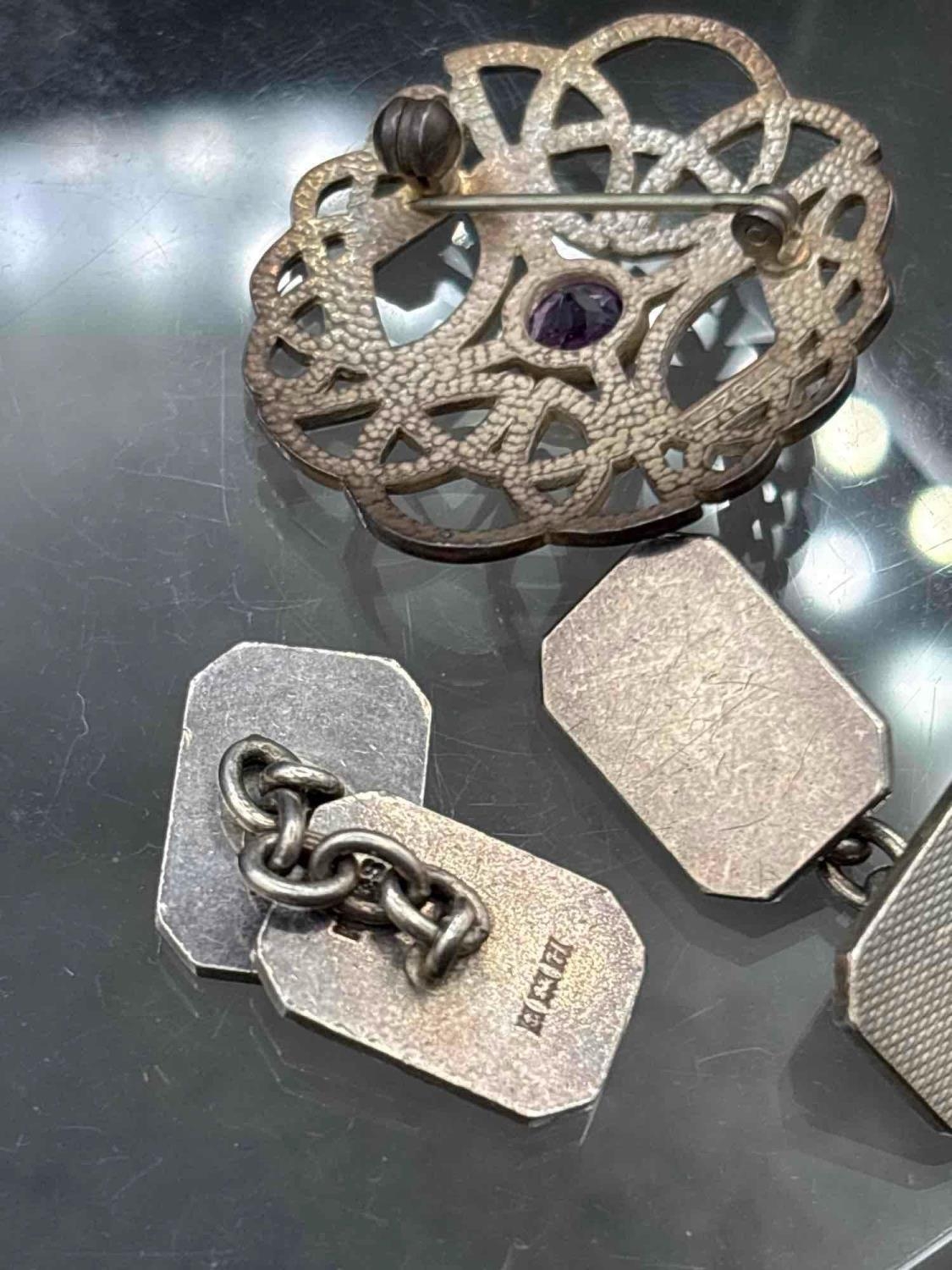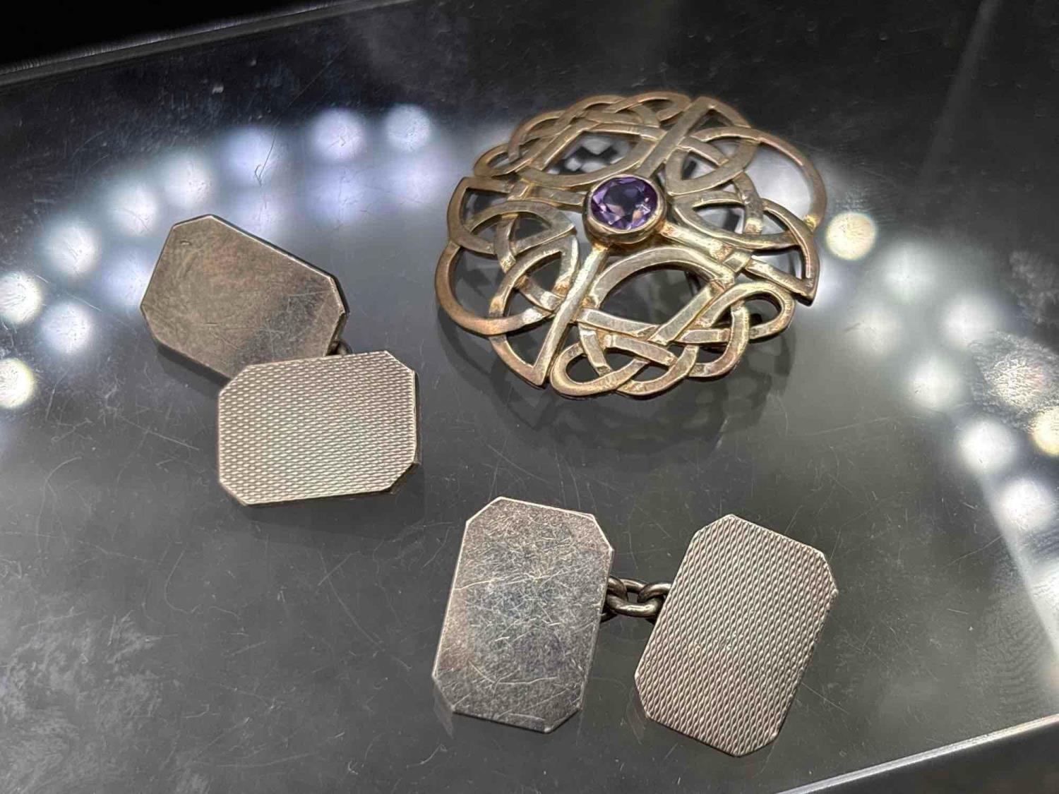 A silver Scottish style brooch and a pair of silver cufflinks