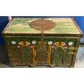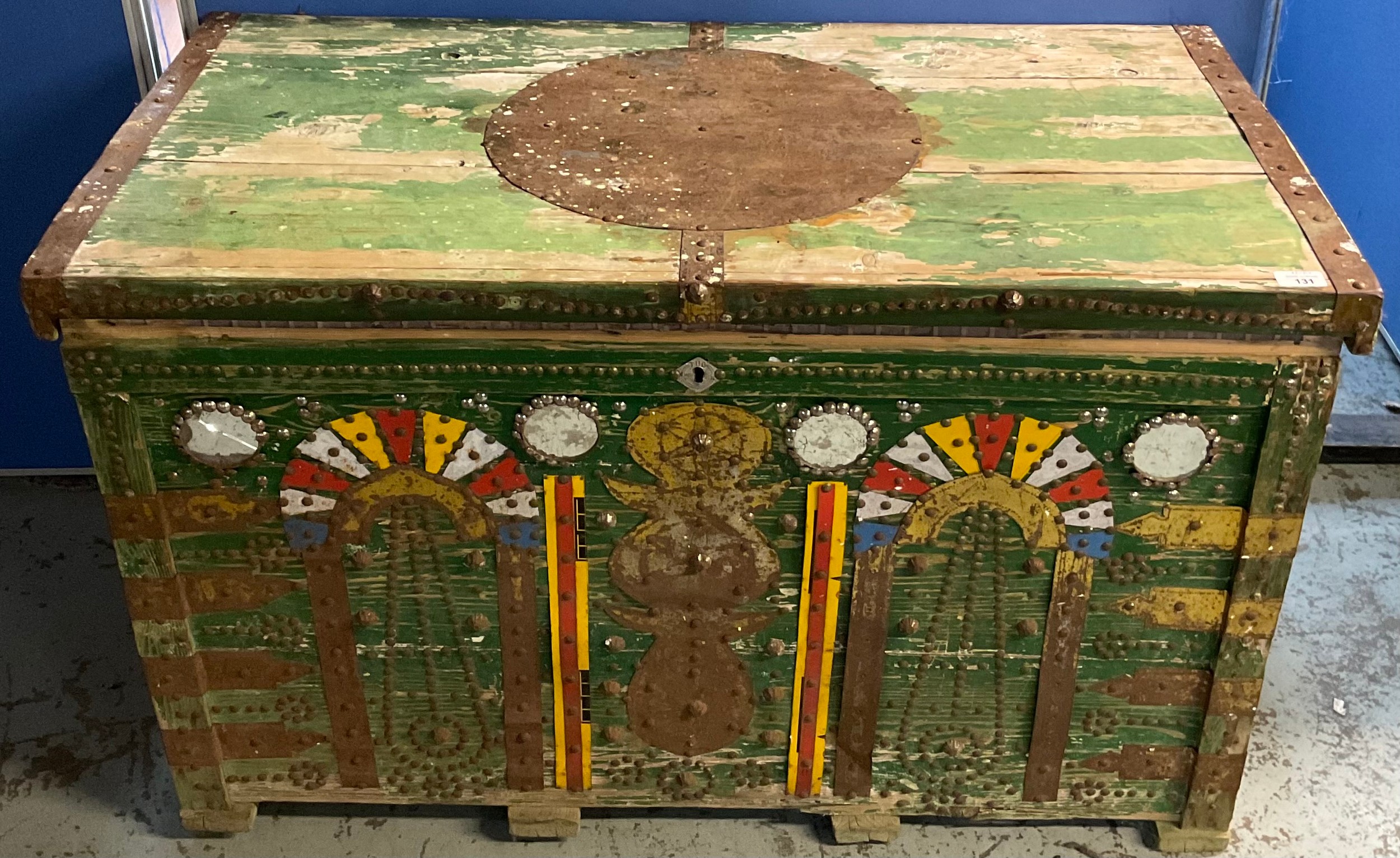 20th century painted pine blanket box with fitted interior and candle box. Stud work and mirror decoration. W109cm