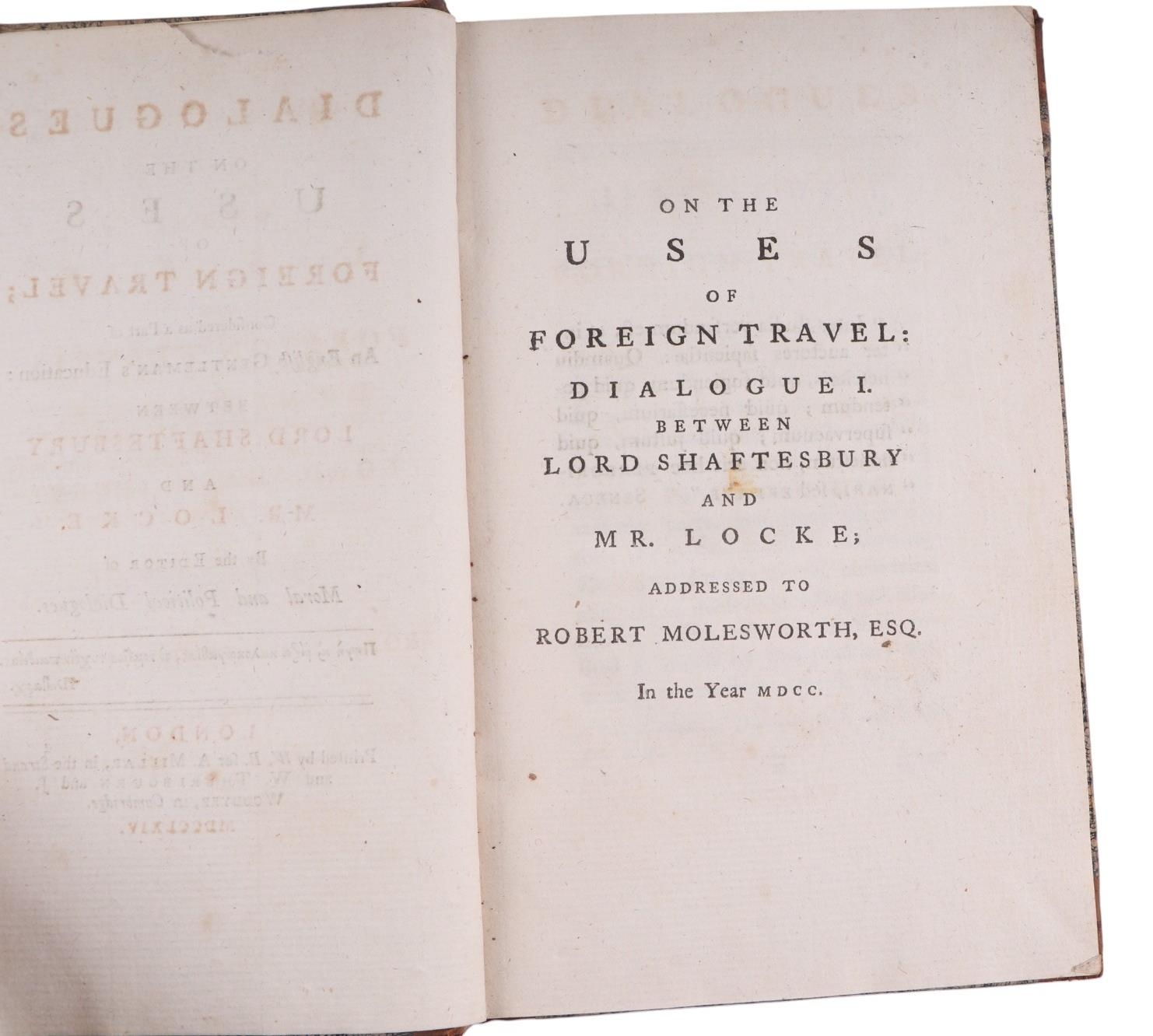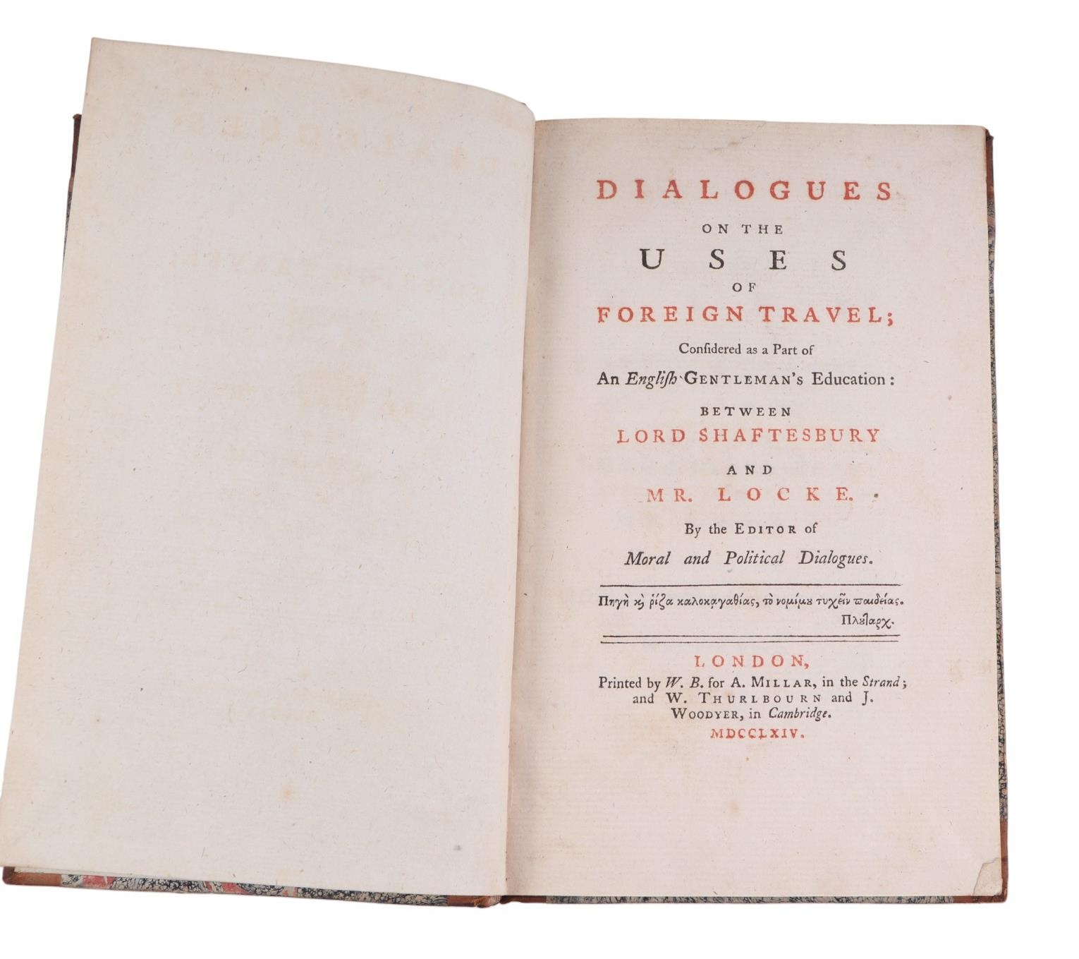 Dialogues on the Uses of Foreign Travel Conferred as Part of an English Gentleman's Education Between Lord Shaftesbury and Mr Locke, edited by Moral & Political Dialogues, printed by WB for A Millar, 1764, half calf with marble end boards and frontis for the Earl of Morley.