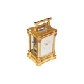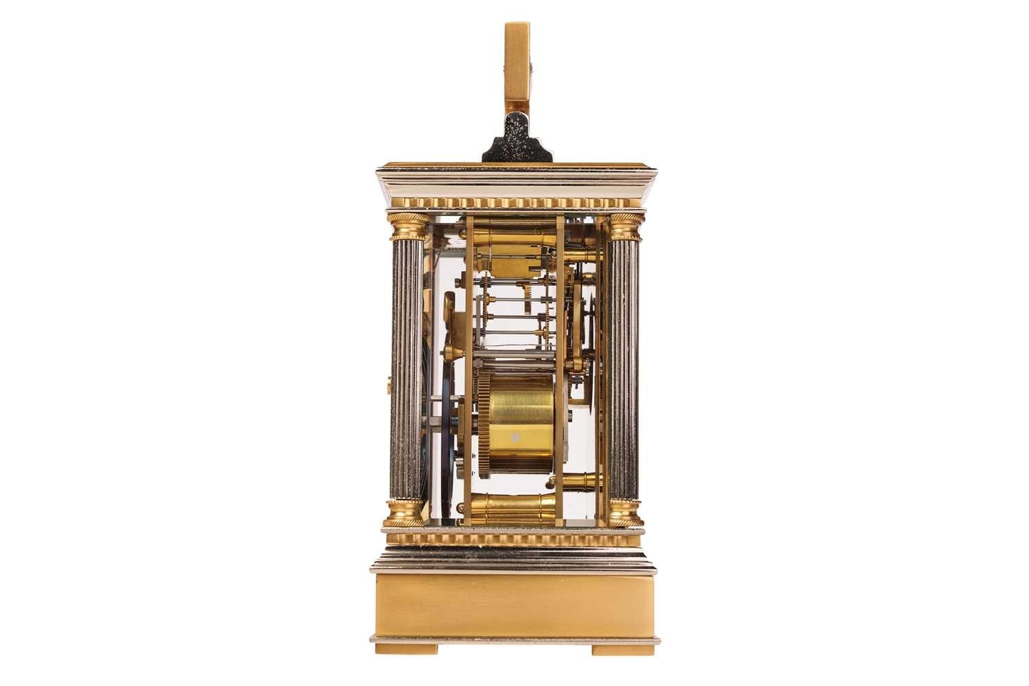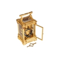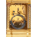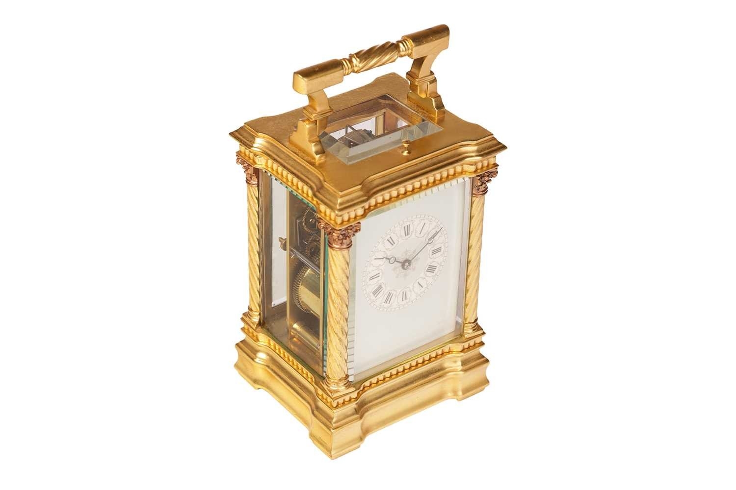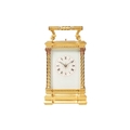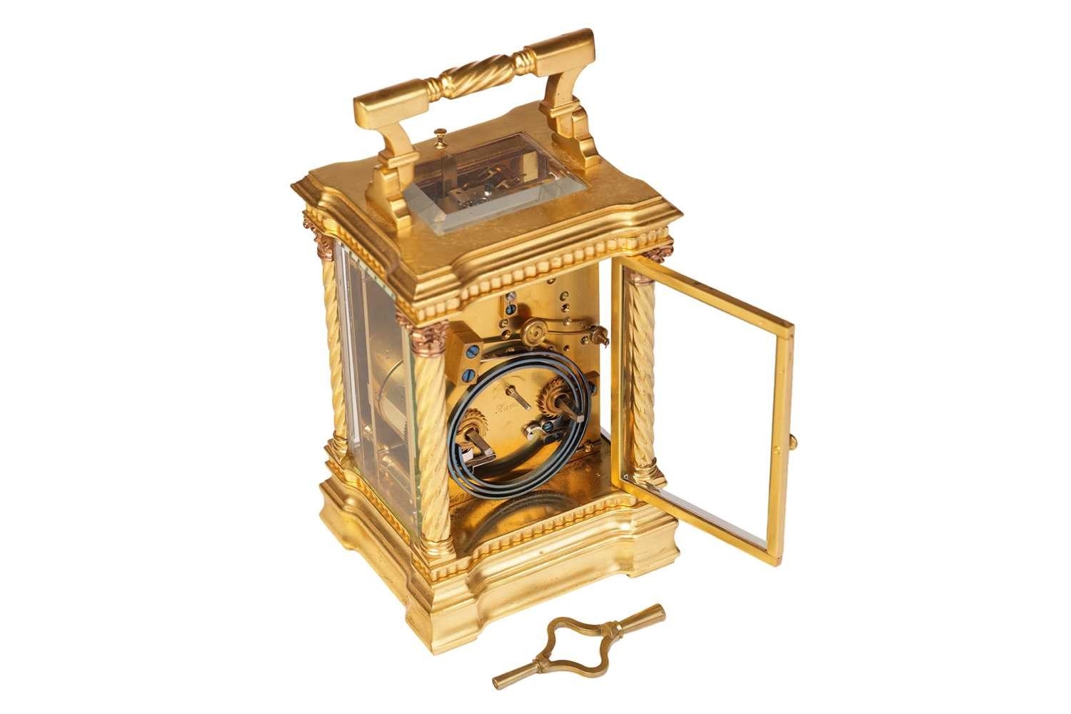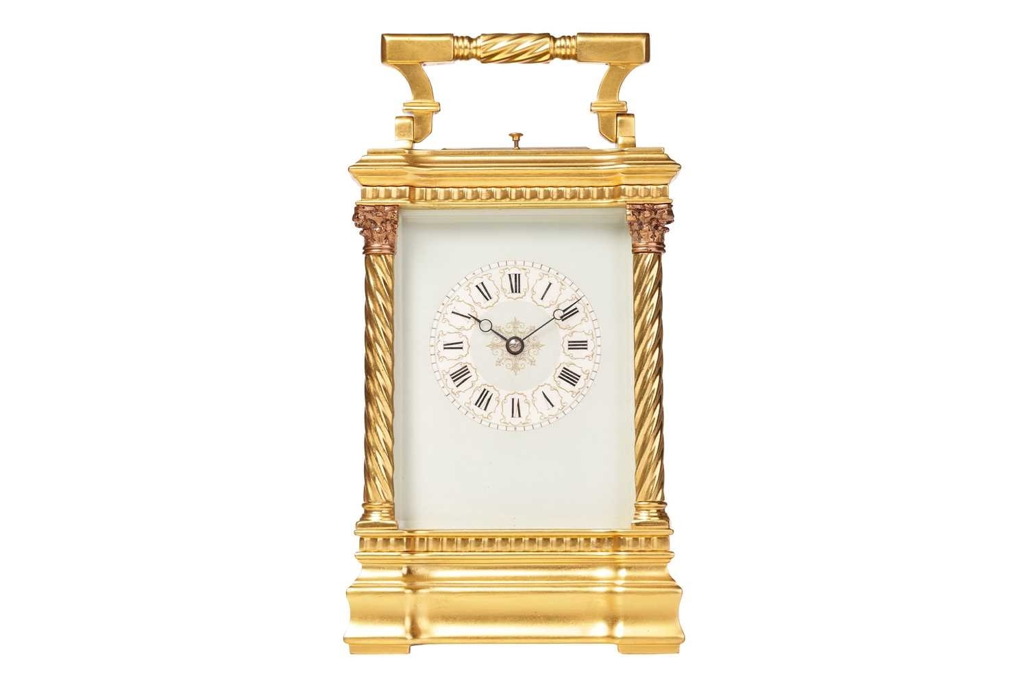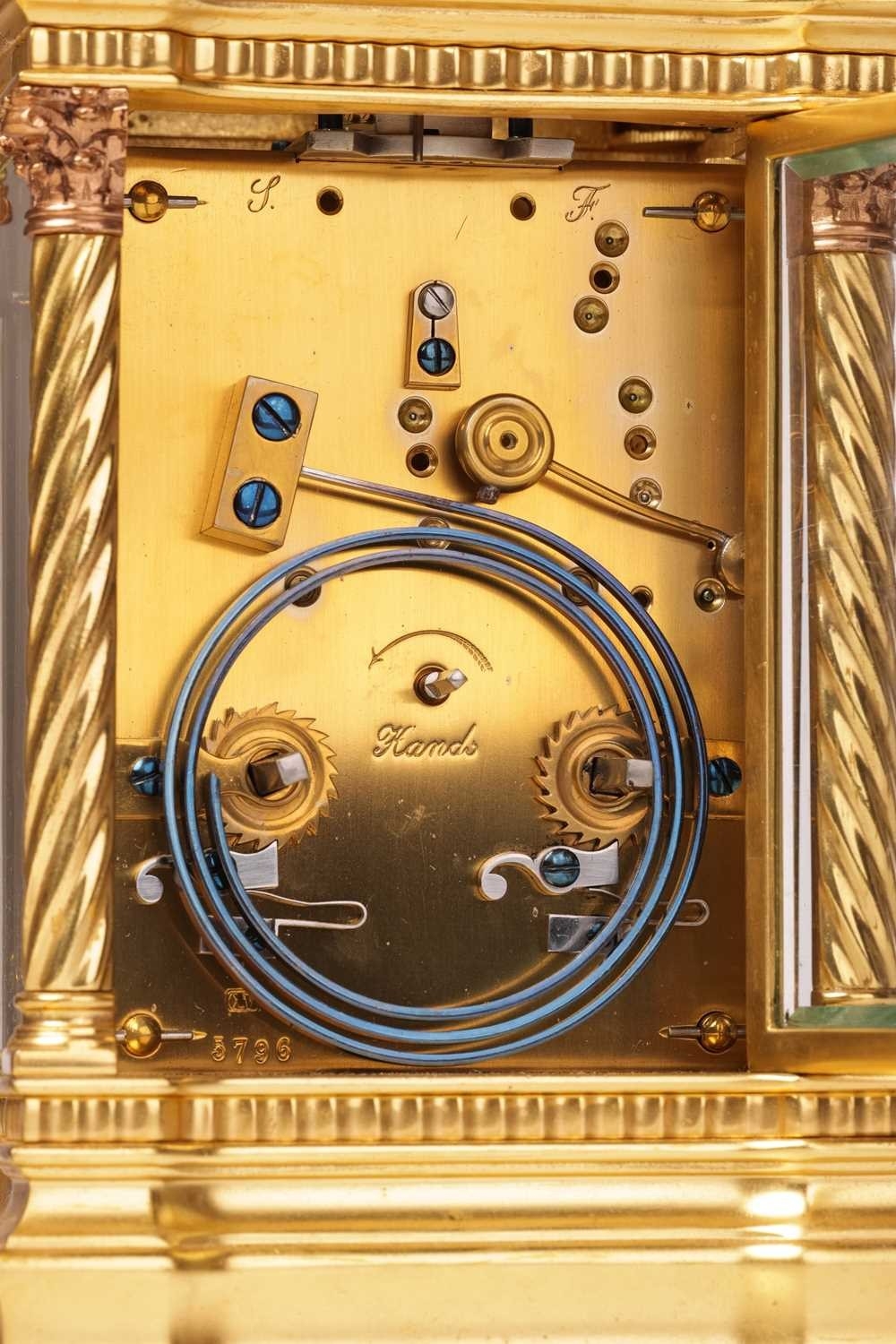 Charles Vousin, an Anglaise Riche cased, 8-day hour repeater carriage clock, the gilt-brass case with wrythen Corinthian columns, fitted with a single piece "Duck-Egg" blue enamelled Roman dial and blued steel moon hands, the movement chiming the hours and half as a passing strike on a coil gong, numbered 5796, accompanied by a double-ended key, 20.5 cm high (handle up). Both trains wind, and the repeater activates the correct chime. The balance does not run after winding and agitation. The bevelled lenses are intact without chips
