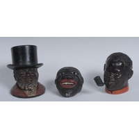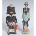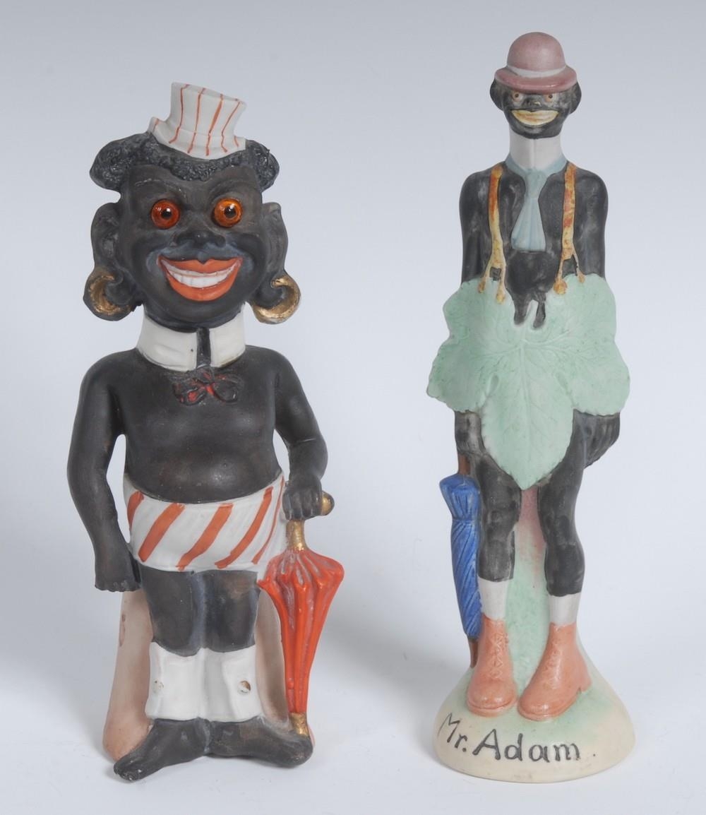 An early 20th century Continental bisque porcelain figure, Mr Adam, he stands with his fig leaf secured by braces, bowler hat, umbrella and boots, 19cm high; another, comically dressed for the beach, 17.5cm high (2)