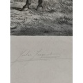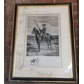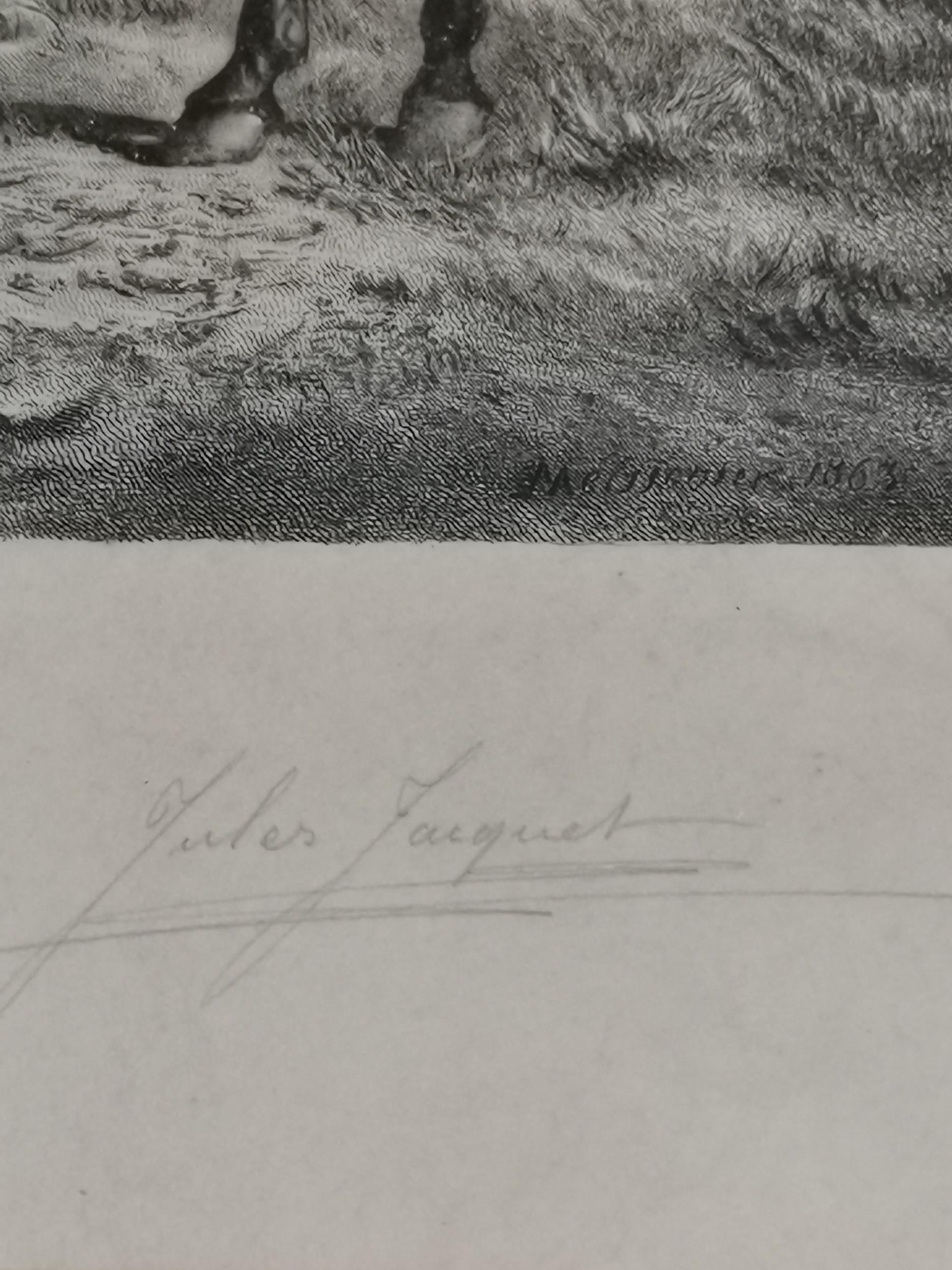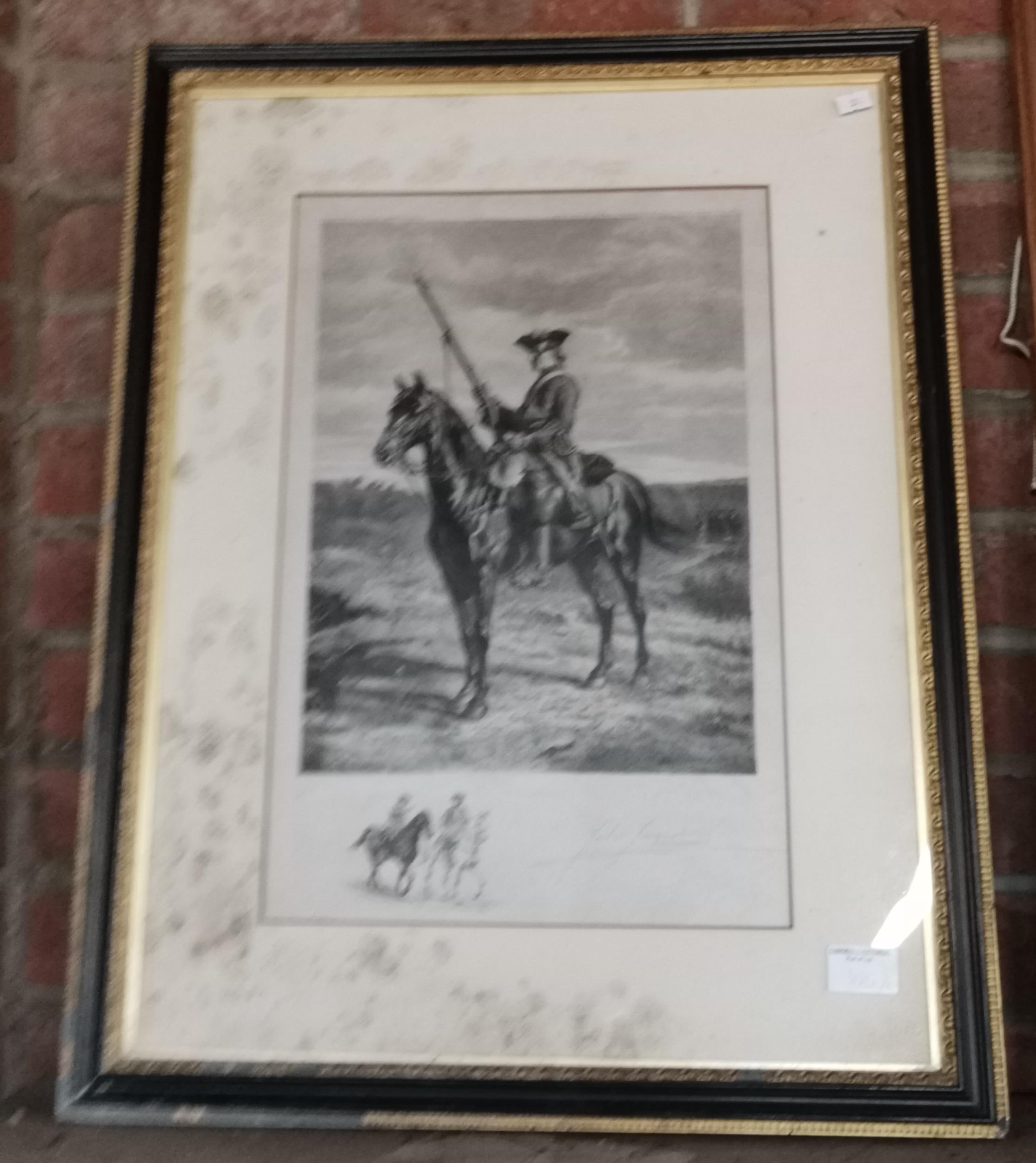 After Jean Louis Ernest Meissonier (French, 1815-1891), French soldier on horseback with rifle raised, dated 1863, published 1902, with remarque of two figures on horseback and signed Jules Fouquet in pencil to margin, framed. (Provenance: from Gainford Hall)