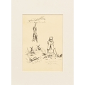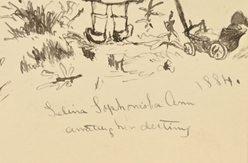 John C Staples (19th century), a pen and ink sketch montage for "Selina's Destiny and The Dead Rabbit", from The Told in The Twilight series (Weatherley), children's book dated 1884. 17 x 12 cm, in modern mount and framed.