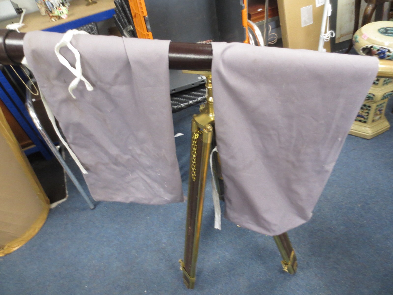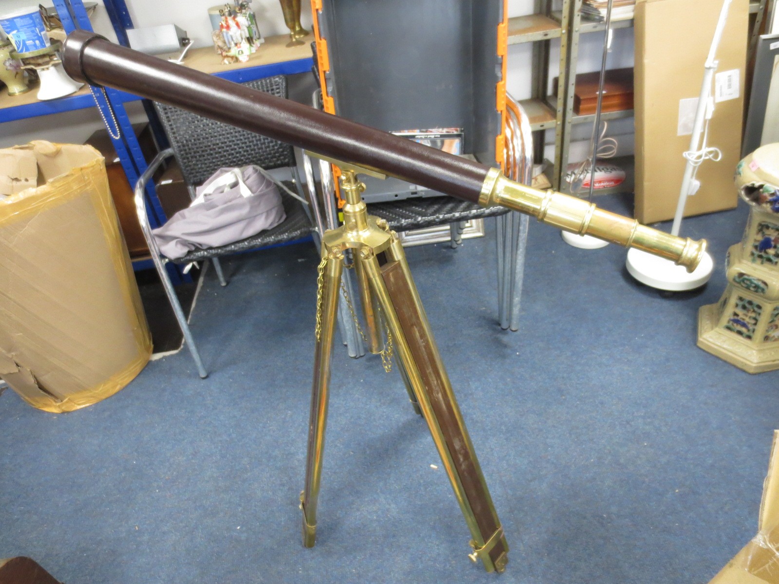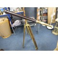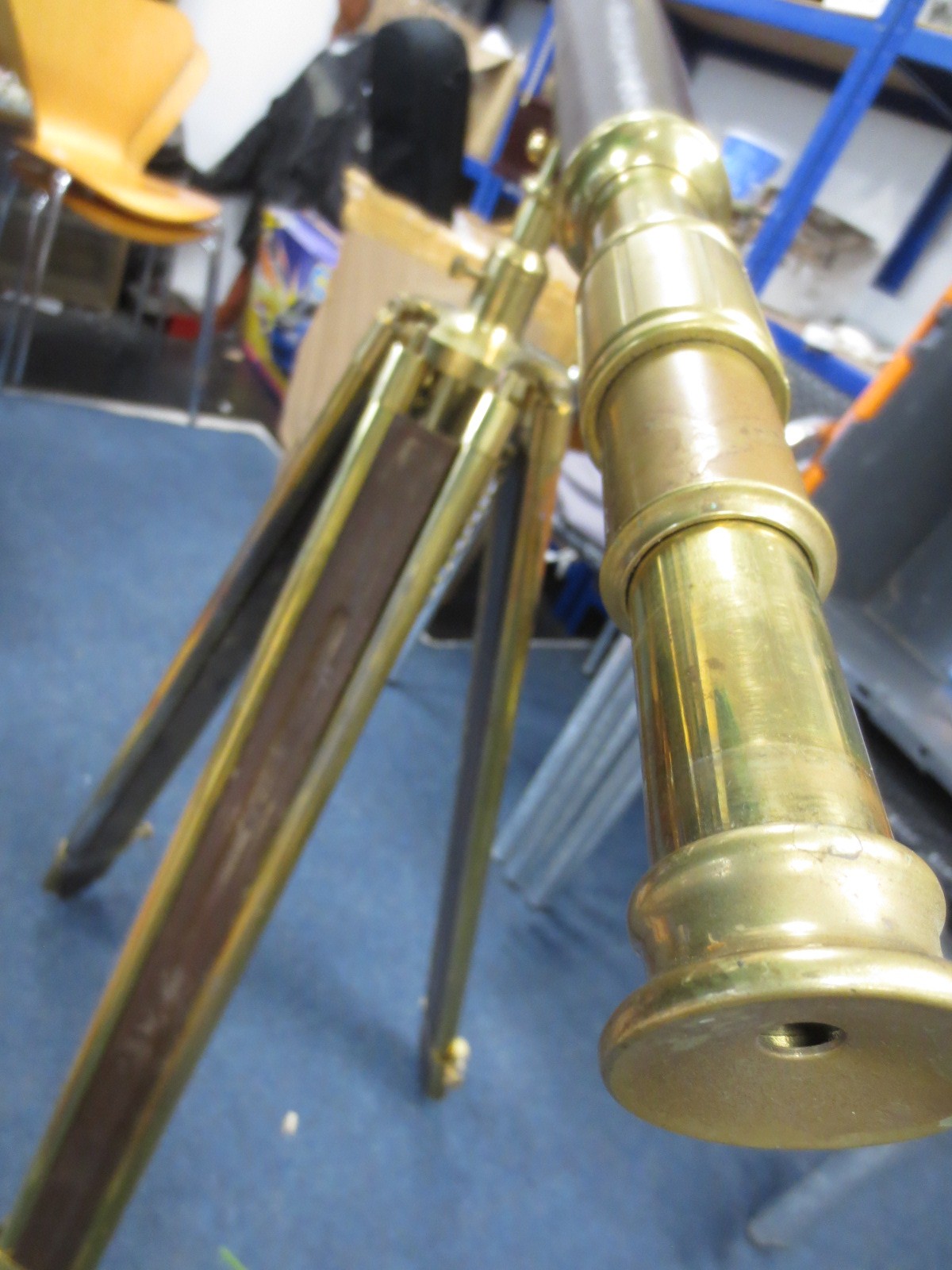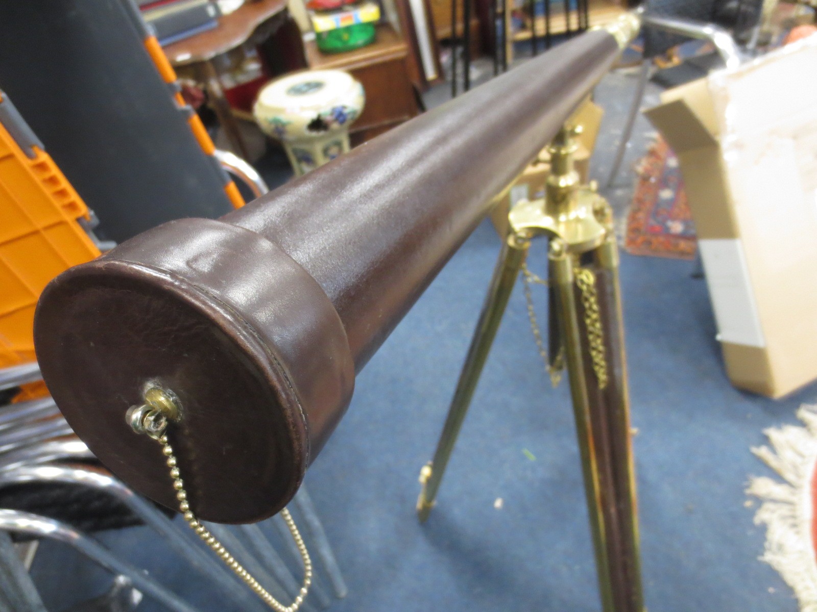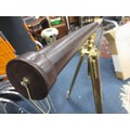 A vintage leather bound brass telescope mounted upon a wood and brass tripod, with cover, in good overall condition