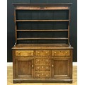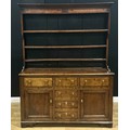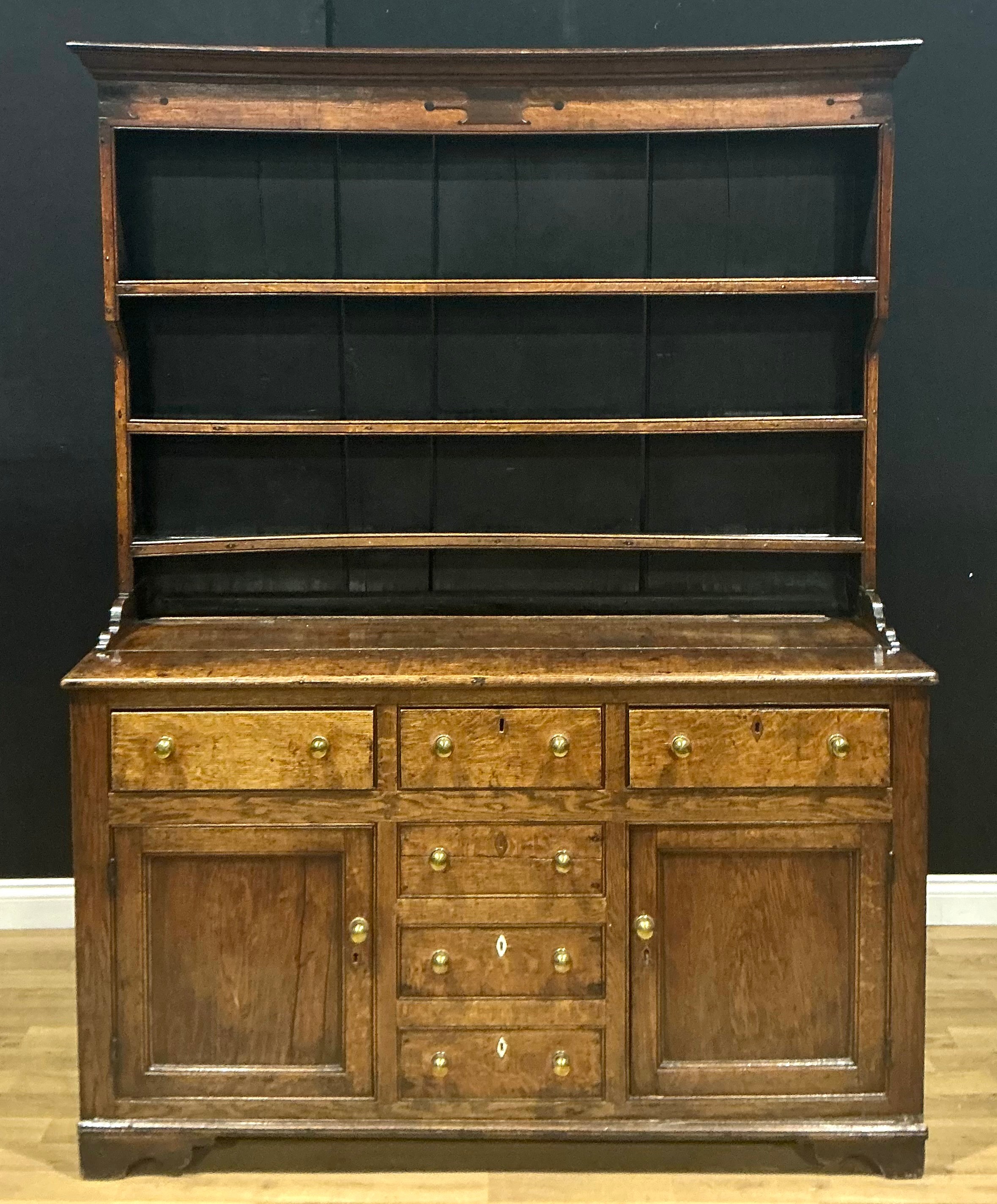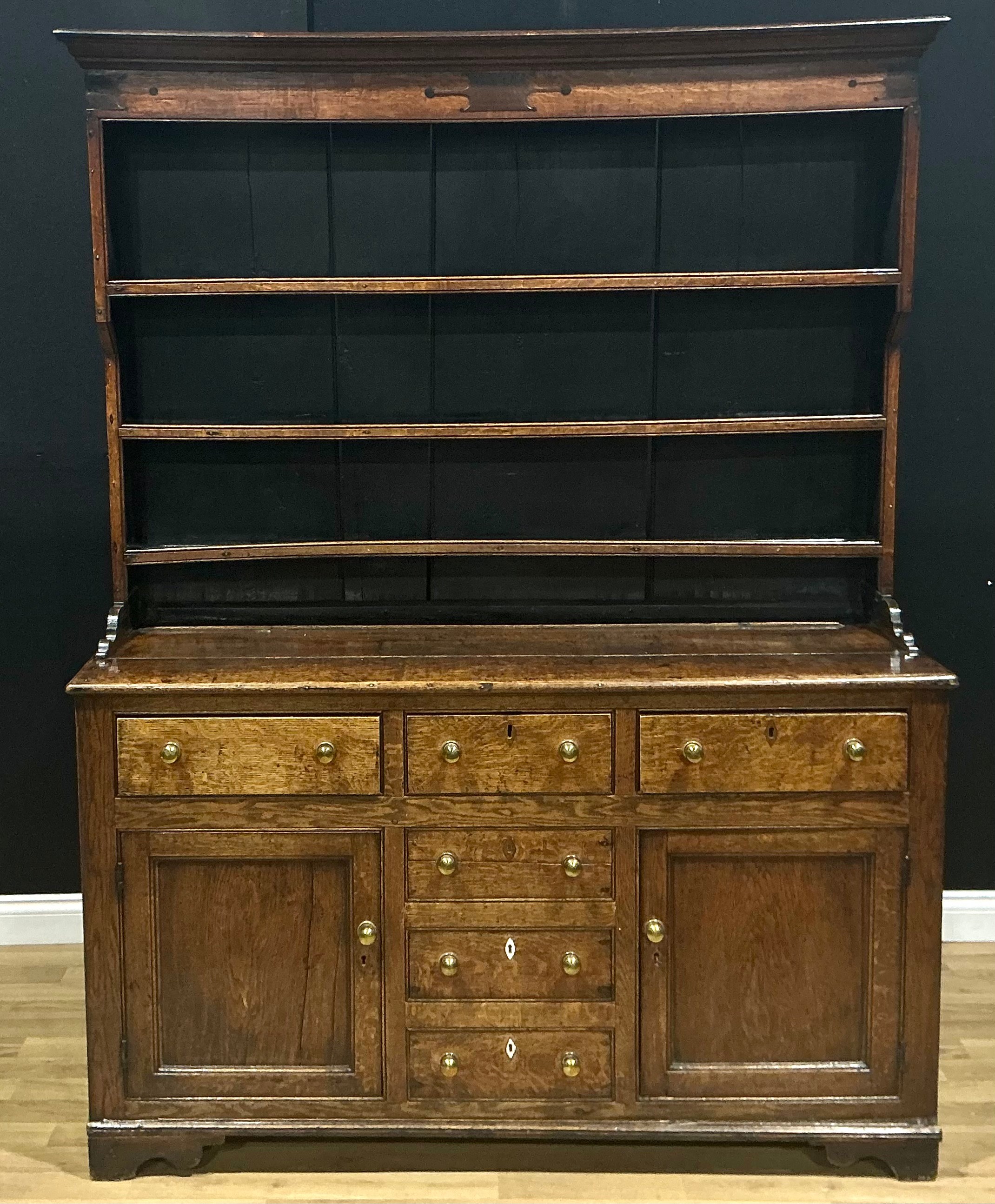 A George III oak dresser, moulded cornice above three plate rack shelves, the projecting base with an arrangement of drawers and doors, bone escutcheons, 207cm high, 161cm wide, 49cm deep, c.1810