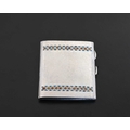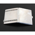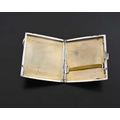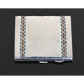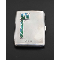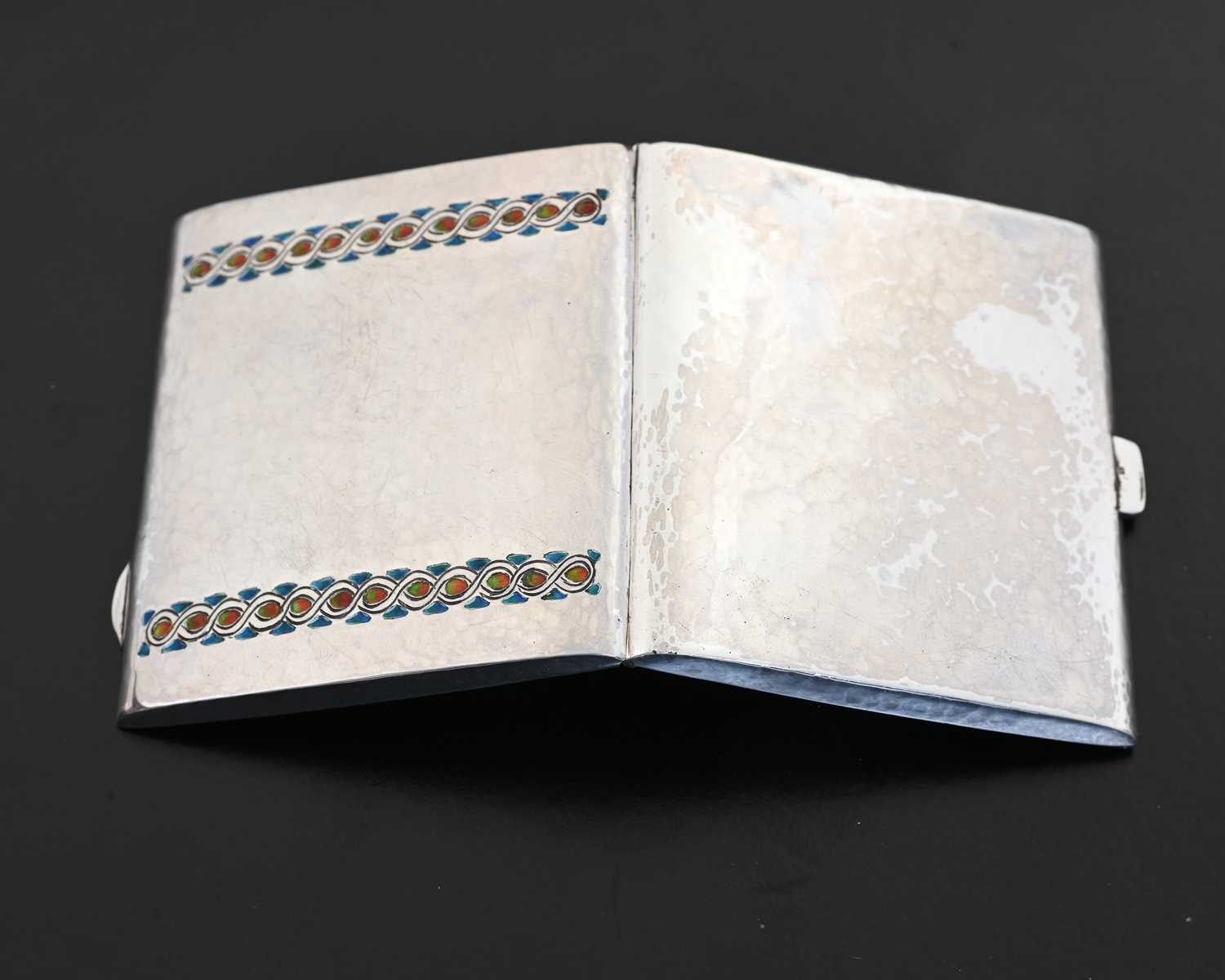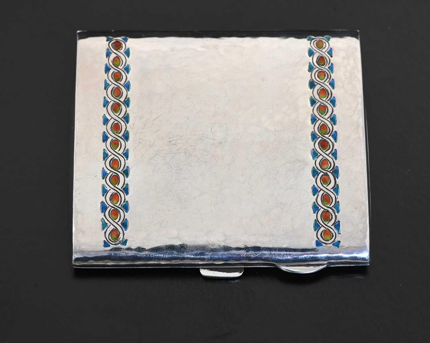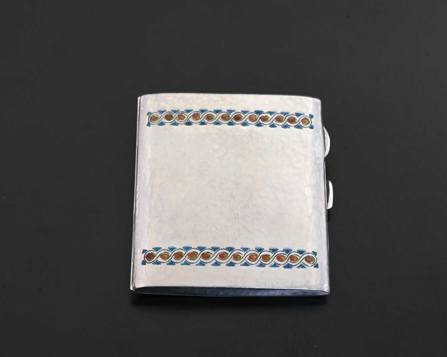 Bernard Cuzner for Liberty and Co., an Arts and Crafts silver and enamelled cigarette case, Birmingham 1929, planished rectangular form, two bands of champleve enamel Greek Guilloche design in blue, range and green, 7.5cm x 8.5cm, 3.66ozt