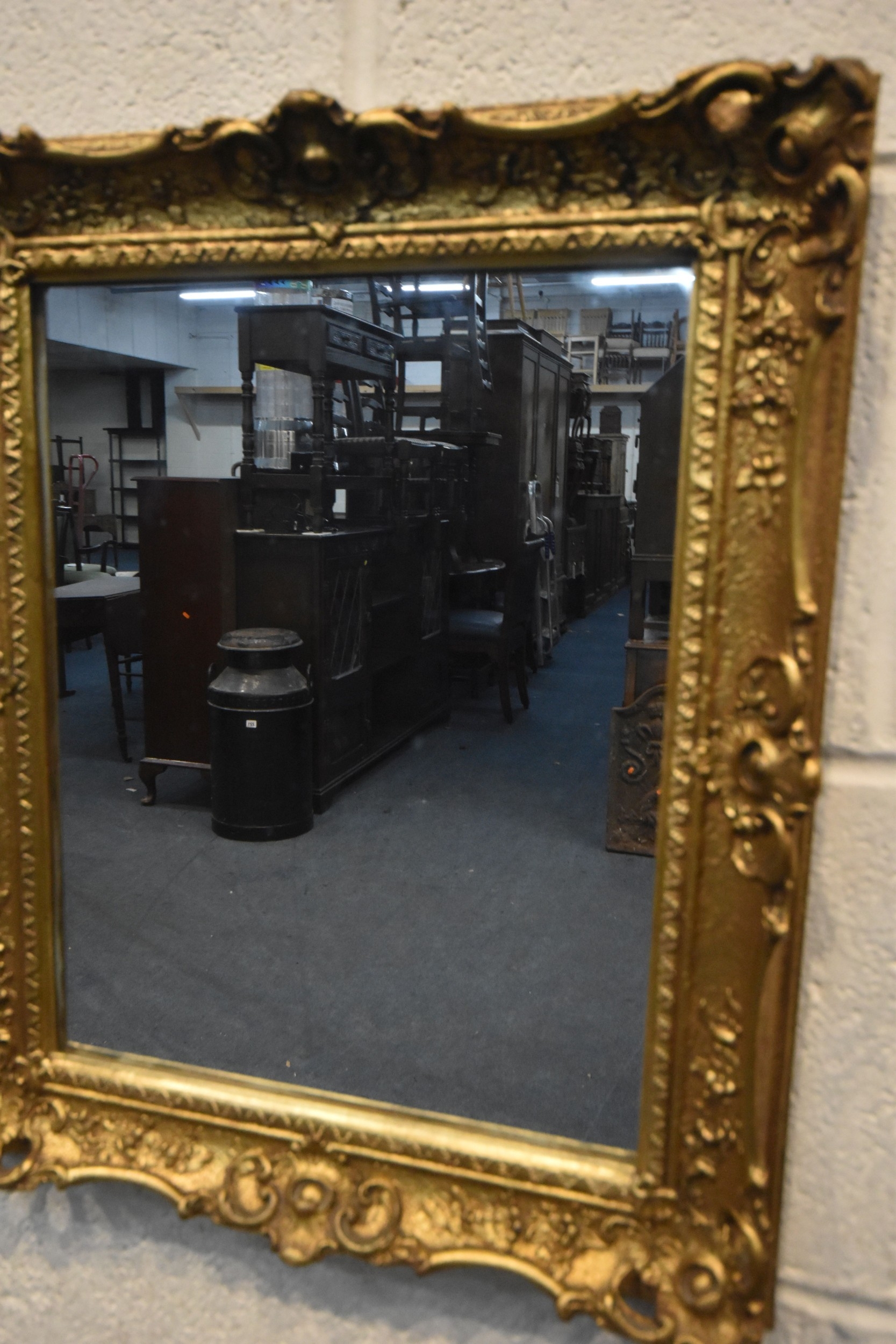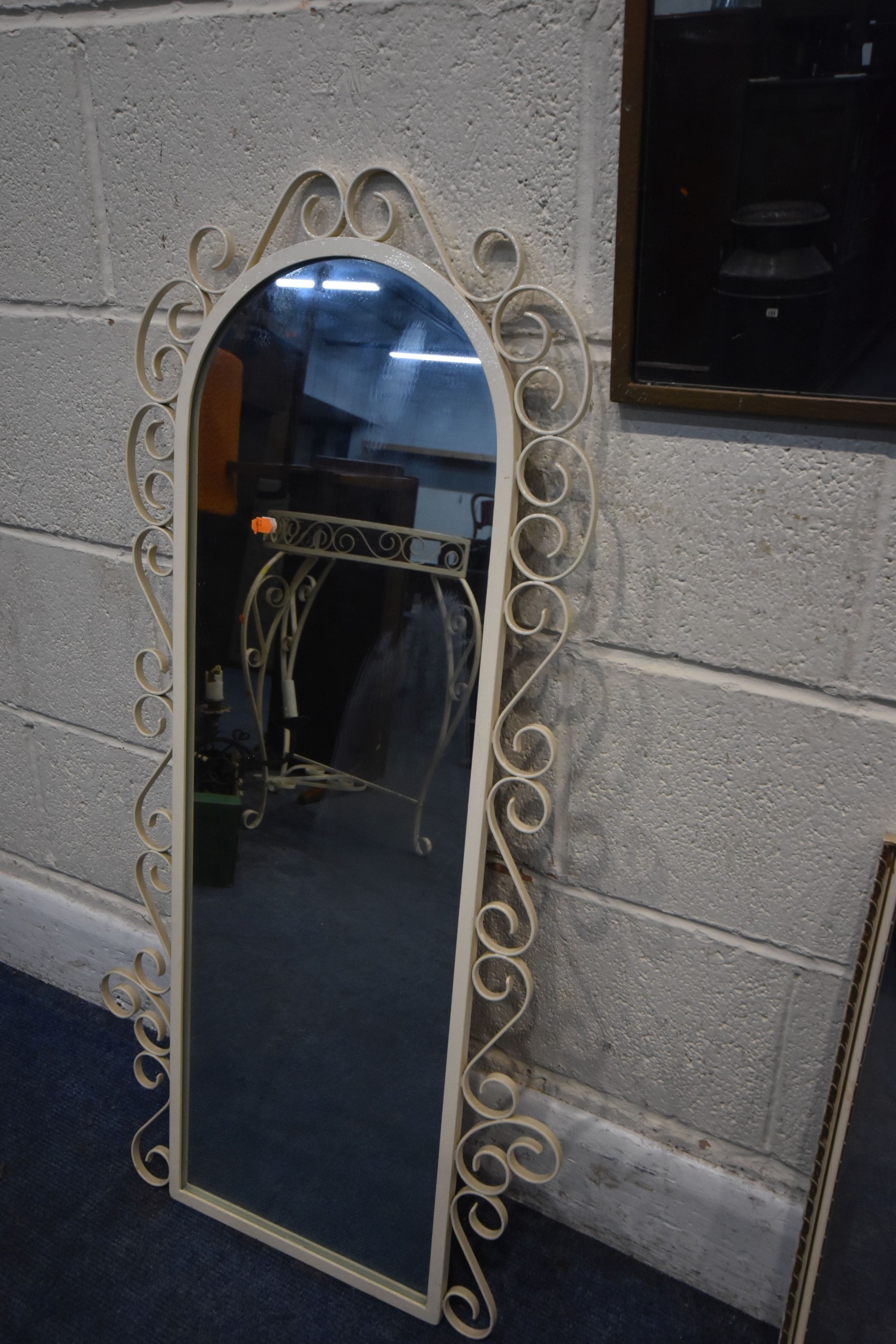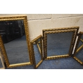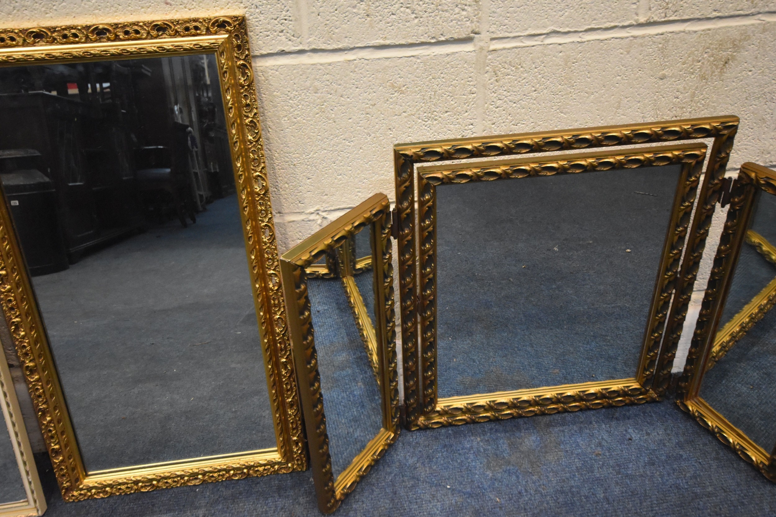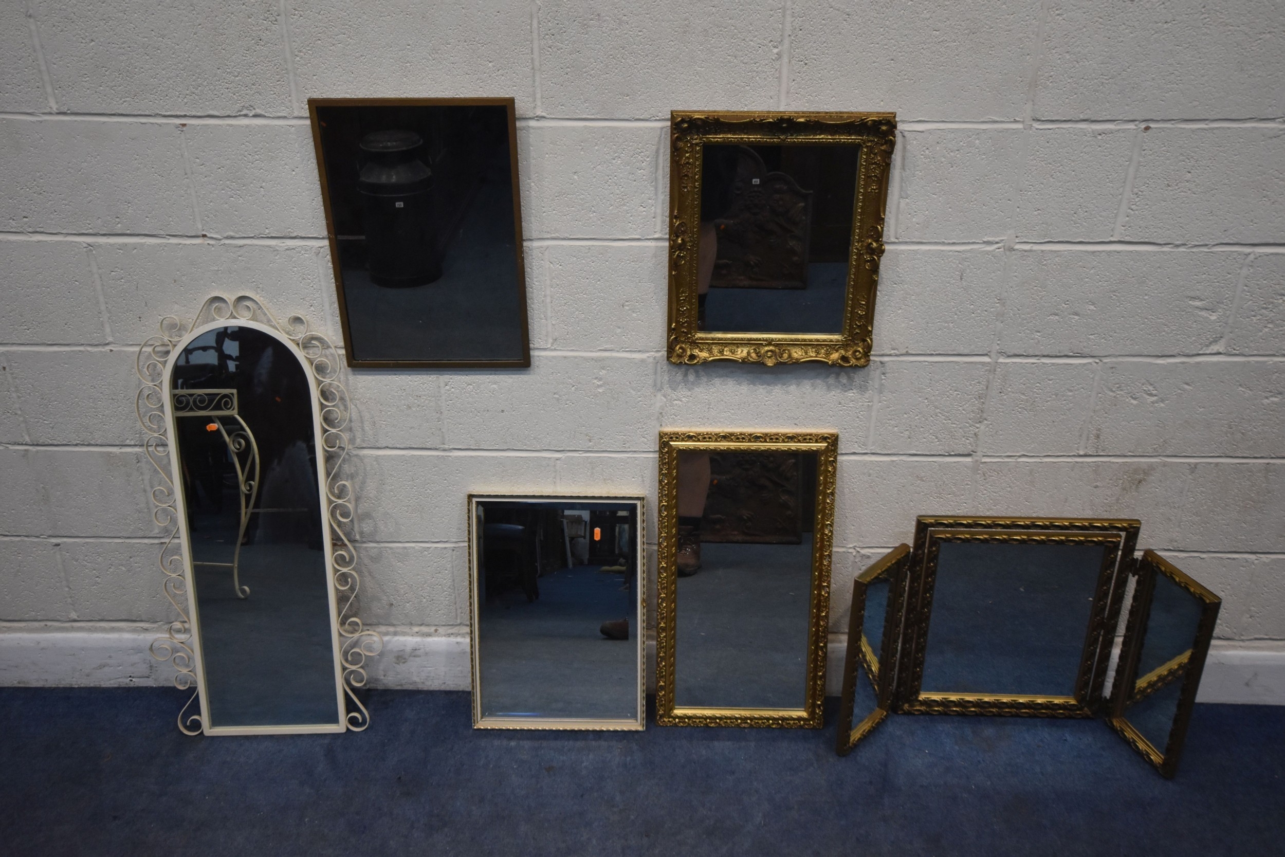 FOUR VARIOUS GILT FRAME MIRRORS, comprising a triple dressing mirror and three wall mirrors, along with a white painted wrought iron mirror, and another mirror, condition report: general signs of wear to frames (6)