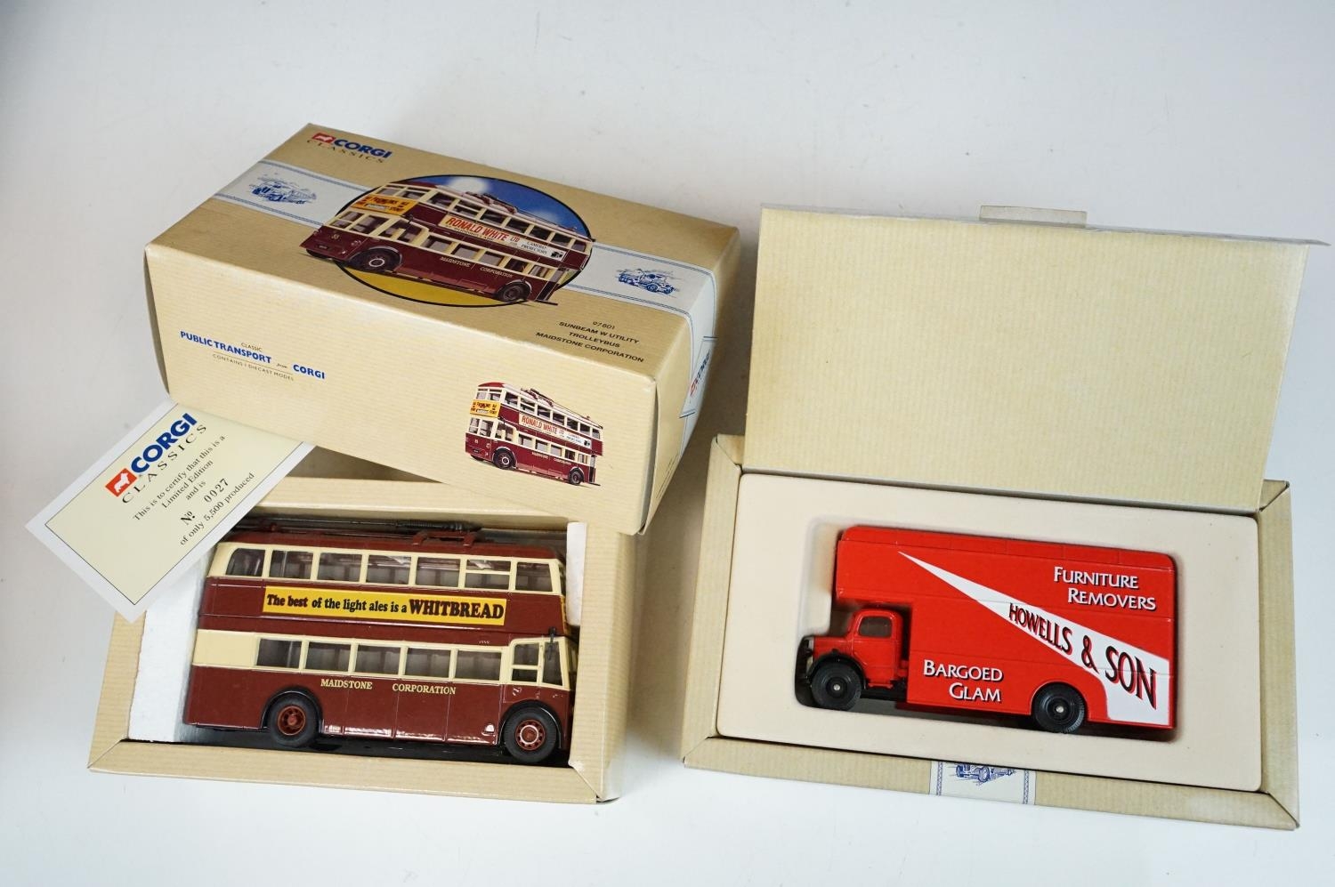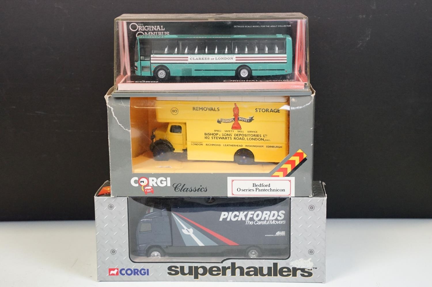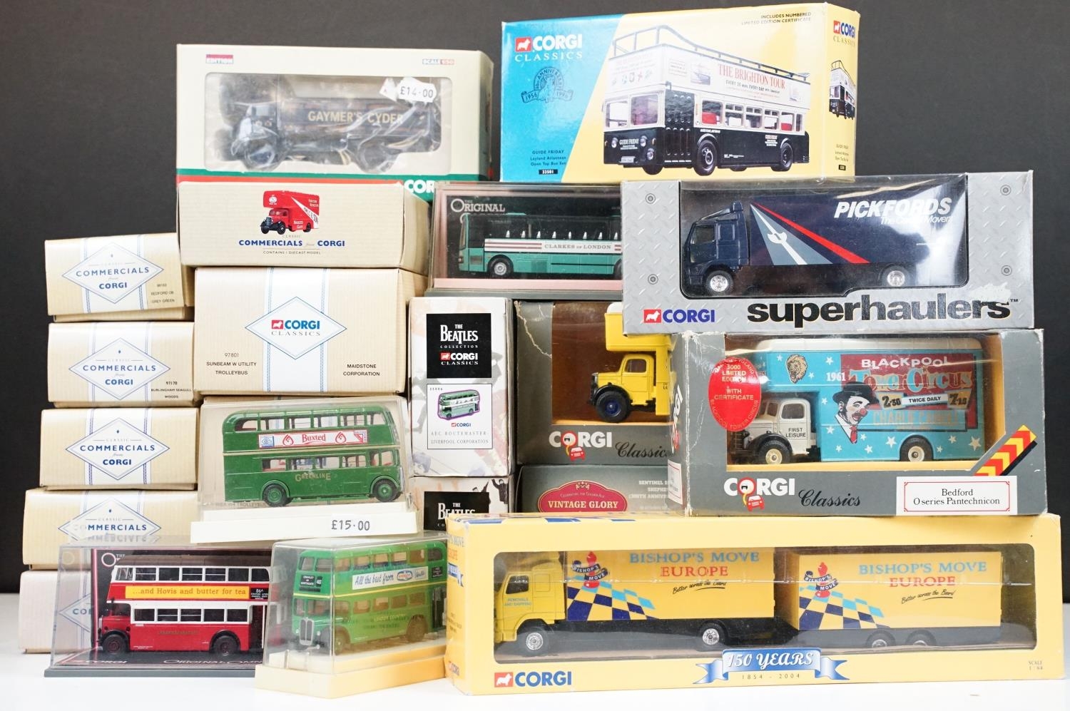 23 Boxed Corgi diecast models to include 6 x Commercials, 3 x Public Transport, Corgi Original Omnibus Bus Operators In Britain, Corgi Classics 33501, The Beatles Collection 35006, Vintage Glory Of Steam 80003, 150 Years Bishop & Sons TY86712, ltd edn Road Transport Heritage The Golden Years CC13310, etc, diecast ex, boxes vg overall