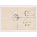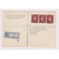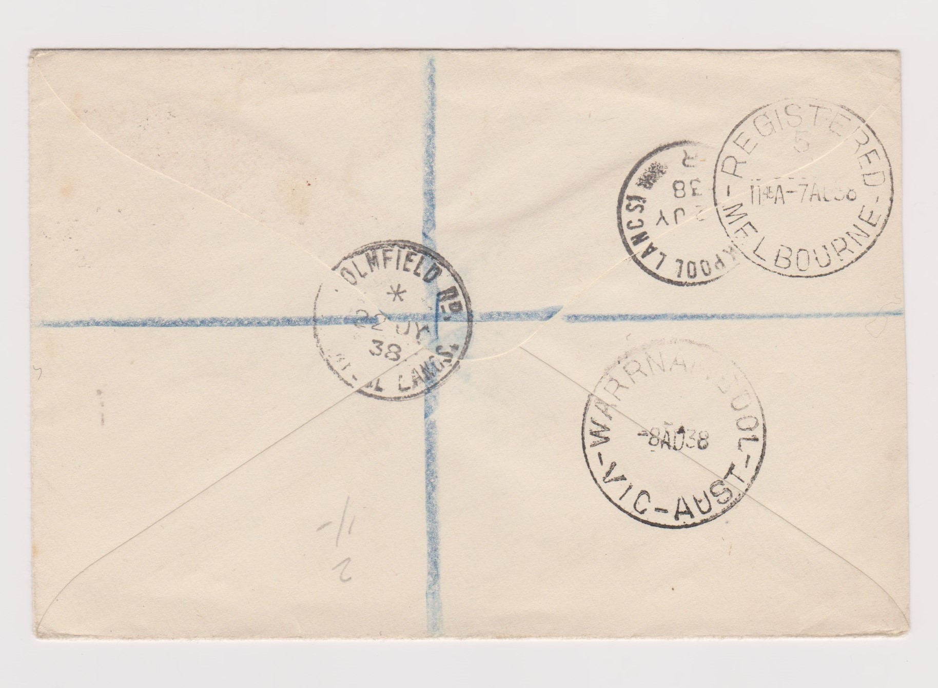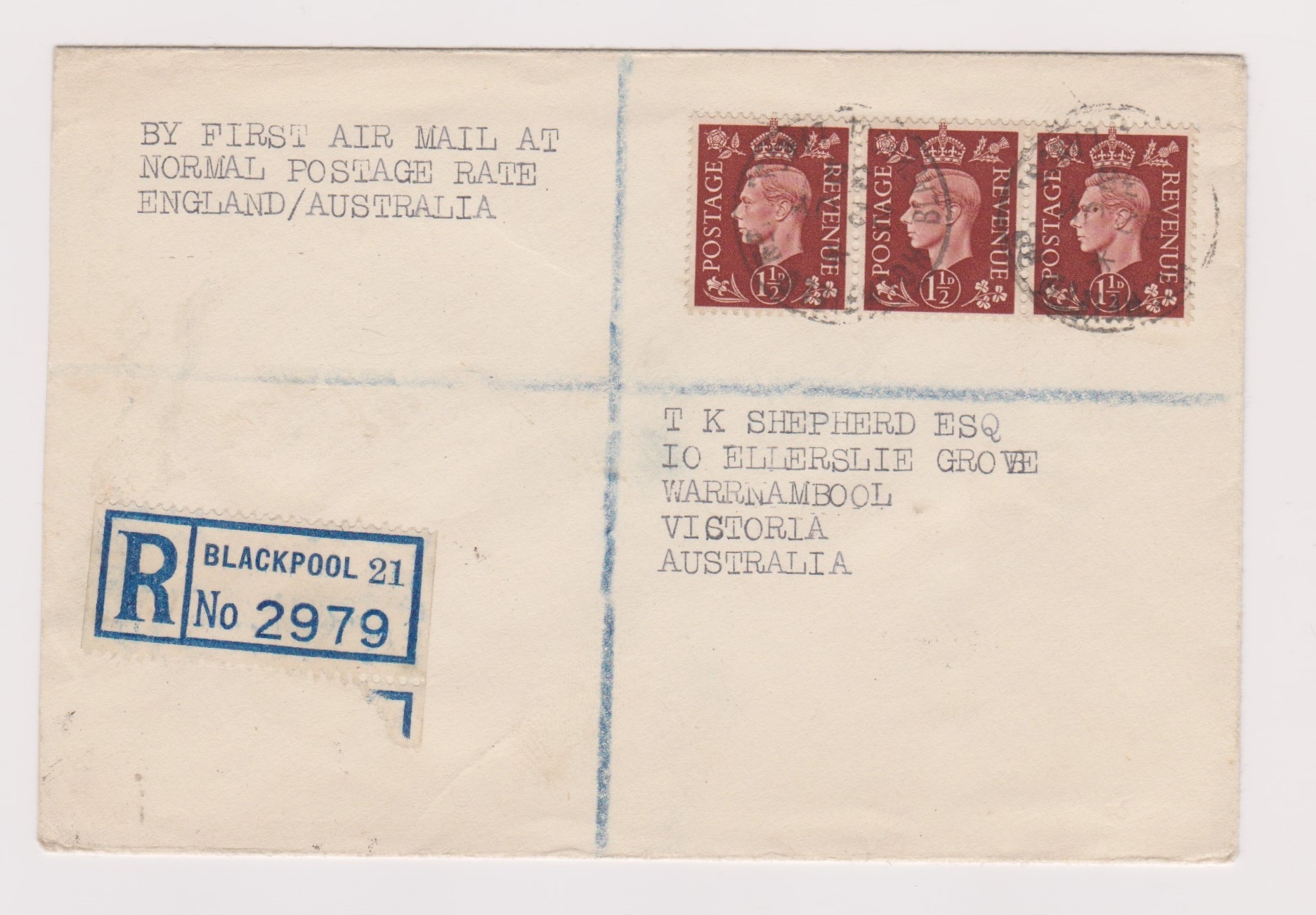 Great Britain 1938-envelope annotated First Air Mail at normal postage rate England to Australia posted registered cancelled 27.7.38 Blackpool on strip of (3) SG464 1.1/2d 4x transit cancels on reverse