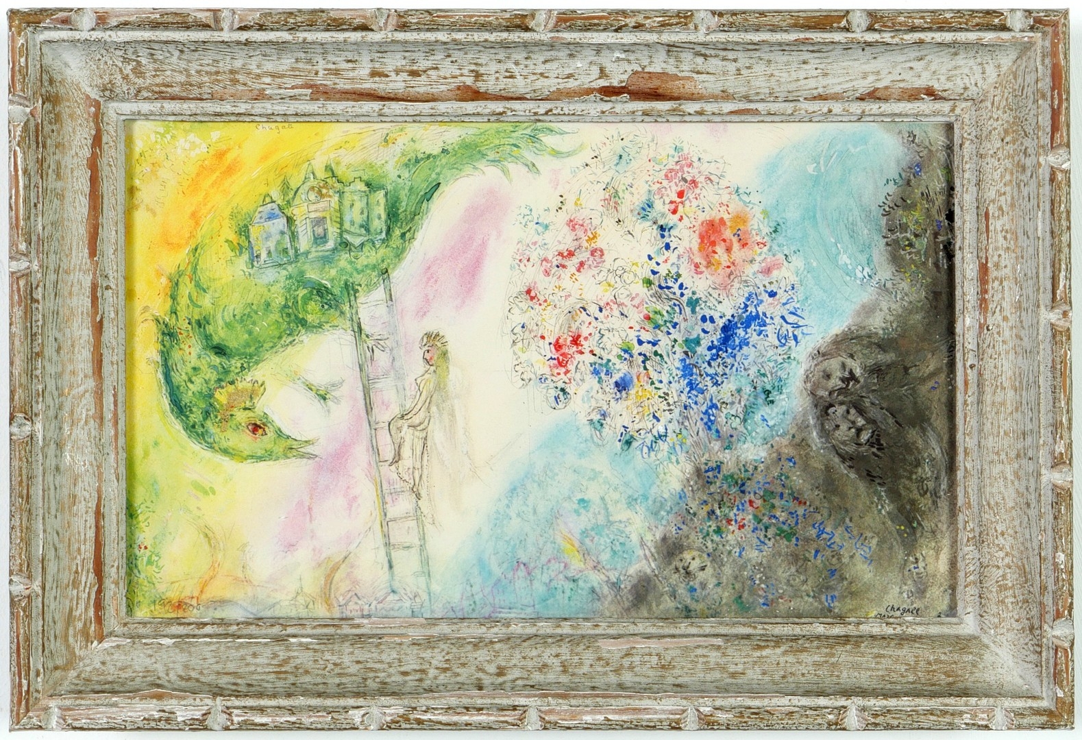 MARC CHAGALL. ENCHANTED CASTLE. signed in the plate, numbered collotype from an edition of 200, 1961, French vintage frame, 31.5cm x 19cm.
