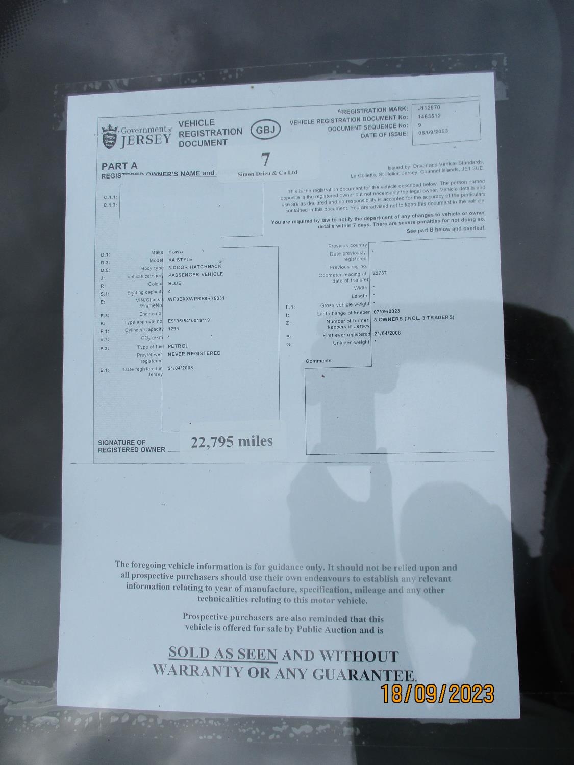 A 2008 Ford KA Style 1.3 three door hatchback J112570 (petrol/manual), odometer reading 22,795 miles only