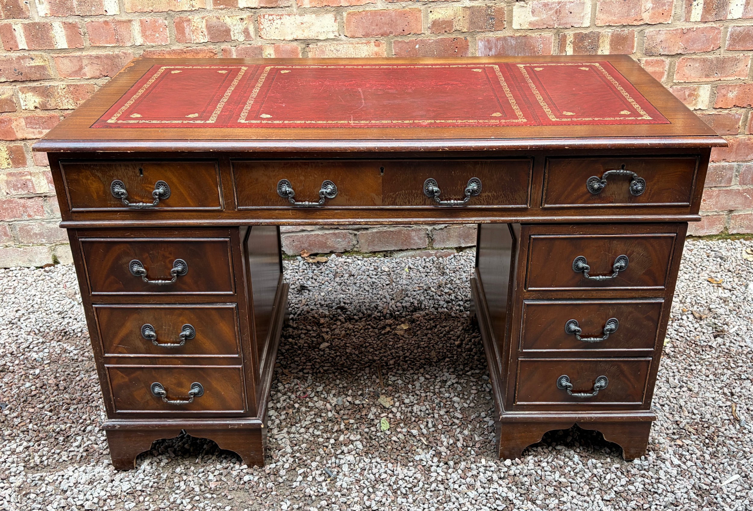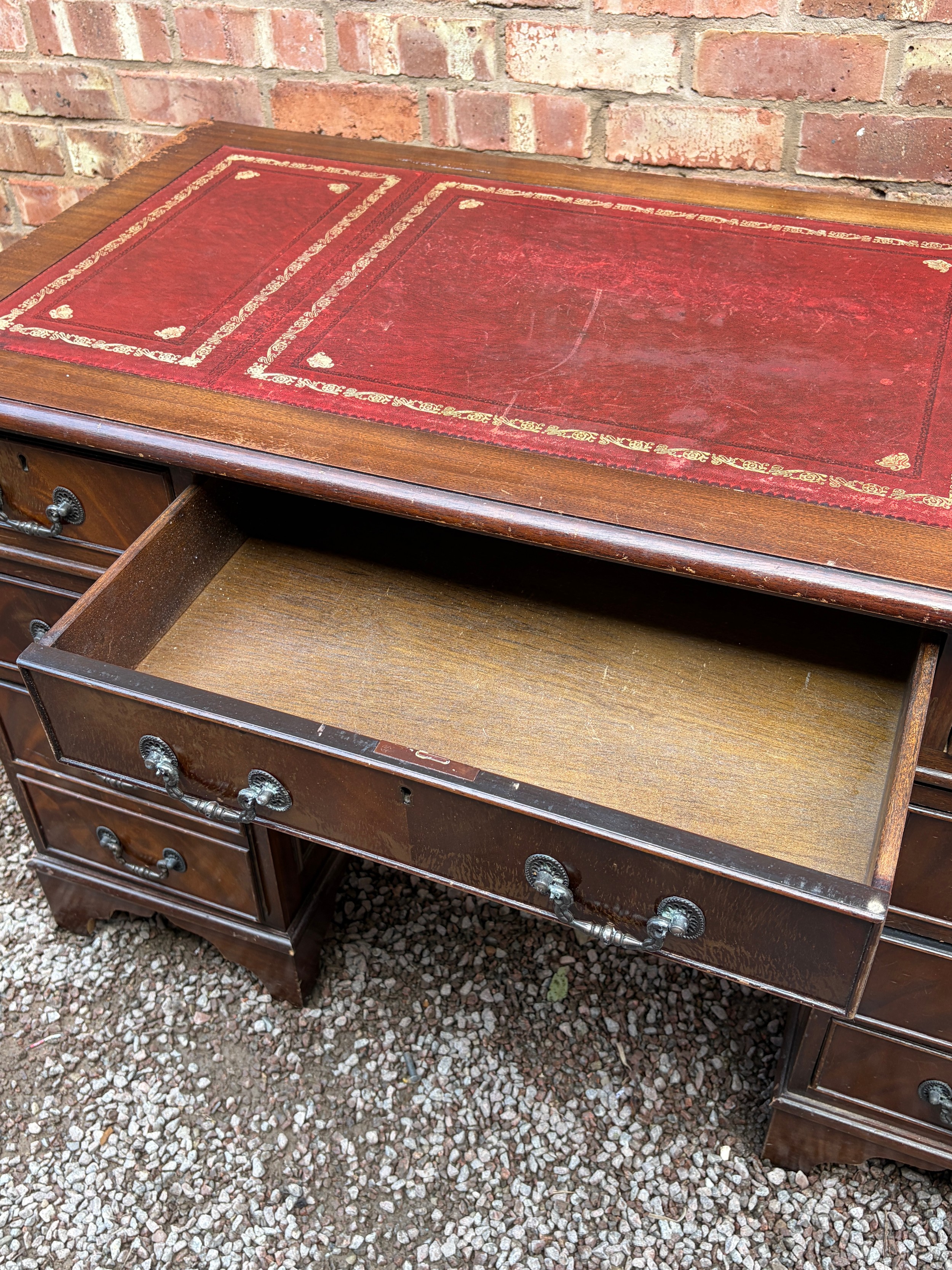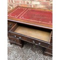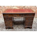 REPRODUCTION GEORGIAN STYLE MAHOGANY NINE DRAWER KNEEHOLE DESK WITH RED LEATHER SCIVER