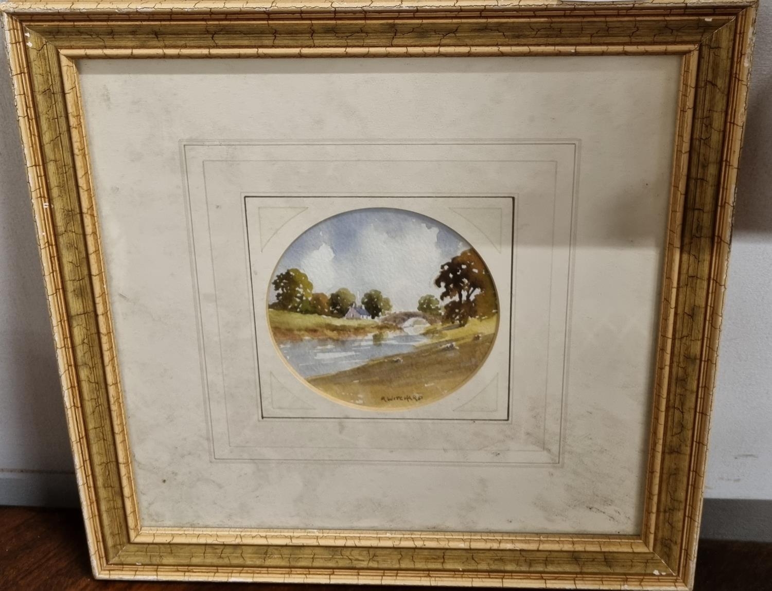 A 20th Century Watercolour of a river scene signed R Witchard at bottom. 12 x 12 cm approx.
