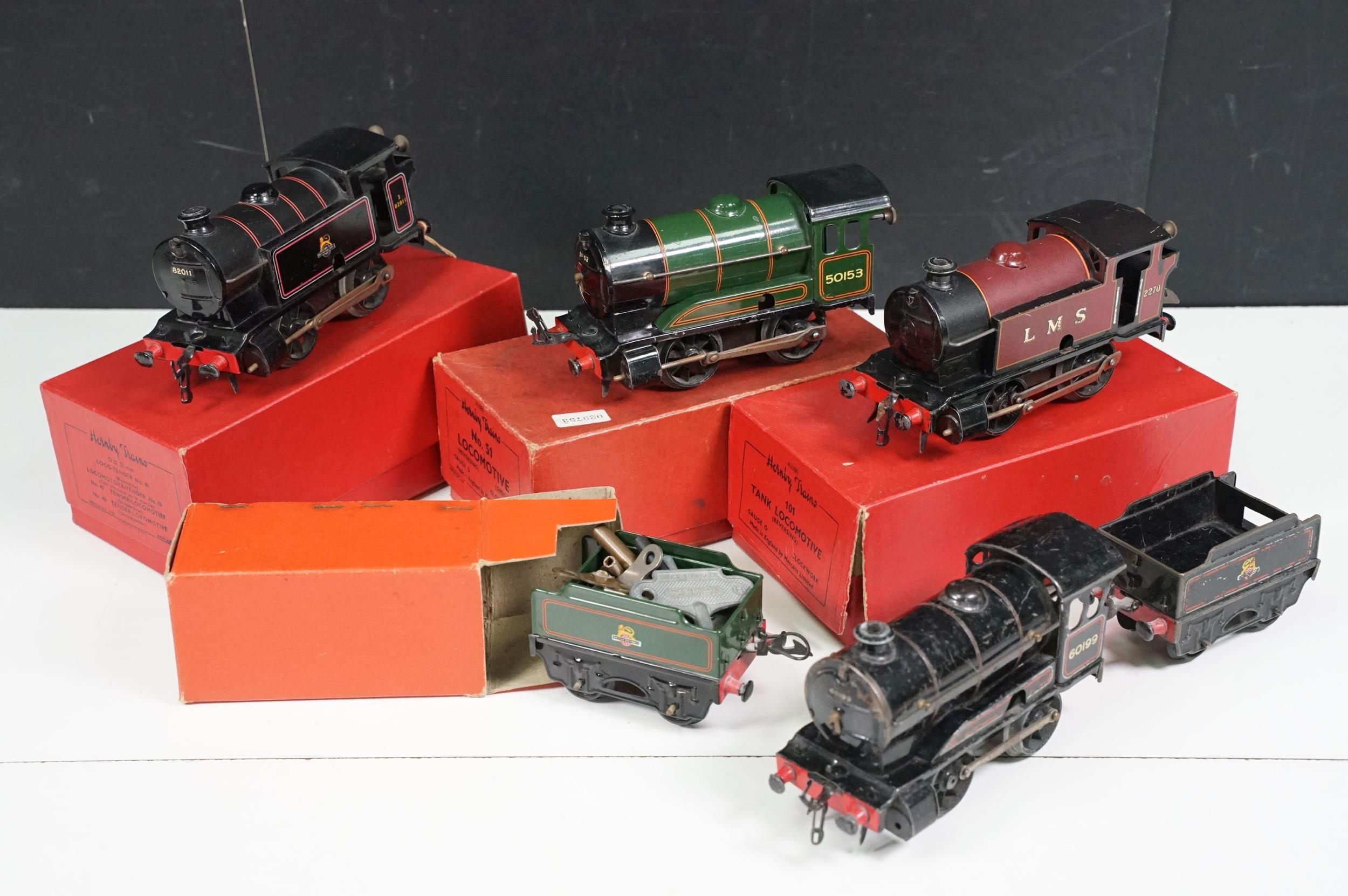 Three boxed Hornby O gauge locomotives to include 101 Tank Locomotive LMS 2270, No 40 Tank Locomotive in black and No 51 Locomotive in green plus a boxed Tender No 51 and a play worn Hornby 60199 0-4-0 locomotive with tender in black livery (5 items)