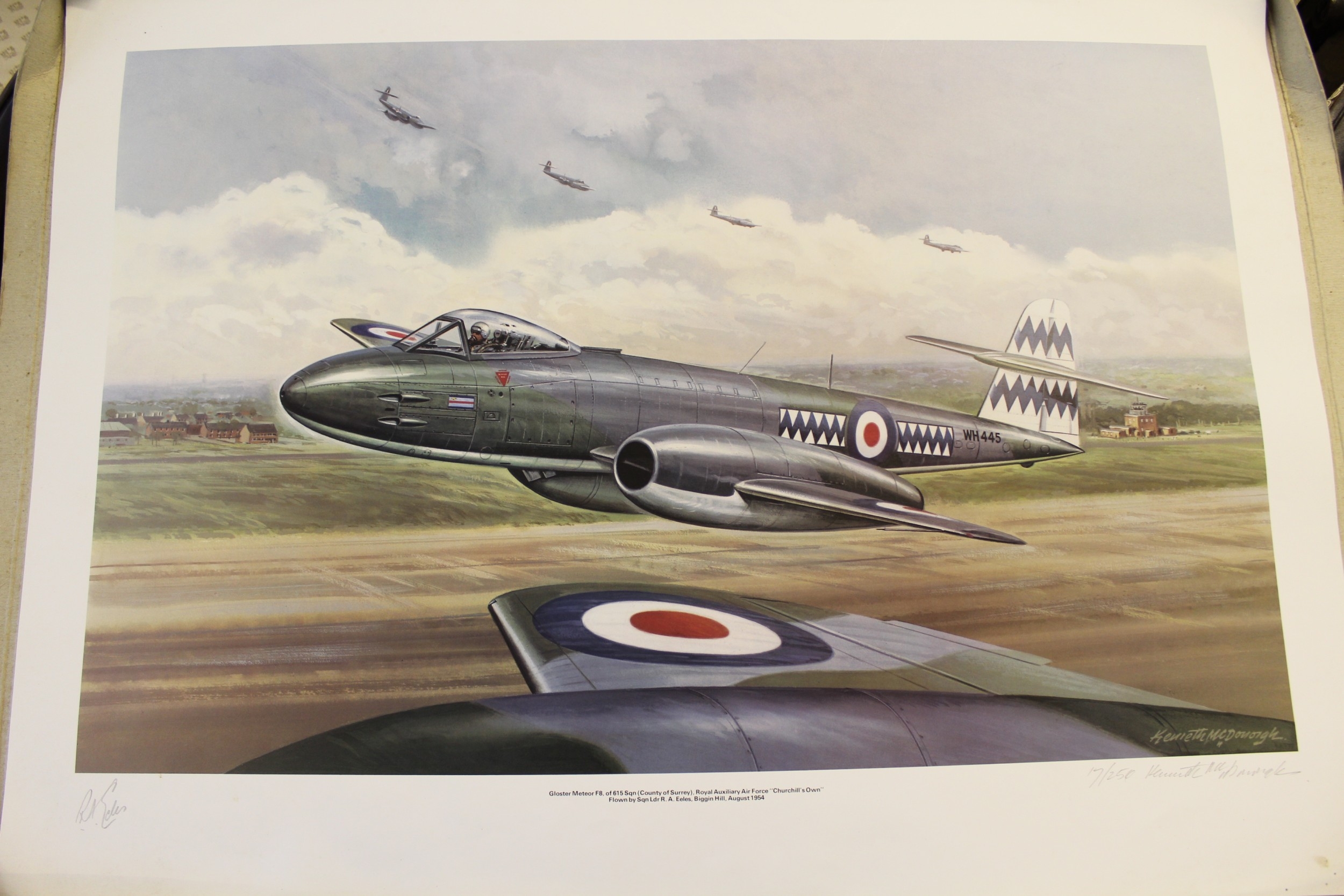 Two Kenneth McDonough signed Limited Edition coloured prints, titled ' Camel Flight ' and another of a Gloucester Meteor F8, with certificates, 50 x 66cm, both unframed