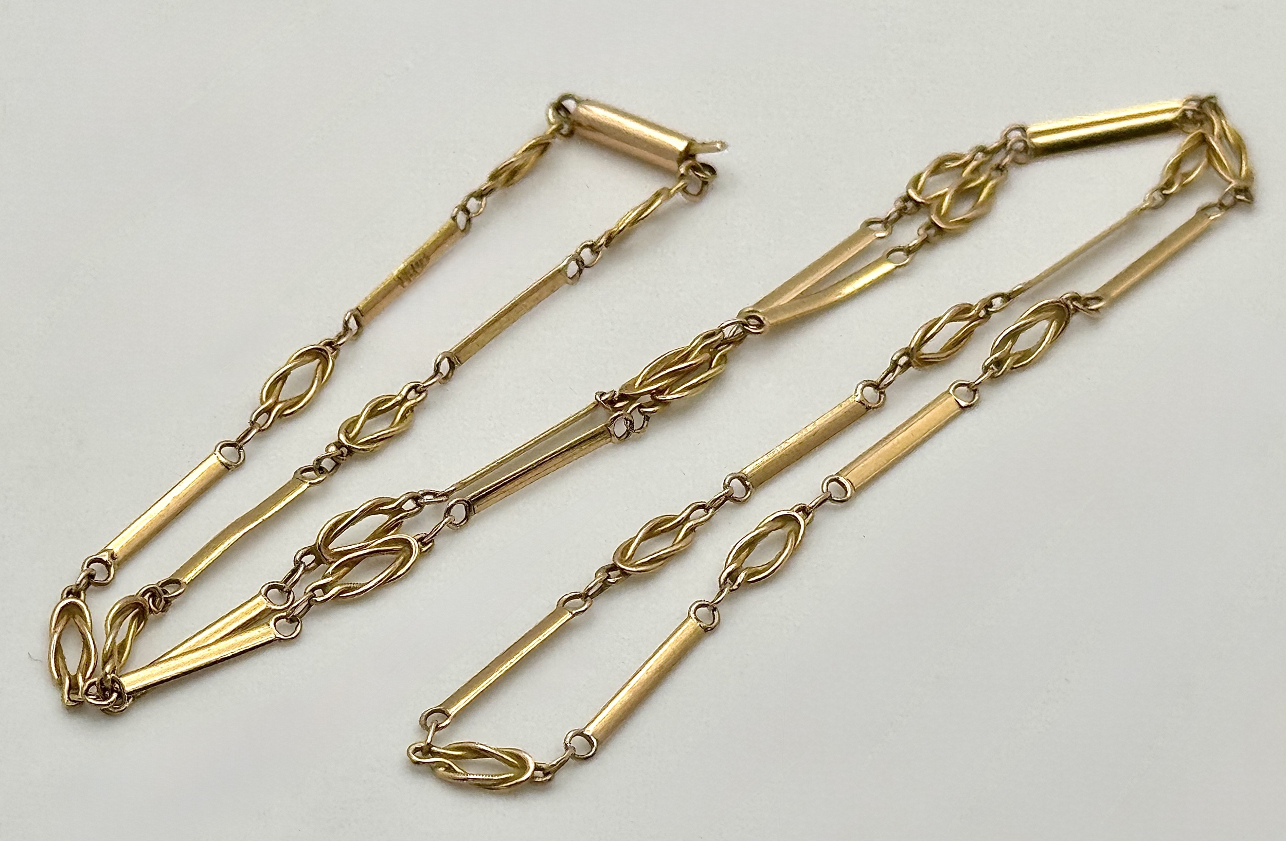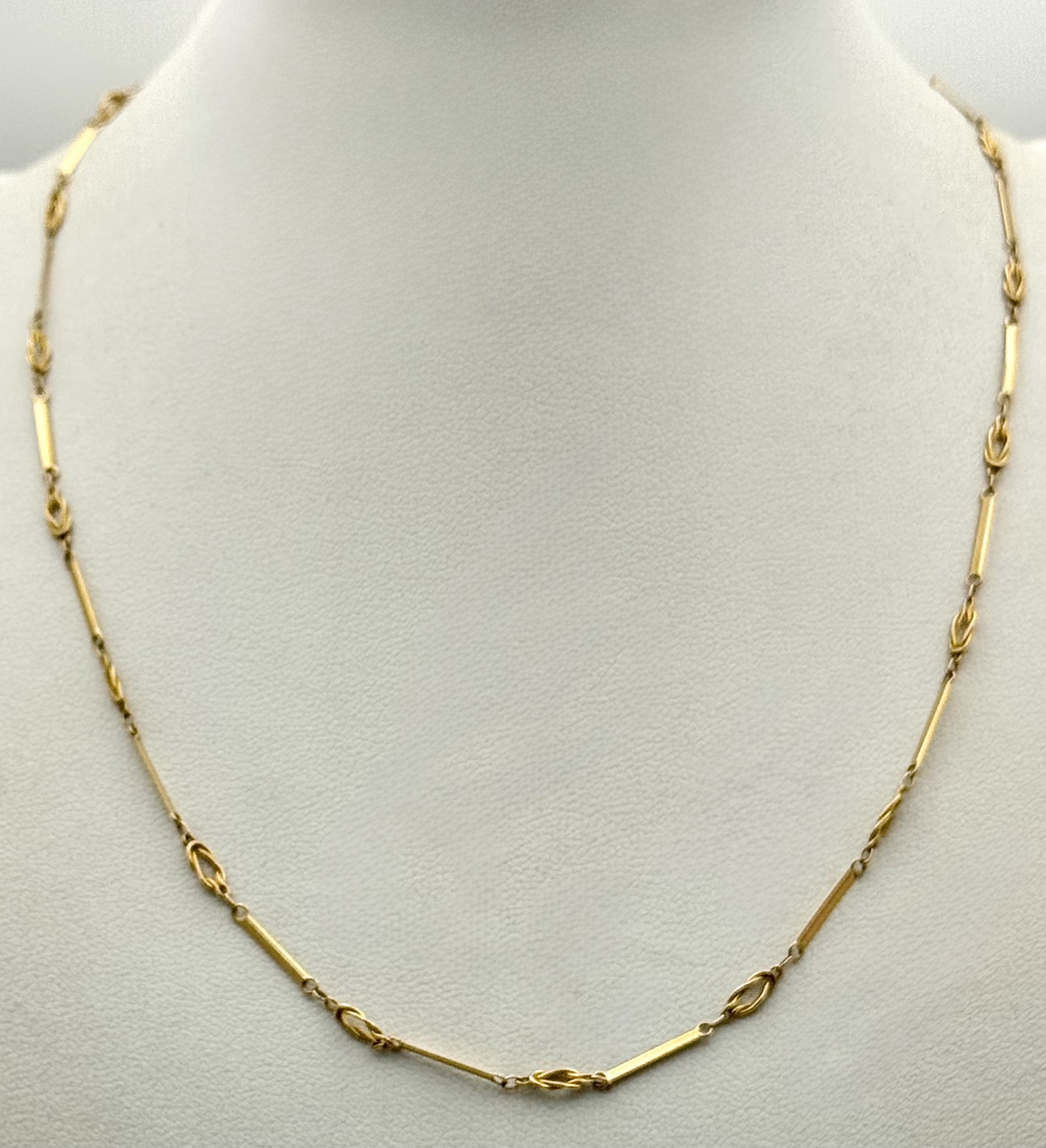 A Very Elegant Vintage 15K Yellow Gold Bar and Link Necklace- 44cm Length. 3.11 Grams.