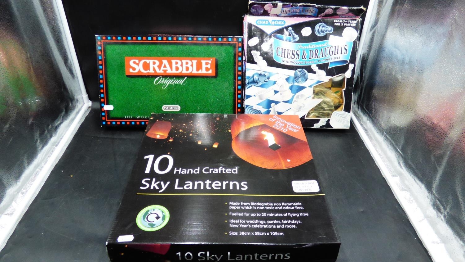 Boxed Scrabble, Chad Valley Chess & Draughts & 10 Sky Lanterns