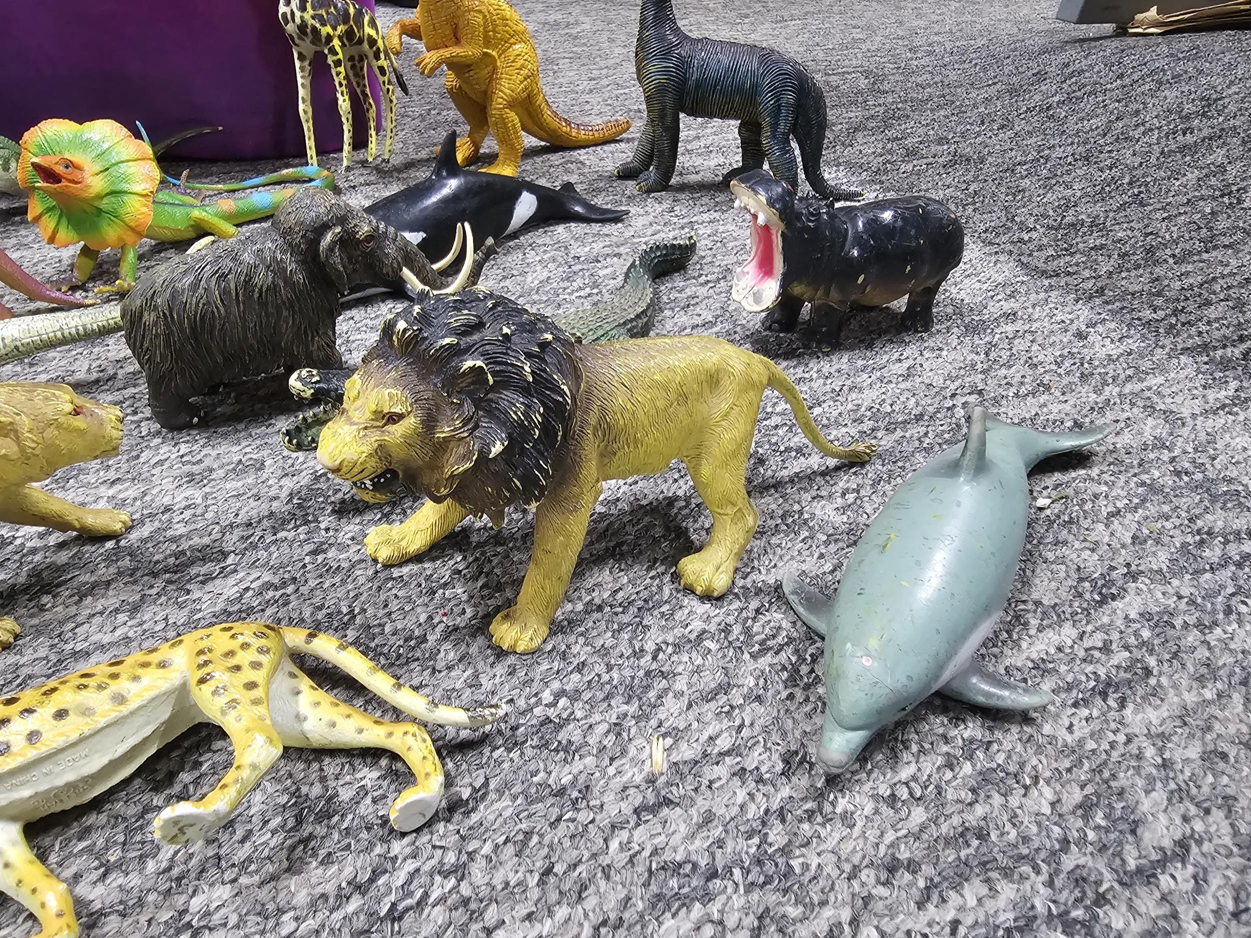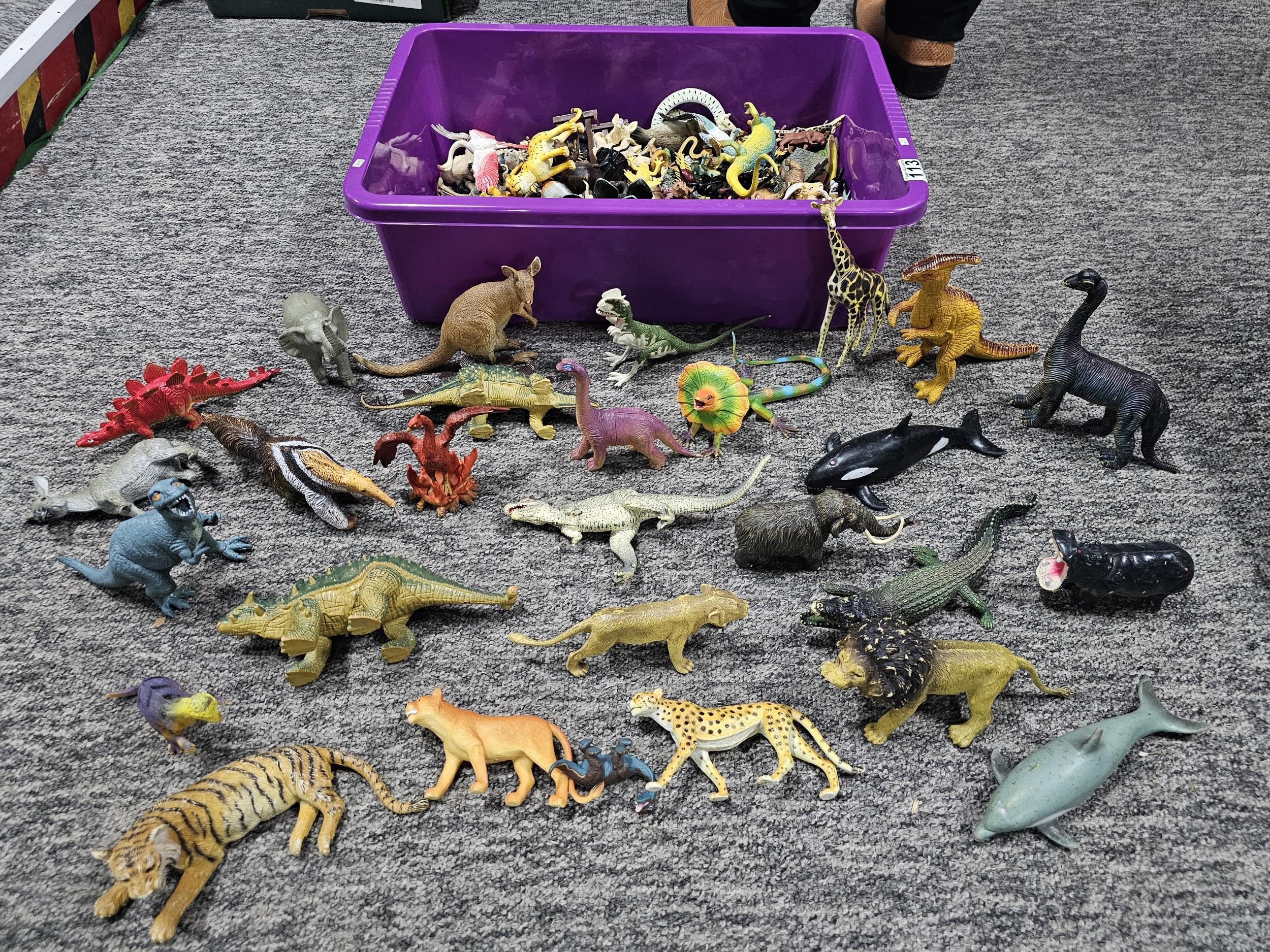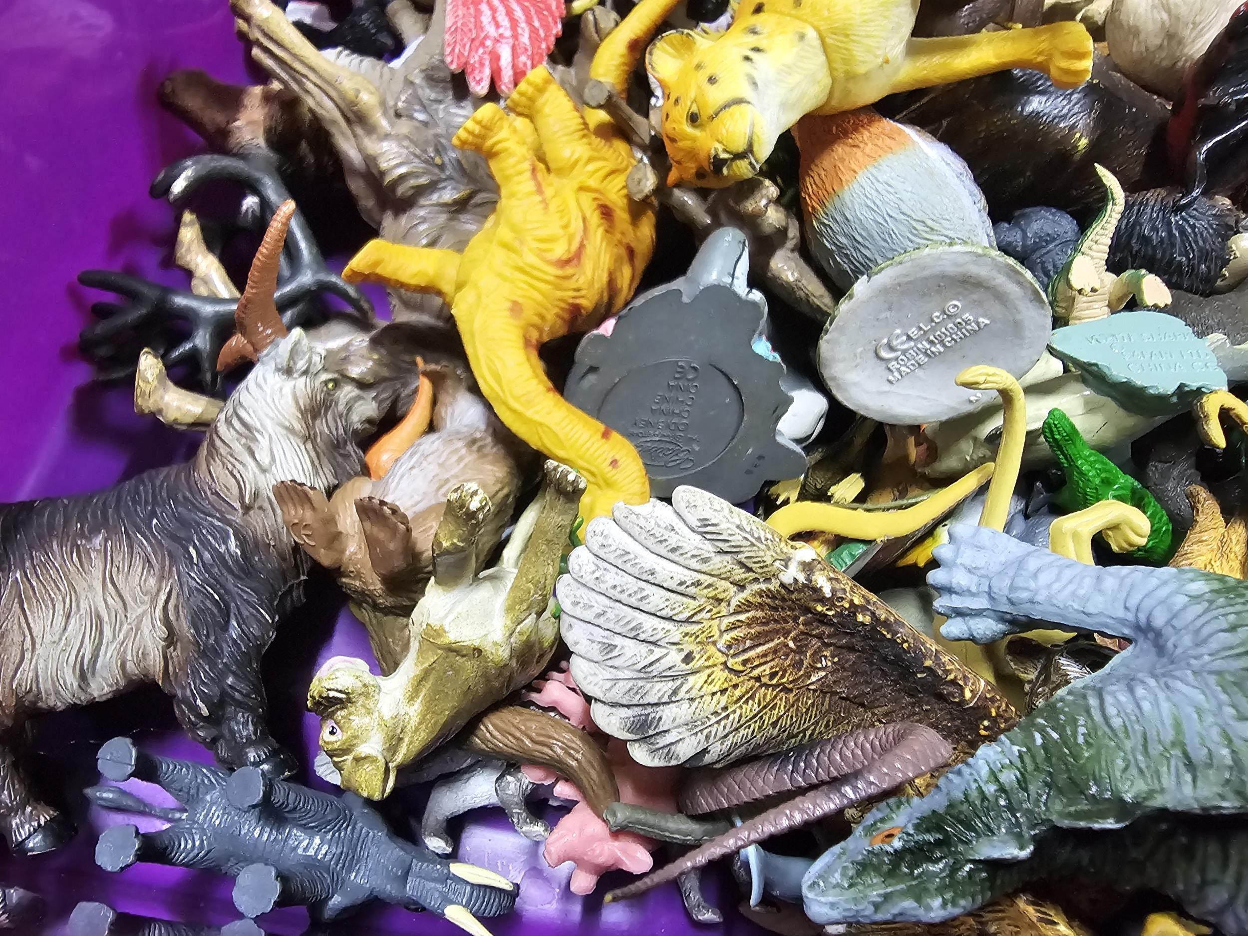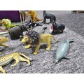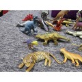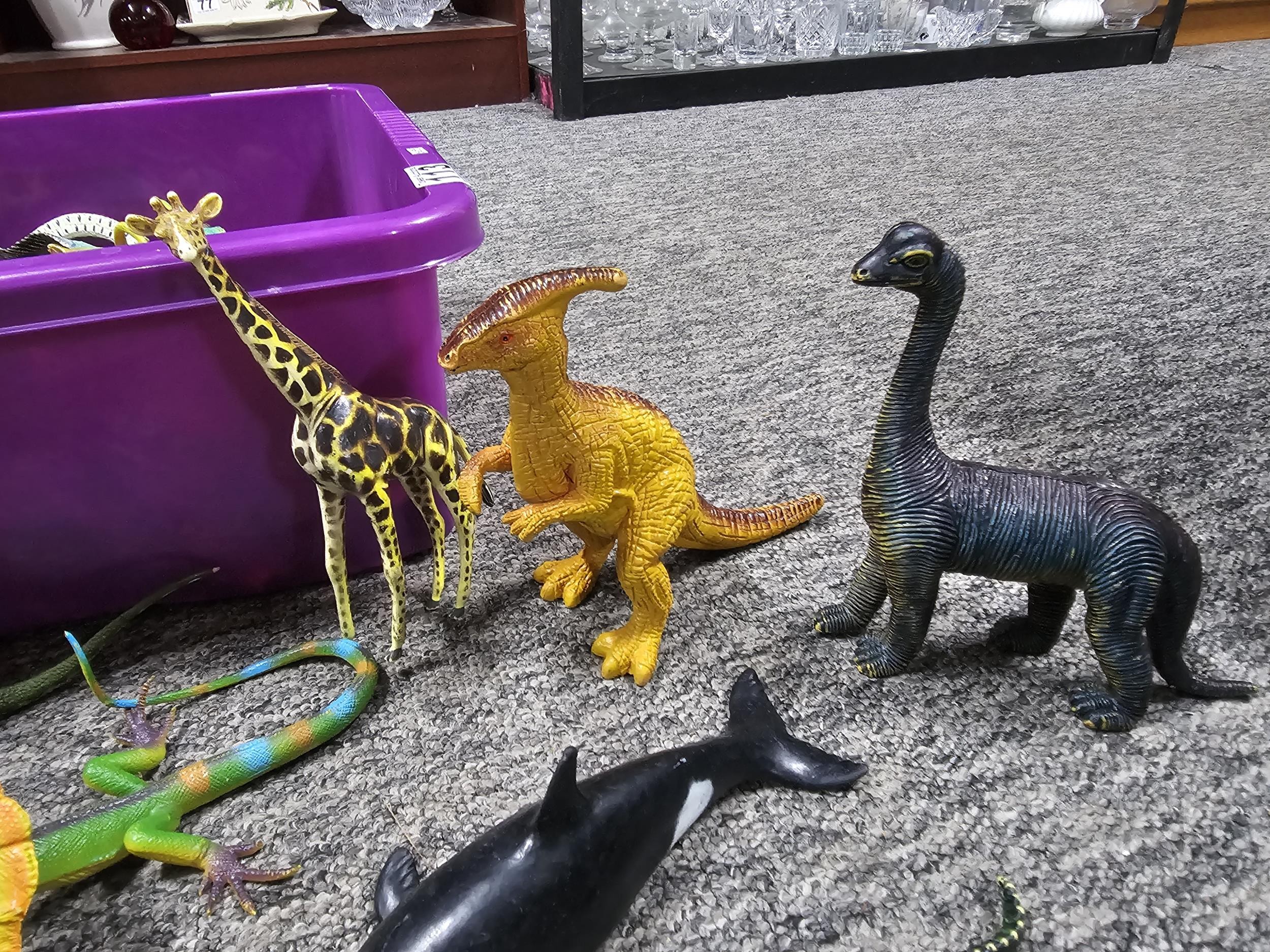 Collection of rubber and plastic toys in the form of dinosaurs and zoo animals to include an articulated dinosaur tigers, phoenix, crocodile etc all appear to be in good order and colourful