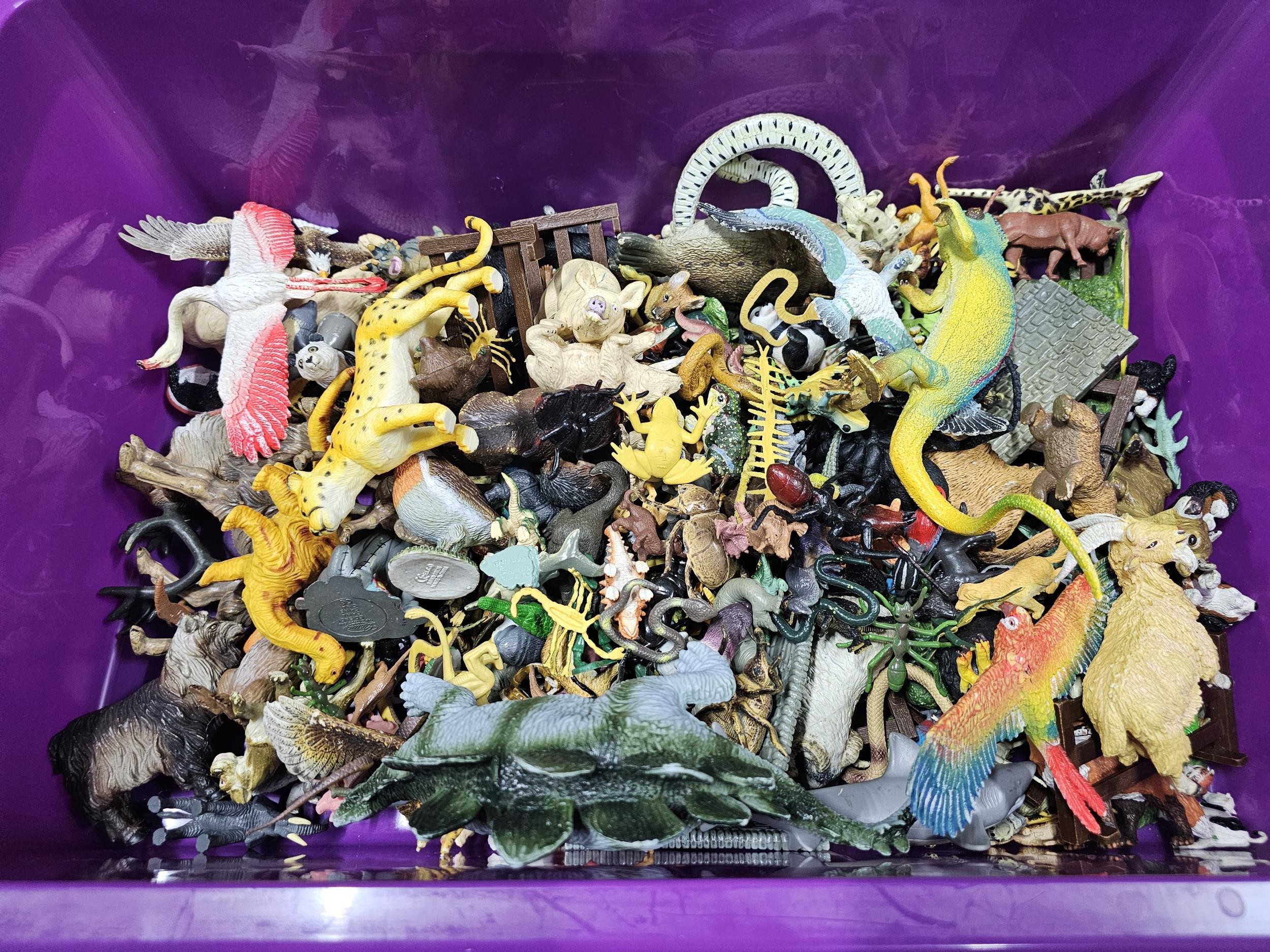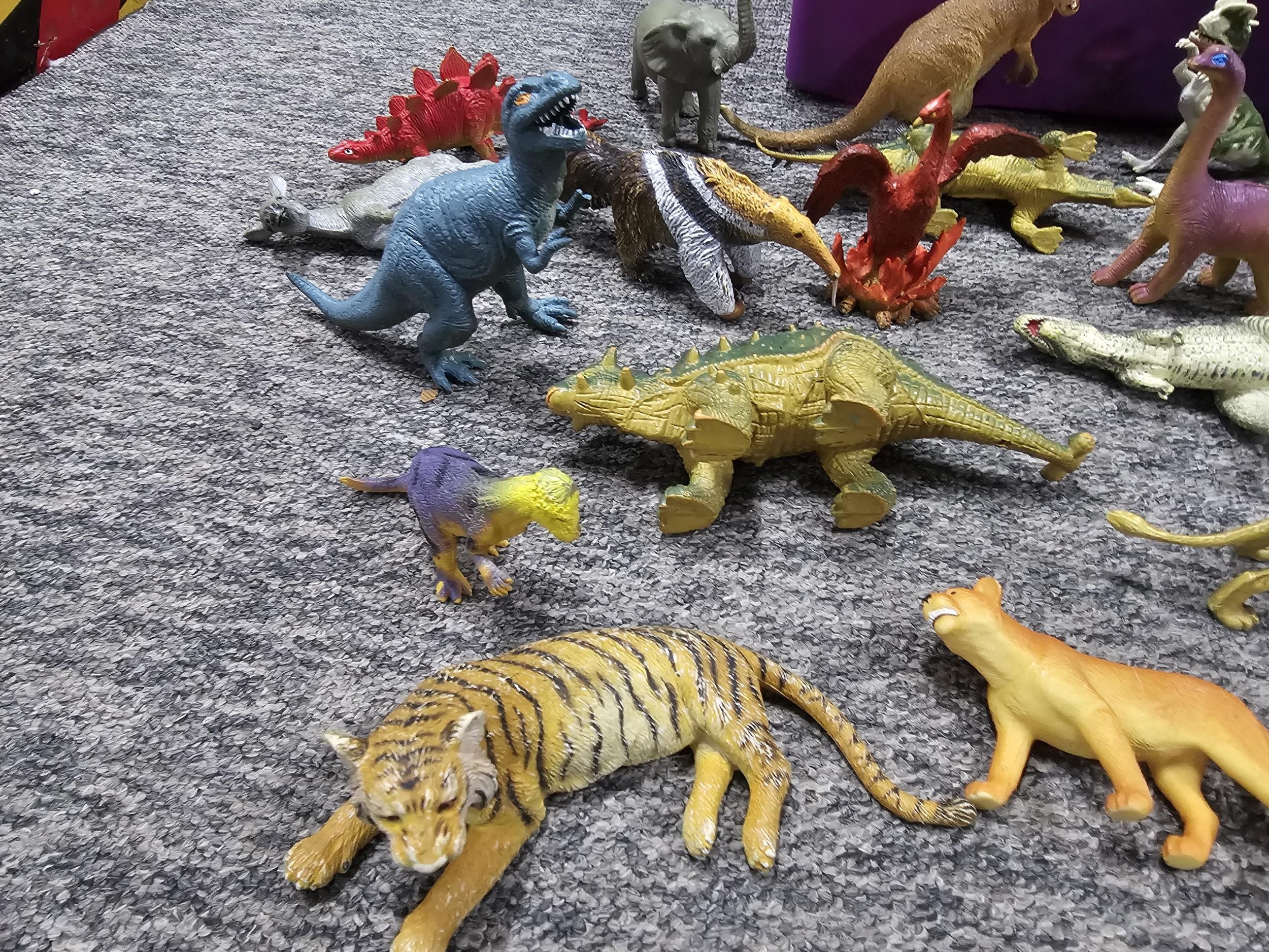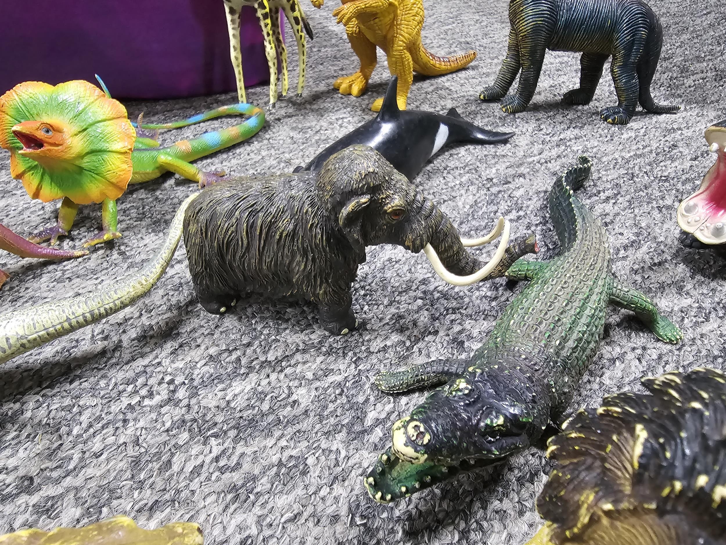 Collection of rubber and plastic toys in the form of dinosaurs and zoo animals to include an articulated dinosaur tigers, phoenix, crocodile etc all appear to be in good order and colourful