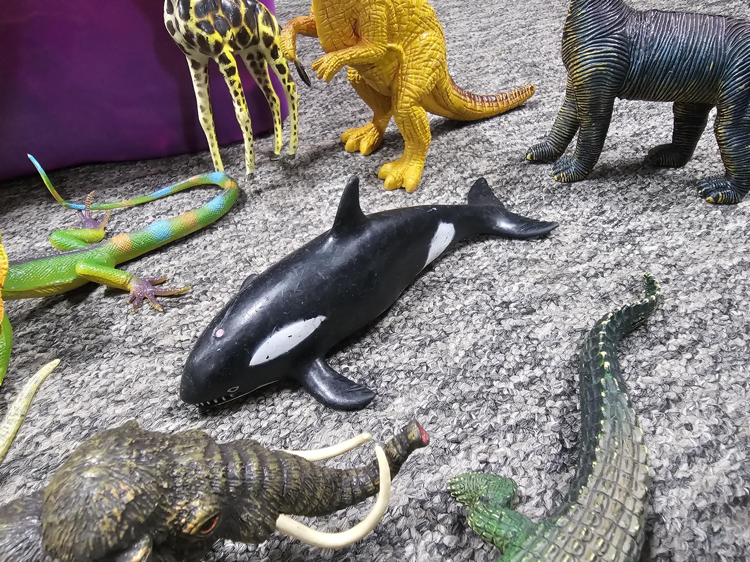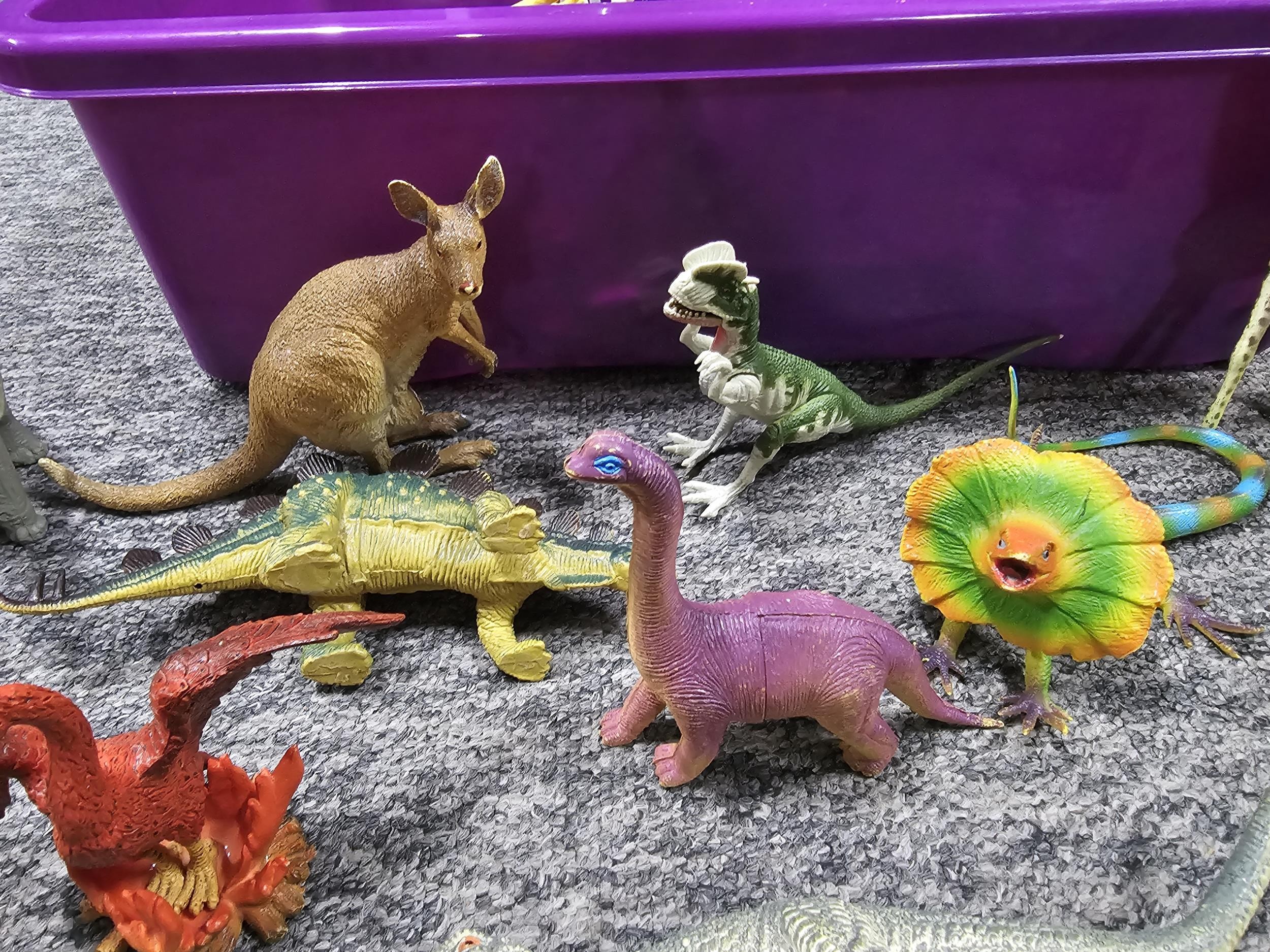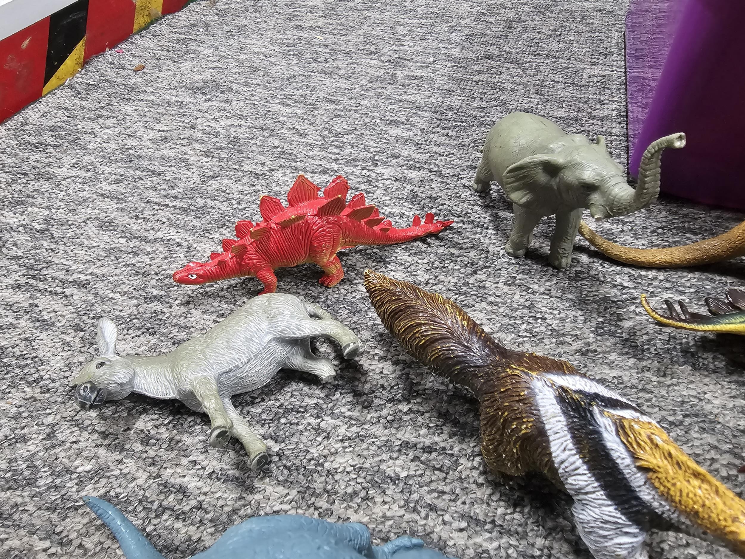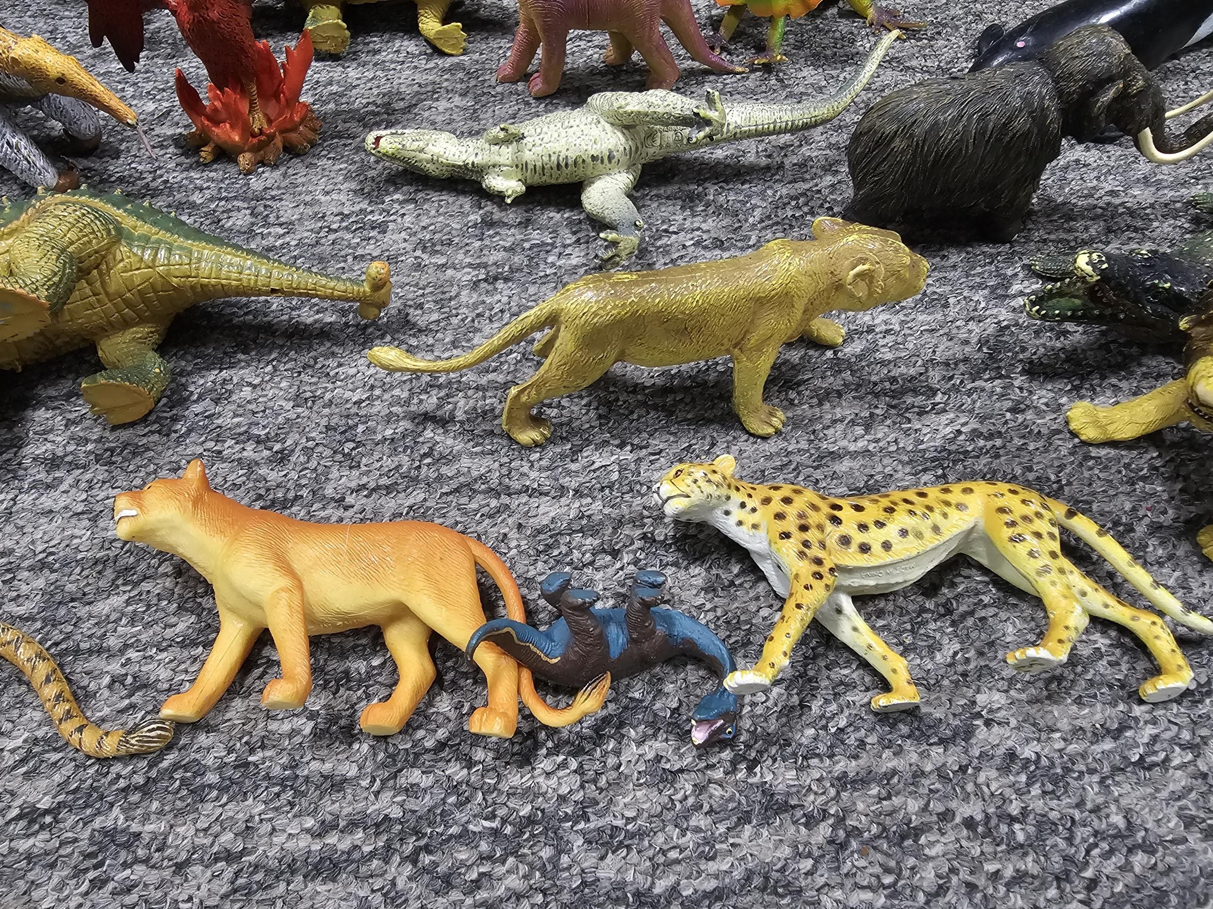 Collection of rubber and plastic toys in the form of dinosaurs and zoo animals to include an articulated dinosaur tigers, phoenix, crocodile etc all appear to be in good order and colourful