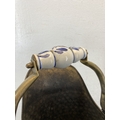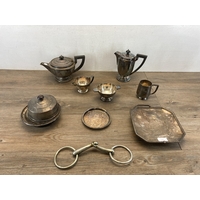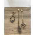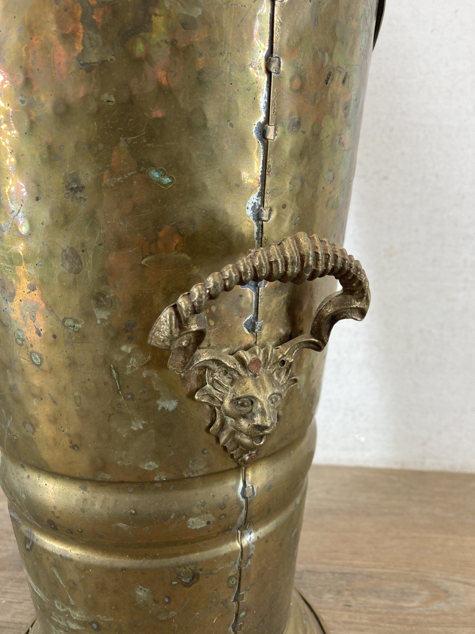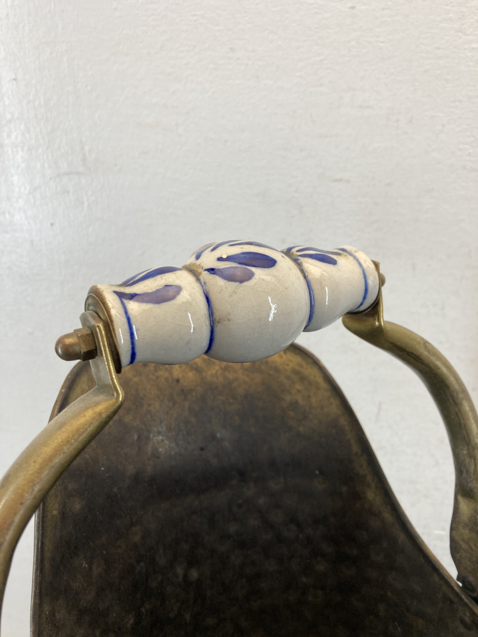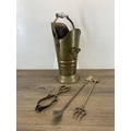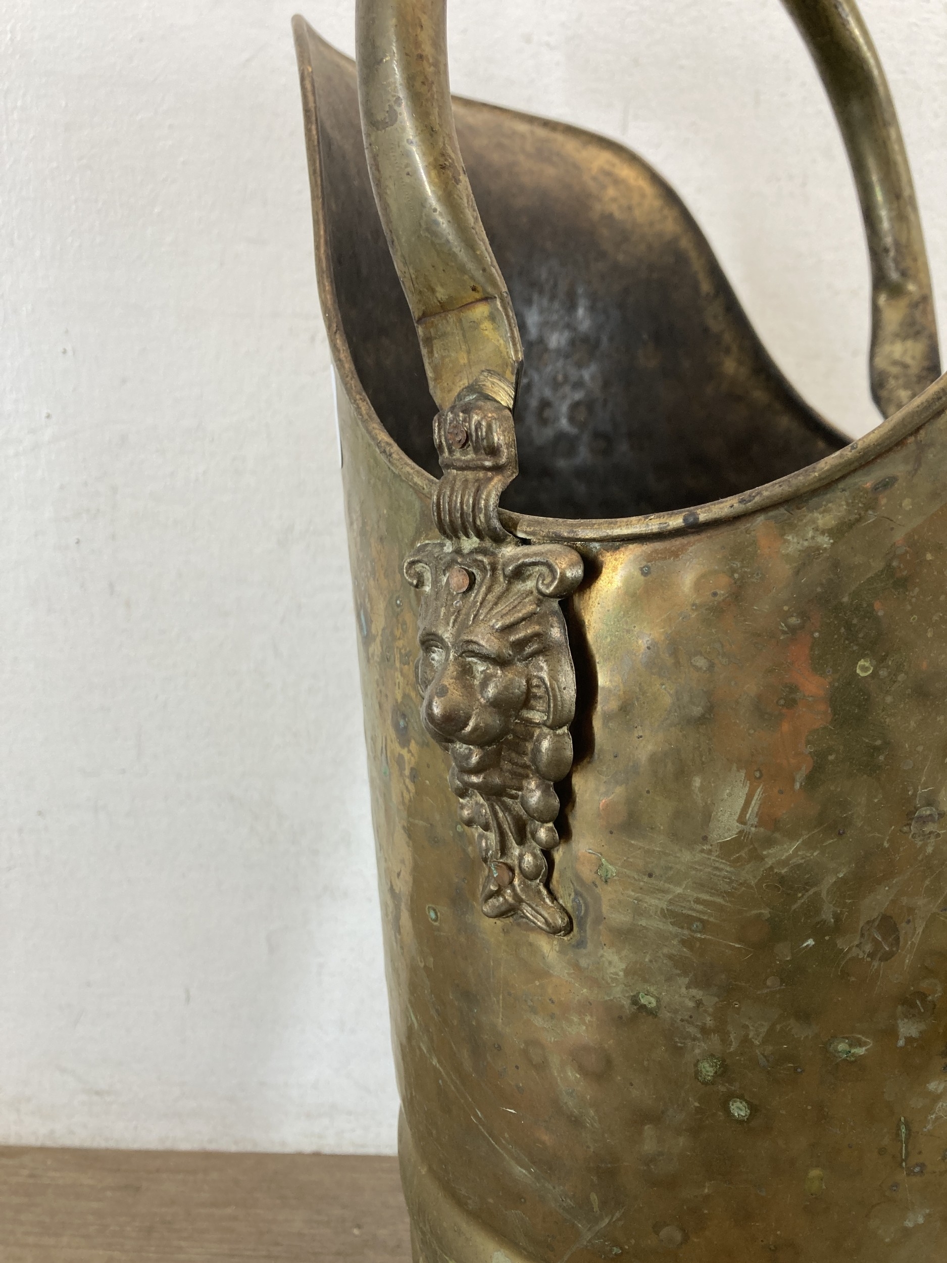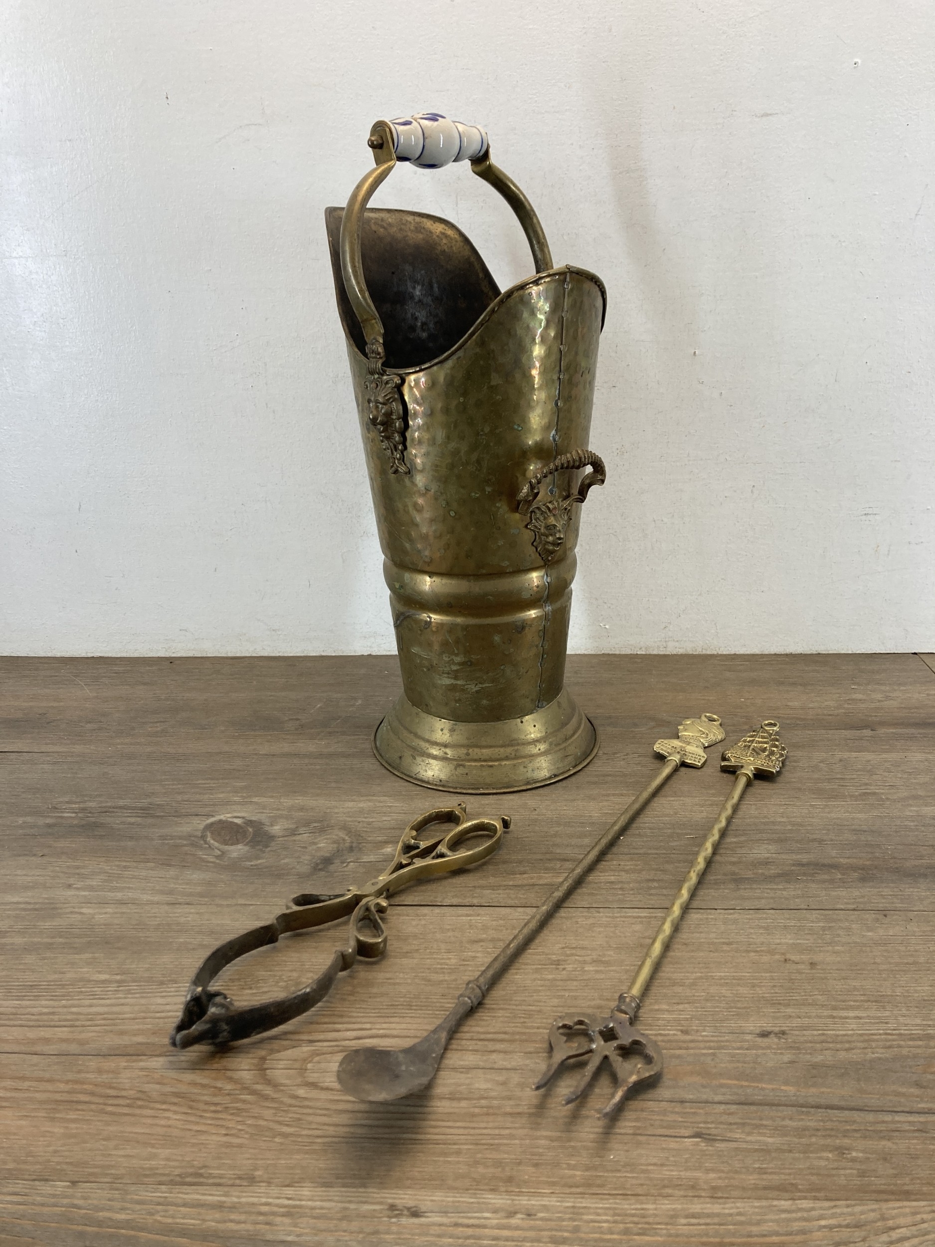 A hammered brass coal scuttle with ceramic handle and three fireside accessories