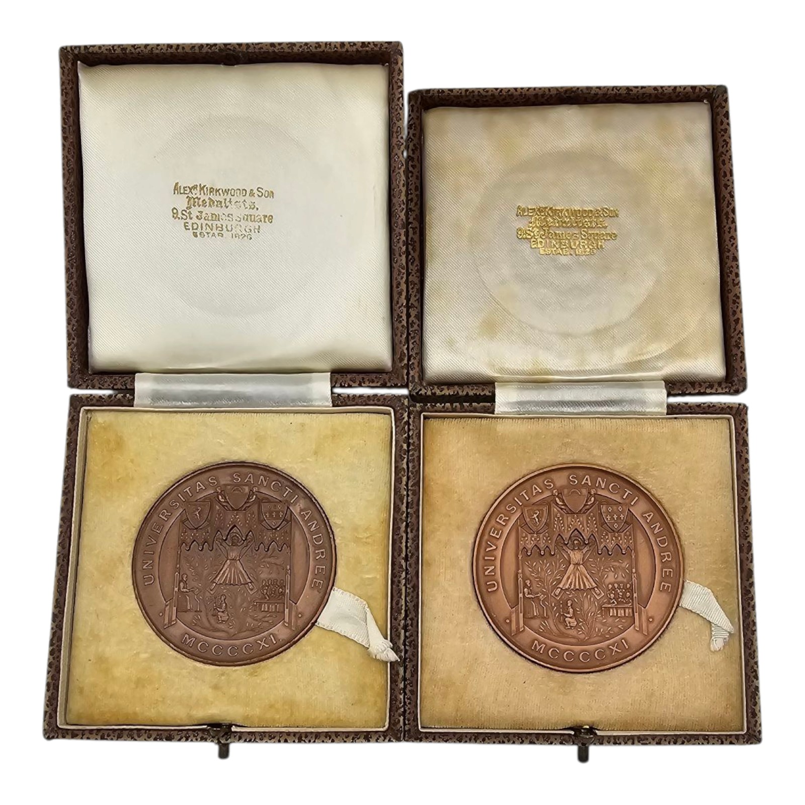 A PAIR OF ST. ANDREWS UNIVERSITY COMMEMORATIVE BRONZE MEDALLIONS